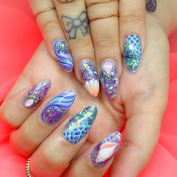 Toujours au printemps 2026, une autre idée pertinente de la décoration des ongles est le verre brisé. En utilisant cet élément de décoration pour les ongles, vous pouvez également réaliser diverses formes géométriques de toutes les couleurs.