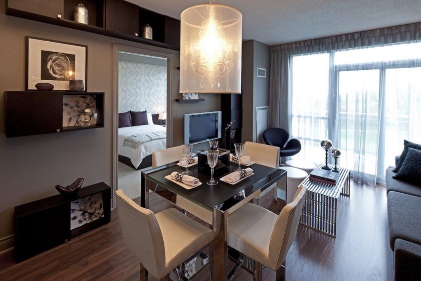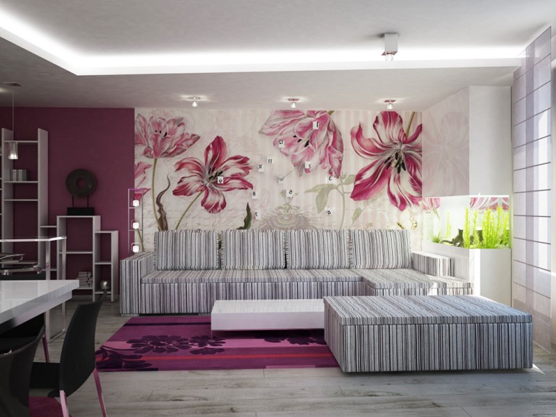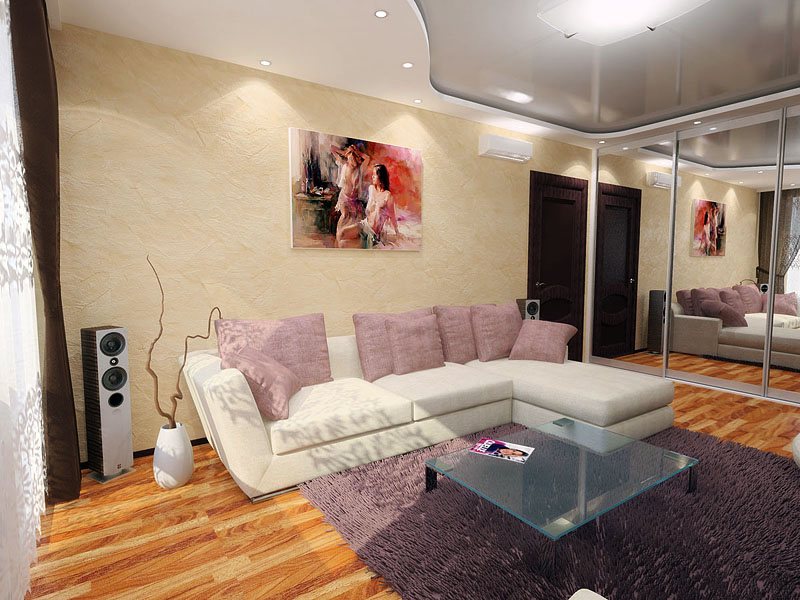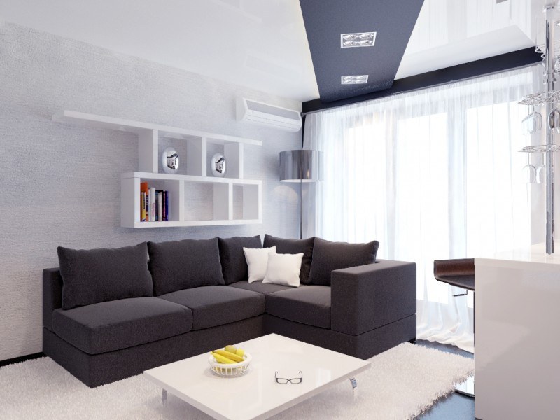 Ici, vous pouvez déjà penser à un zonage rationnel pour rendre la pièce aussi fonctionnelle que possible. Pour ce faire, utilisez des cloisons, des niches à air, des surfaces en verre ou en miroir.