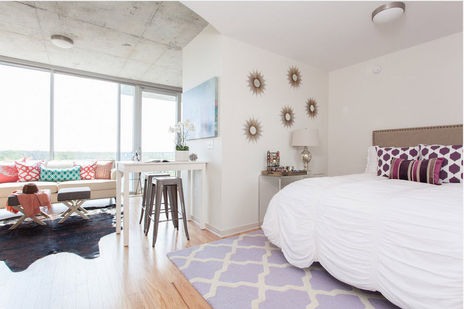 Lorsque vous organisez un appartement dans ce cas, vous devez faire attention au fait qu'aucun coin ne reste vide. Cependant, placer tous les objets le long d'un des murs n'est également pas une option. Quelle que soit la zone de la maison, le système de stockage est avant tout pensé. Cela peut être un podium équipé où un lit ou une table est installé sur le dessus, et où la literie ou d’autres accessoires sont cachés.