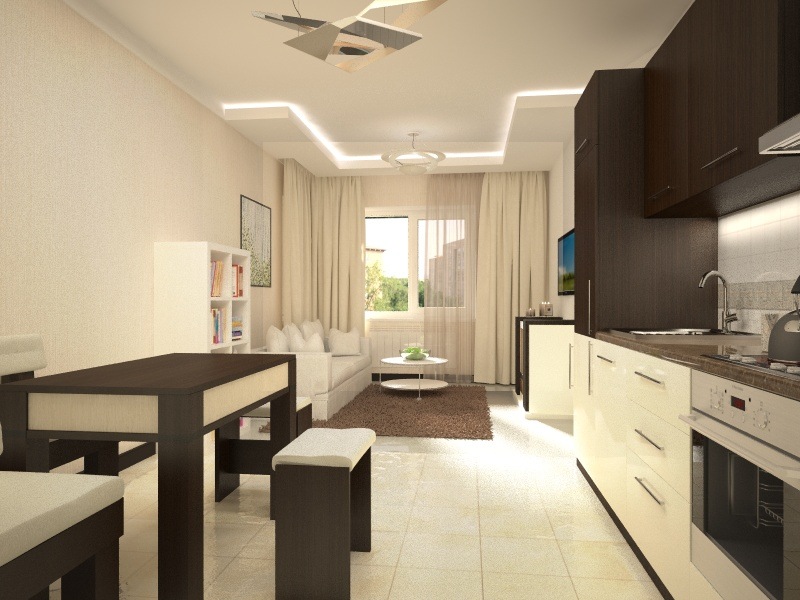 Pour un si petit appartement, vous devez choisir des teintes claires et chaudes qui rendront la maison agréable et confortable. Le style idéal est le minimalisme.