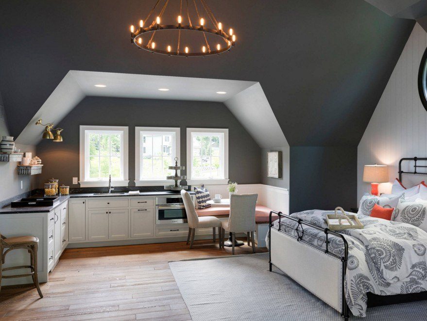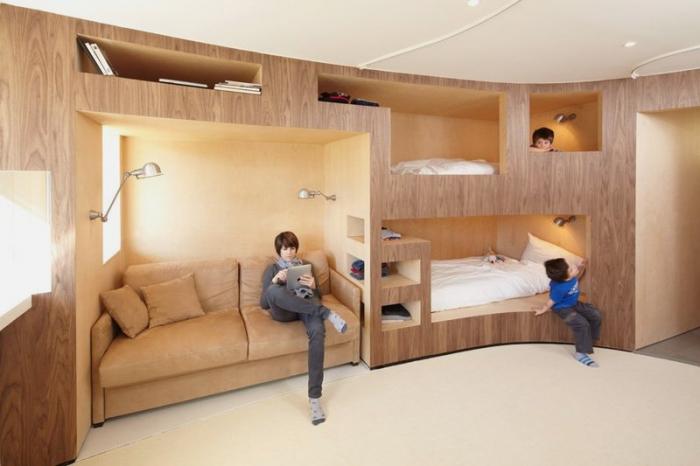 Dans une famille avec un enfant, un lit mansardé peut être équipé. Idéalement, s'il existe des mécanismes avec une armoire intégrée ou une table coulissante. Ainsi, vous pourrez équiper votre bébé de son propre coin, qui ne prendra pas beaucoup de place.
