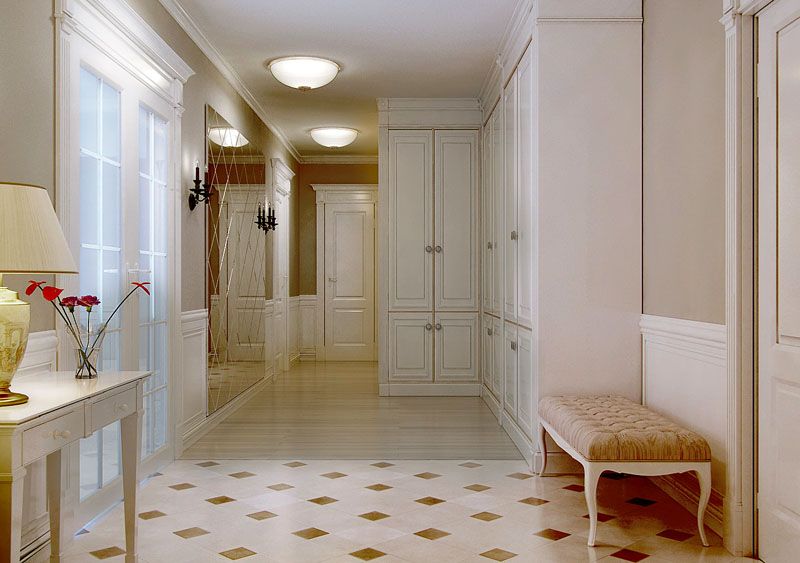 Dans les petits couloirs pour augmenter l'espace, il est nécessaire d'utiliser des matériaux brillants. Dans les pièces spacieuses, les surfaces mates sont préférables.Pour créer une impression d'espace et agrandir la pièce, les murs doivent être plus clairs que les sols et plus foncés que le plafond.