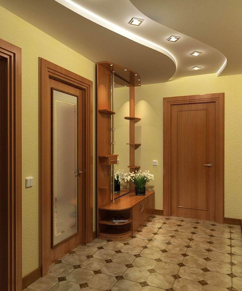 Le choix de l'éclairage dans le couloir dépend de la décoration du plafond. Le système d'éclairage intégré est idéal pour un faux plafond. Le couloir devrait être lumineux. Avec une taille modeste de la pièce, les plafonniers encombrants ne fonctionneront pas.