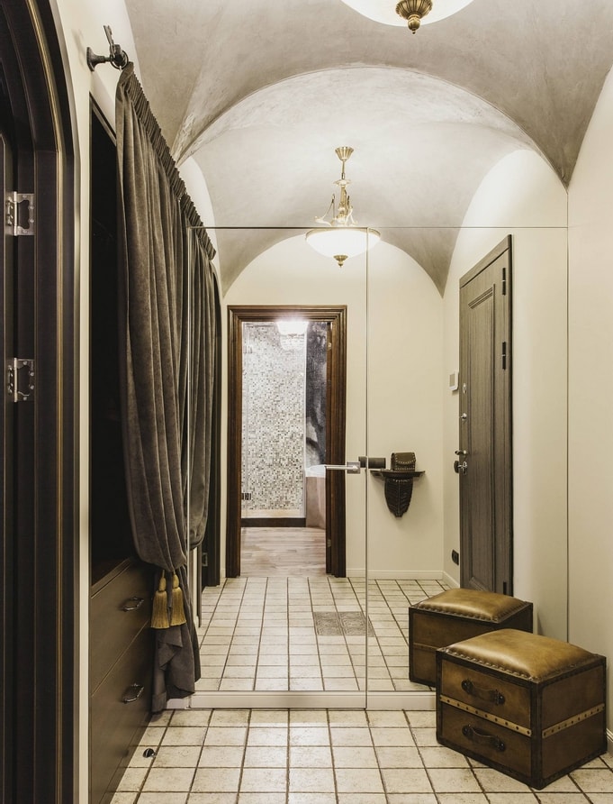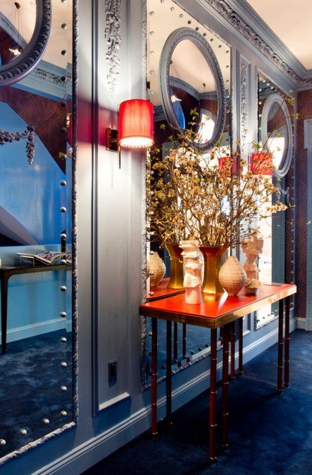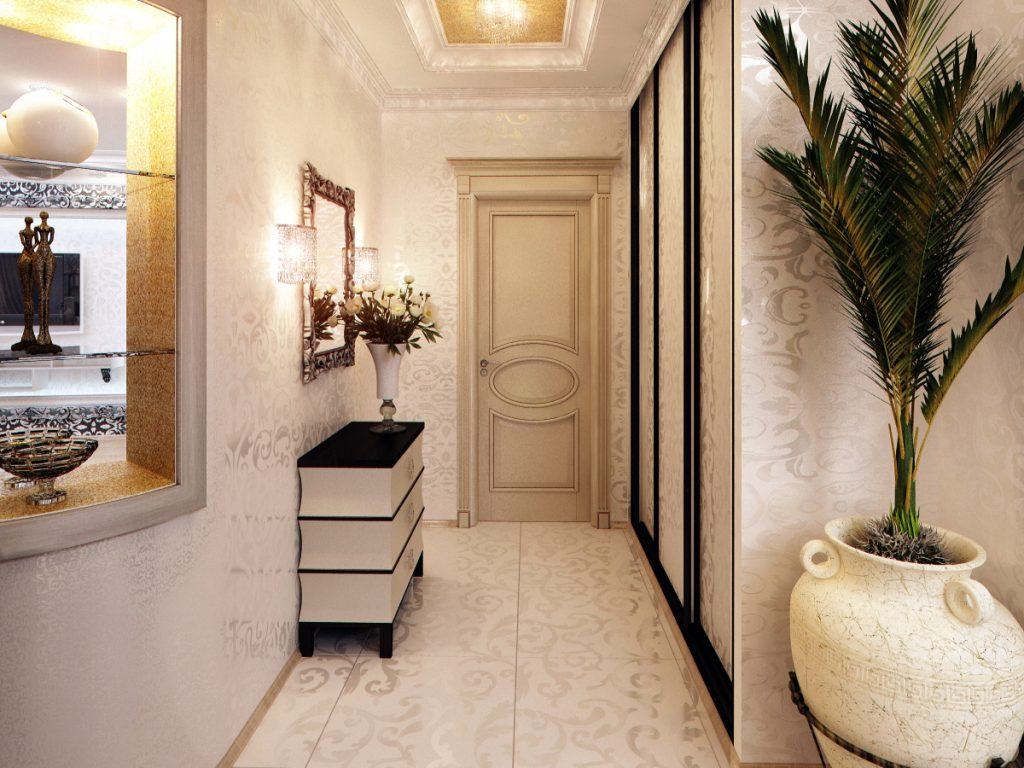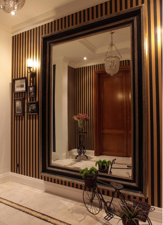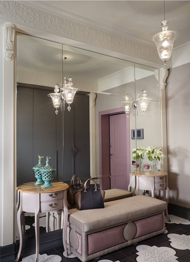 La conception du miroir est plutôt impressionnante à l'intérieur - les panneaux du miroir décorant le tableau sont montés sur les murs. Une telle décision dans la décoration des murs du couloir facilite leur entretien. Les limites des idées ne sont pas ici. Vous pouvez combiner la décoration avec de la peinture et de petites tuiles.