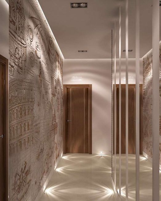 Les caractéristiques principales lors du choix des murs du couloir ou du couloir sont la fonctionnalité et la beauté. Le couloir est mieux conçu dans des couleurs vives. Ils agrandissent un petit espace, sont universels et remplissent la pièce de lumière. Il est bon de créer un contraste dans l'arrière-plan général avec la porte d'entrée et les entrées de pièces adjacentes, ainsi que de combiner des motifs et des couleurs similaires.