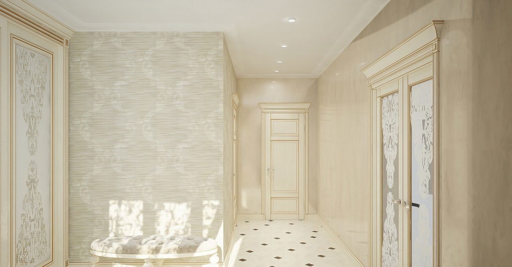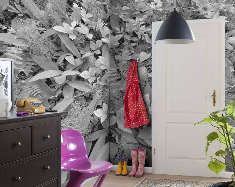 Papier peint liquide. C'est l'option la plus pratique pour le hall d'entrée. Il y a beaucoup de jambages, d'ouvertures et de coins dans cette pièce. En cas de dommage sur une partie du papier peint, celui-ci peut être facilement remplacé.