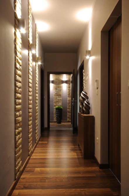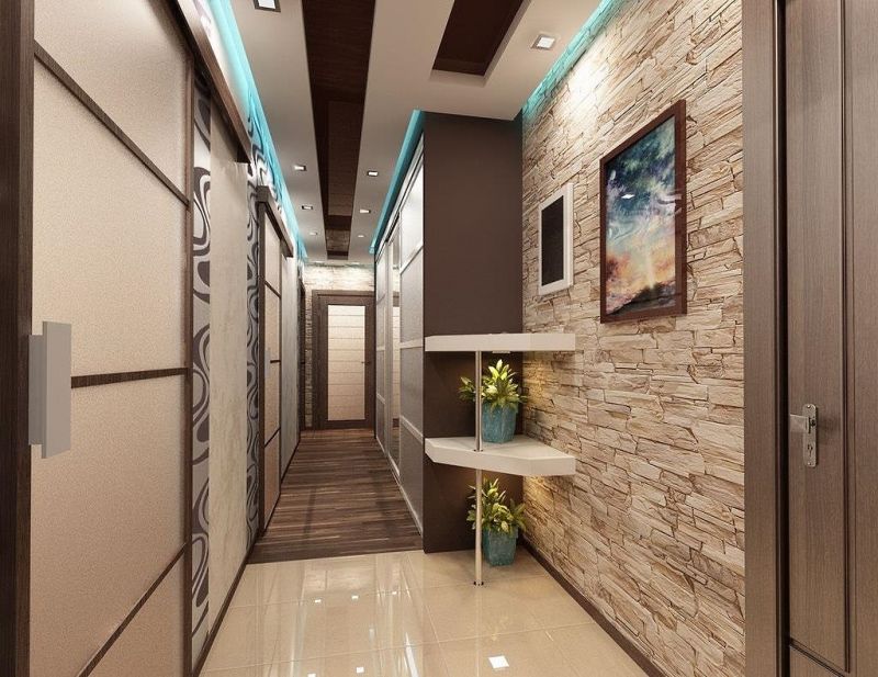 Les murs dans le couloir ou le couloir peuvent être finis avec de la pierre, du plâtre décoratif, du papier peint, des panneaux muraux, décorés sous forme de maçonnerie ou en utilisant une combinaison de ces matériaux.