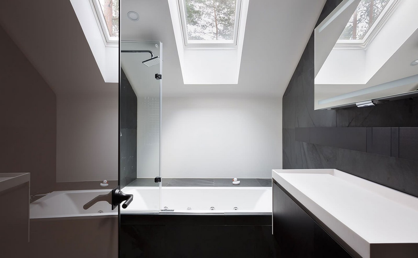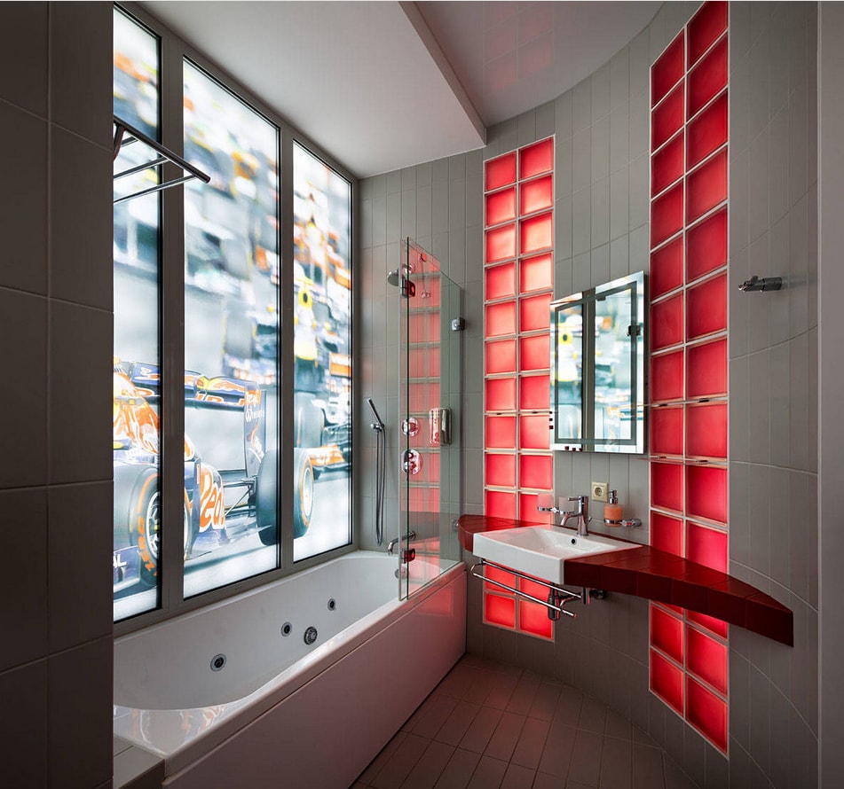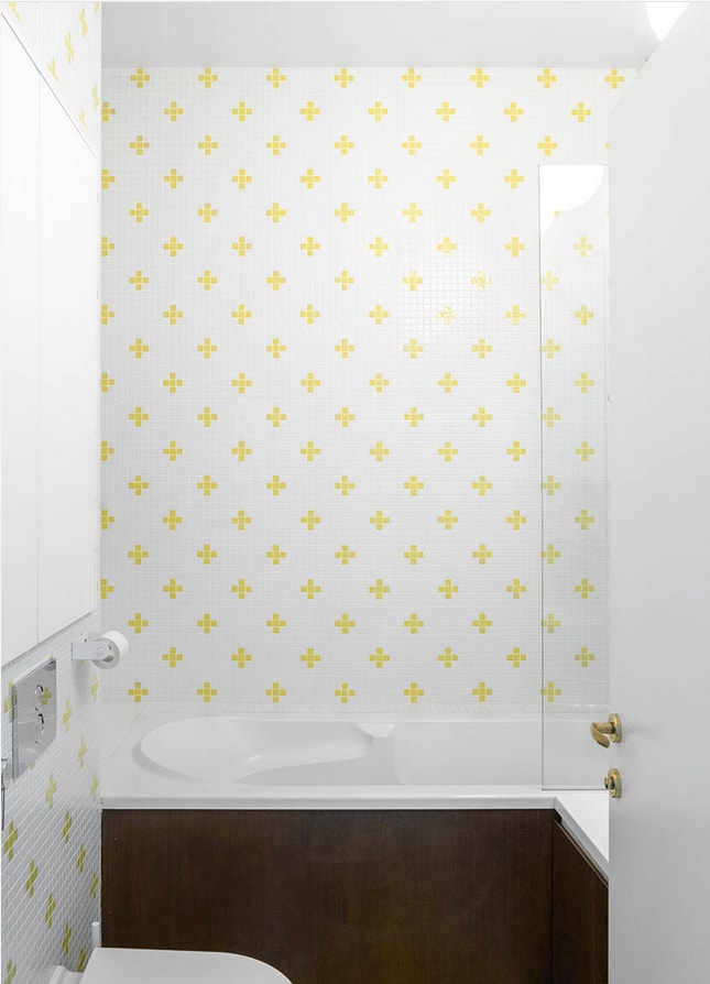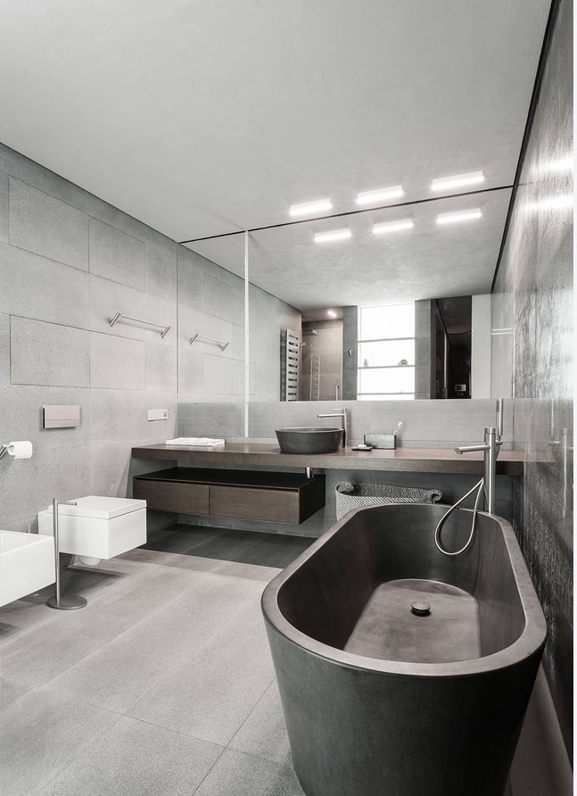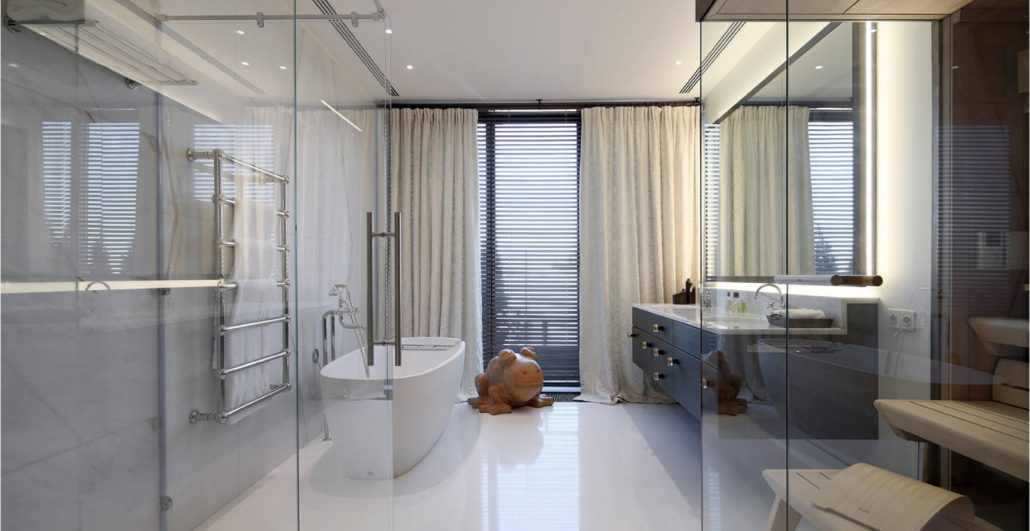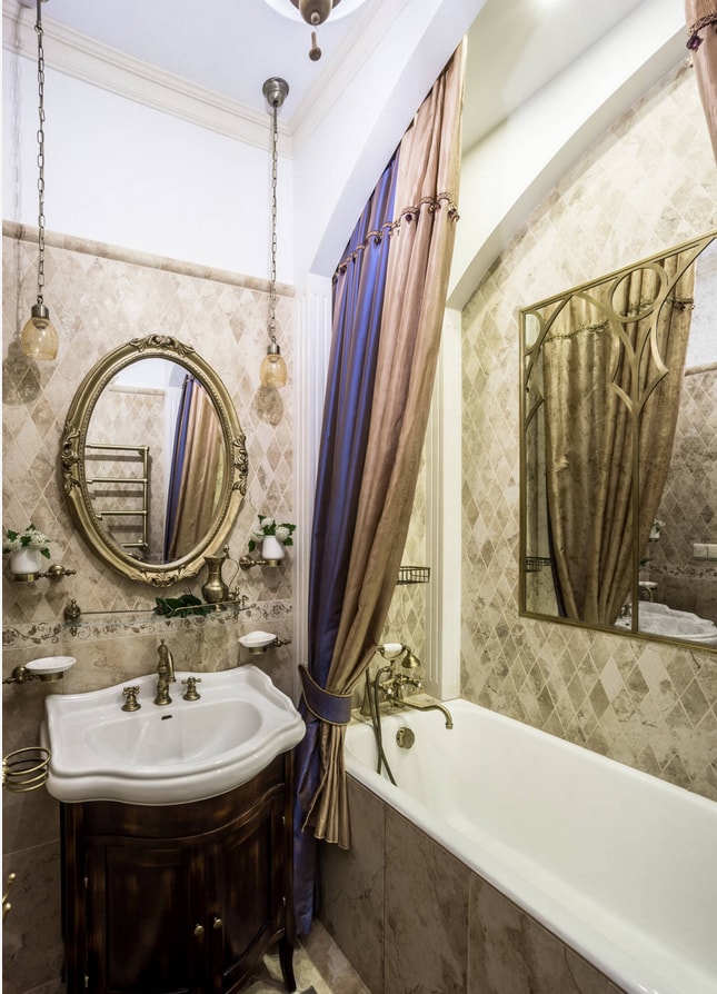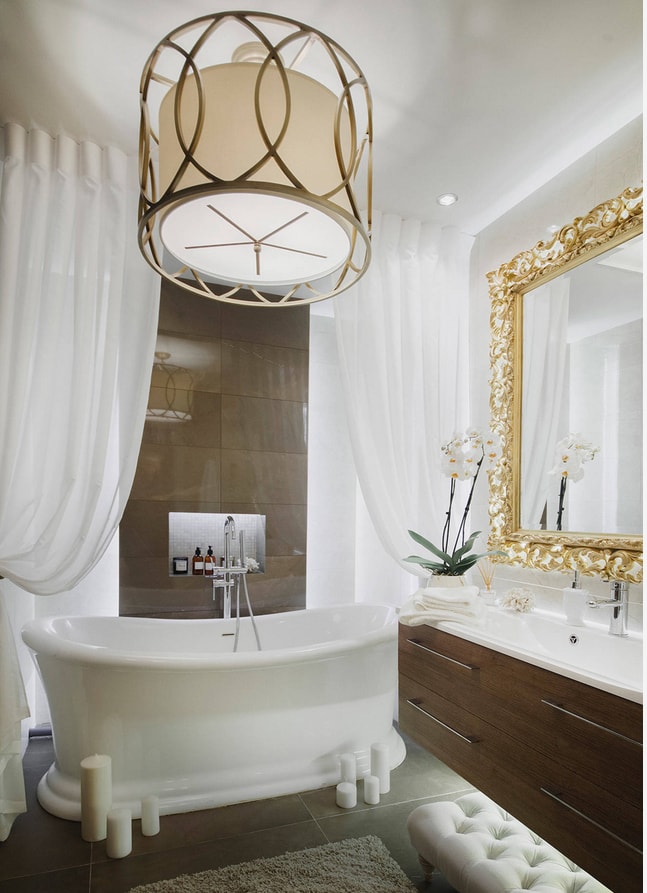 - Un podium en demi-cercle est créé autour de la salle de bain et l’espace réduit qui en résulte est compensé par un grand miroir. Cette conception est également appelée "pas de coins".