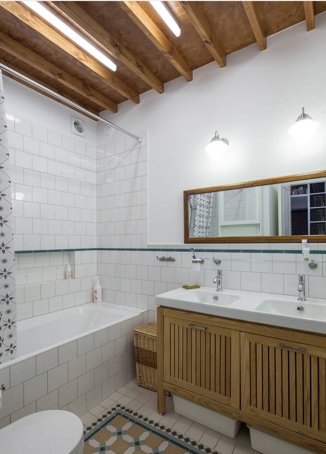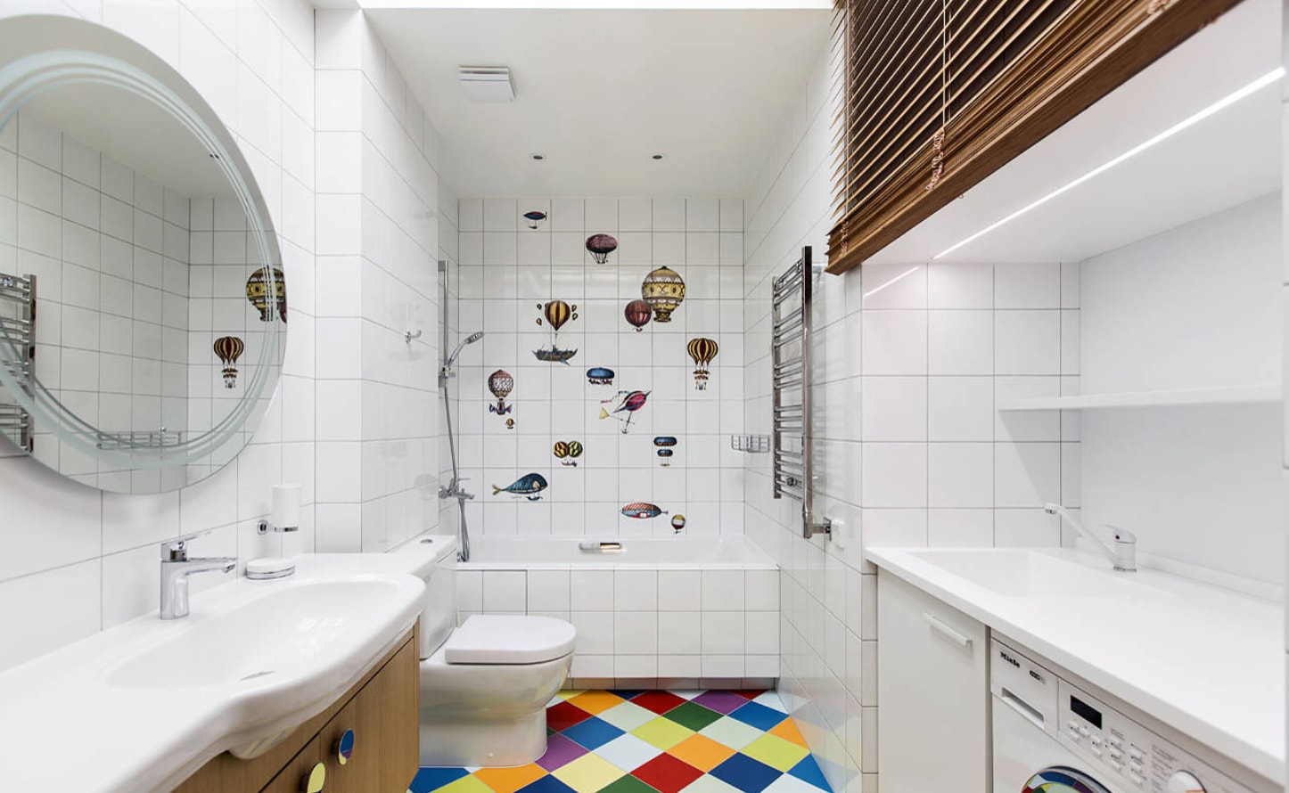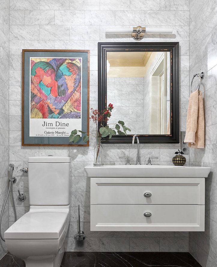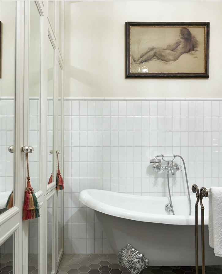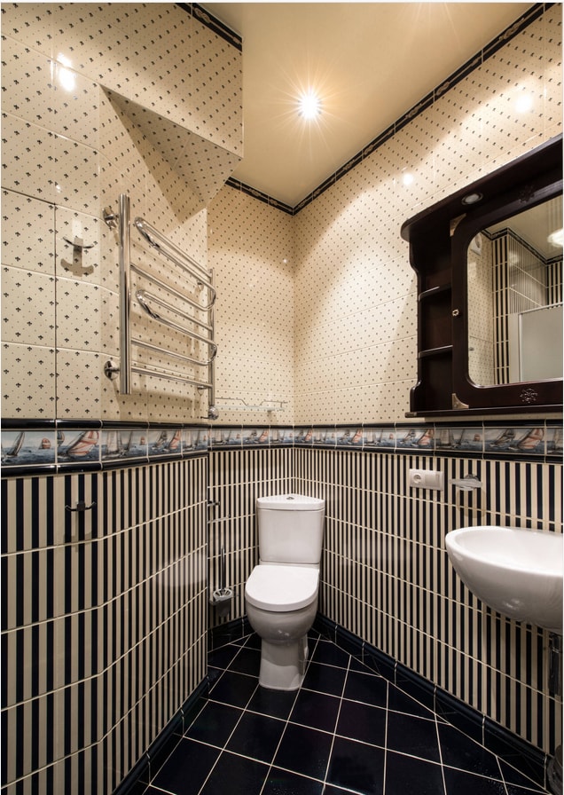Avec la méthode établie - la partie inférieure de la salle de bain est aménagée avec des carreaux sombres, et la partie supérieure est claire, divise l’espace. Et une personne tente inconsciemment de combiner ces moitiés.