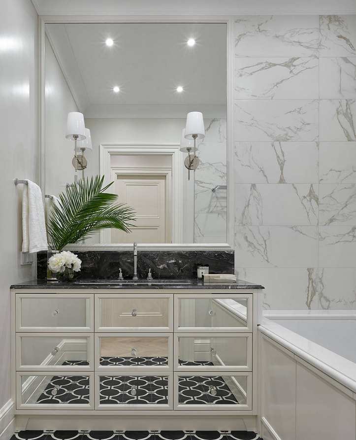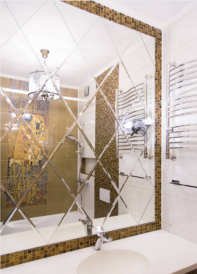 Le miroir dans la salle de bain est le mieux accroché à plat, en pleine croissance. Vous pouvez même refléter le mur entier. Cela augmentera visuellement le volume de la pièce, mais engendrera des problèmes supplémentaires - le frottement constant des miroirs.