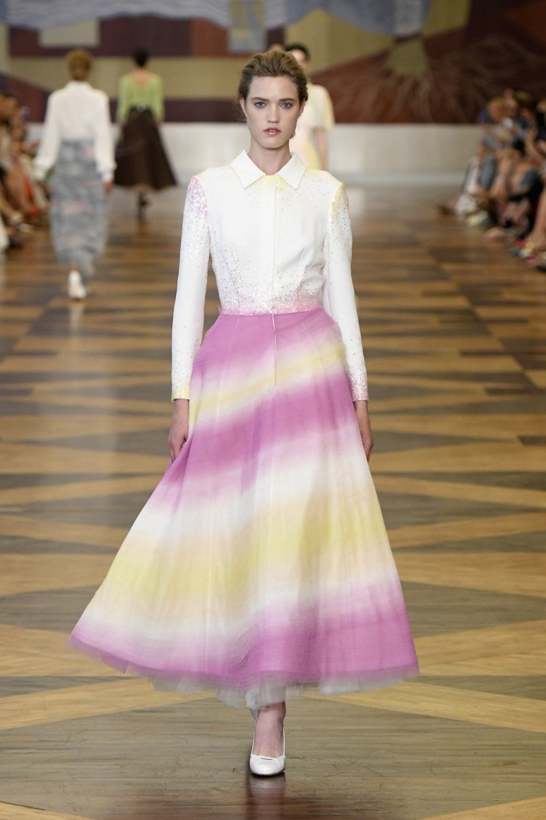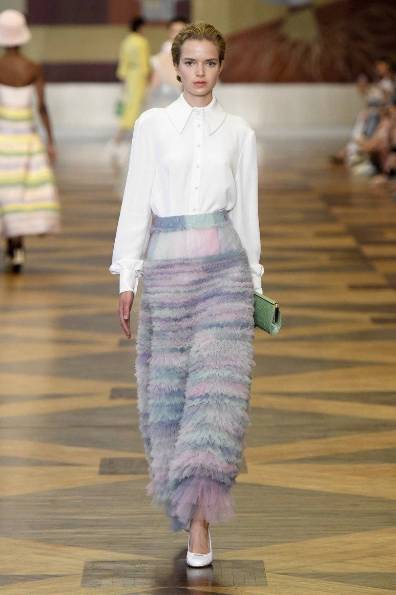 La coupe la plus en vogue de cette année est un triangle évasé. Le style volumineux et magnifique nous plonge dans le passé et s’adapte subtilement à la mode d’aujourd’hui. Il est plus efficace de combiner une jupe moelleuse avec un chemisier en coton exquis. Les basques féminines modestes dans cette tenue ne feront pas mal. En ce qui concerne la palette de couleurs des jupes A-silhouette, cette année, les designers conseillent de rechercher des nuances plus sombres et plus sobres: indigo, noir, bleu encre. Pour la version bureautique, vous pouvez choisir des jupes légères en laine beige ou en cuir blanc comme neige.