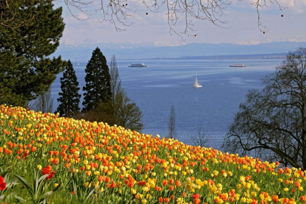 Sur le lac de Constance, une île incroyablement belle de fleurs est située, où une collection de plantes tropicales et subtropicales est recueillie sur 110 acres. Vous pouvez arriver ici par une passerelle ou par bateau. Sur l'île, il y a un château avec une salle blanche et une belle tour de guet.