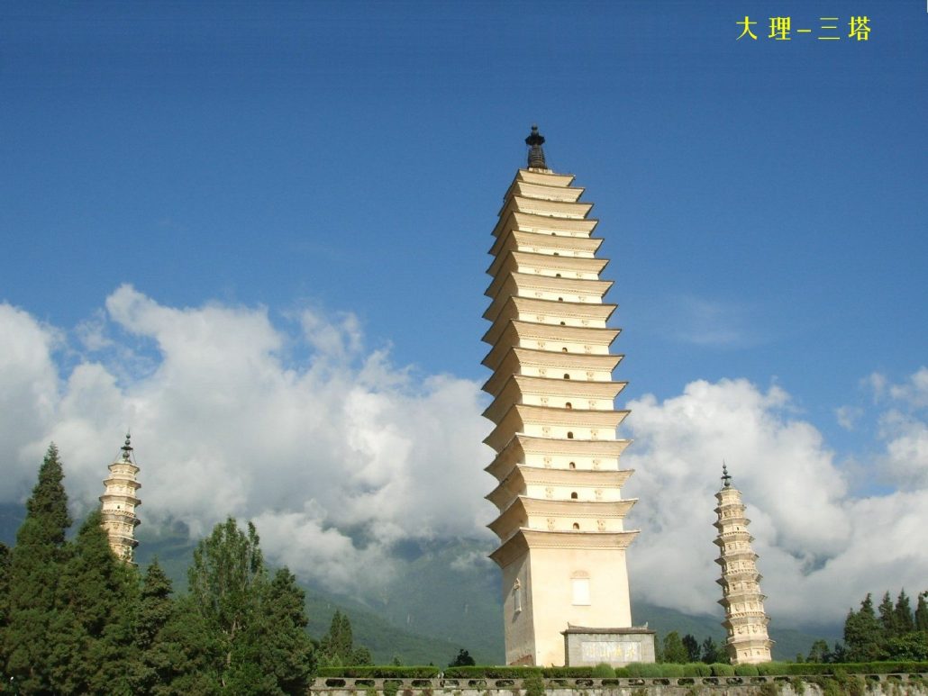 L'un des plus anciens bâtiments du sud du pays à avoir survécu à ce jour est constitué de 3 pagodes situées dans le temple de Chongshen, situées près du lac Erhai, près de la ville de Dali. Ils sont construits dans une architecture unique pour les bâtiments bouddhistes. Pour les construire, ils ont utilisé de la brique et de l'argile blanche, et à l'extérieur, ils l'ont décorée de motifs. Et les toits des bâtiments sont en cuivre.