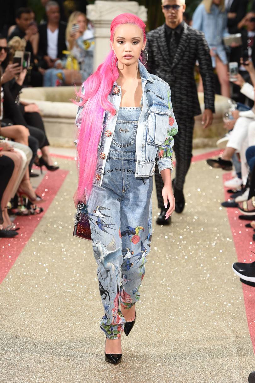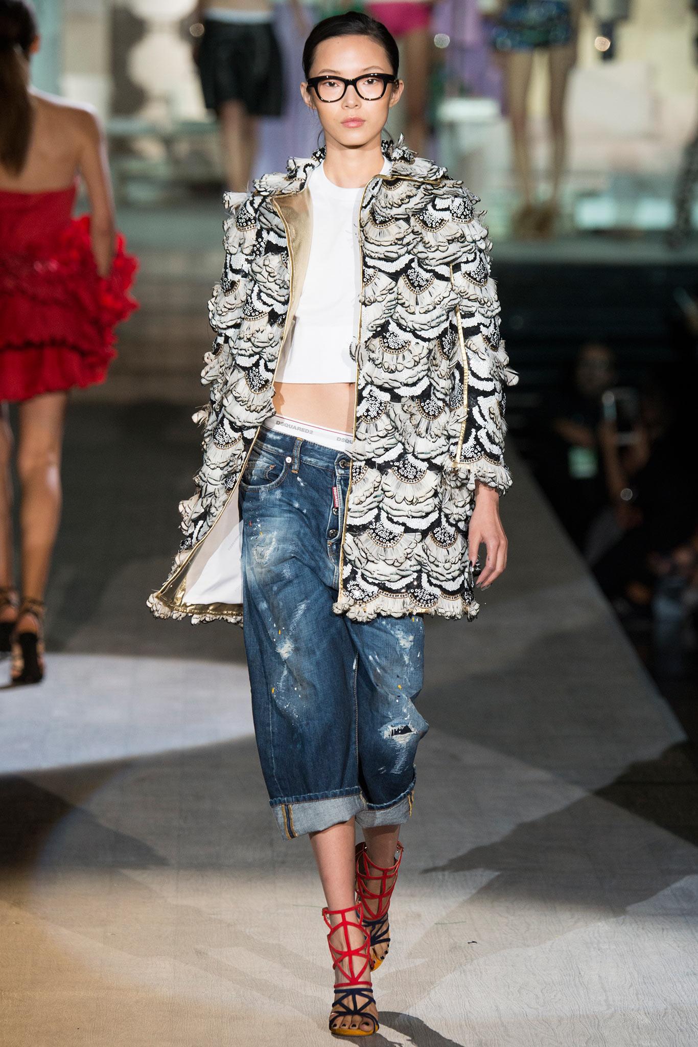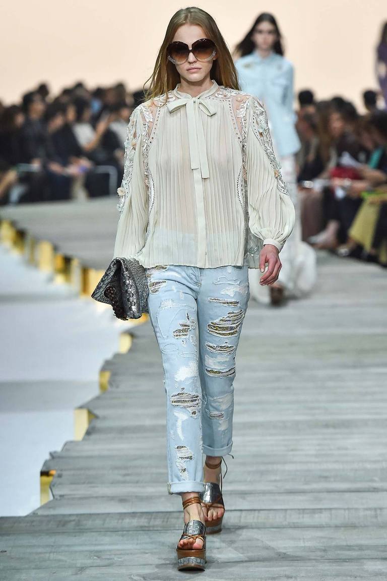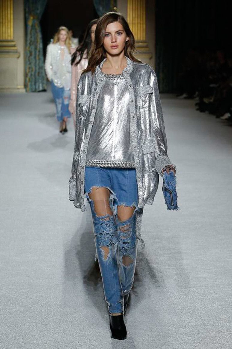 Les mannequins éraflés n'étaient pas largement représentés aux défilés de mode de cette saison, mais il est connu que certains fabricants de mode incluent cet élément dans leurs collections d'été. Si vous avez besoin de porter de tels jeans pour qu'ils cachent visuellement quelques kilos en trop ou étirent la silhouette, vous avez besoin que la bande légèrement usée soit peu large et située au centre et au milieu de vos hanches.