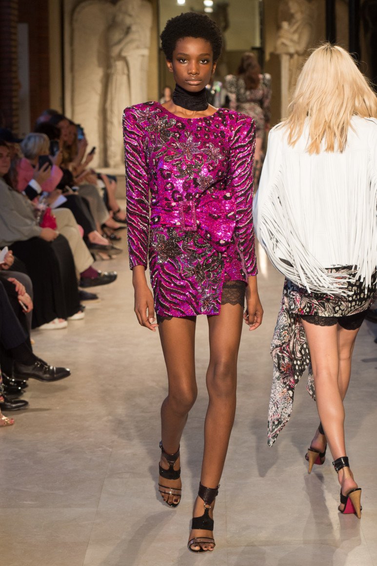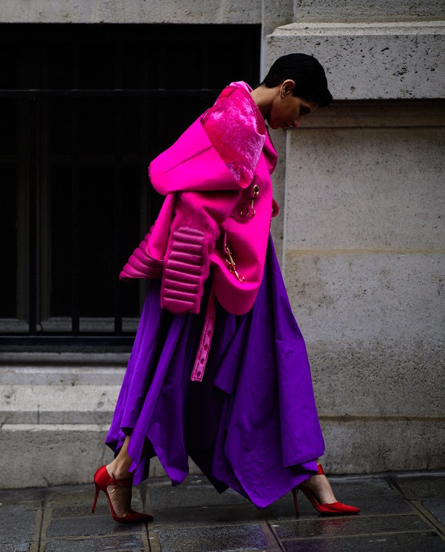 Robe pourpre en combinaison avec des teintes rose, noir, jaune et vert