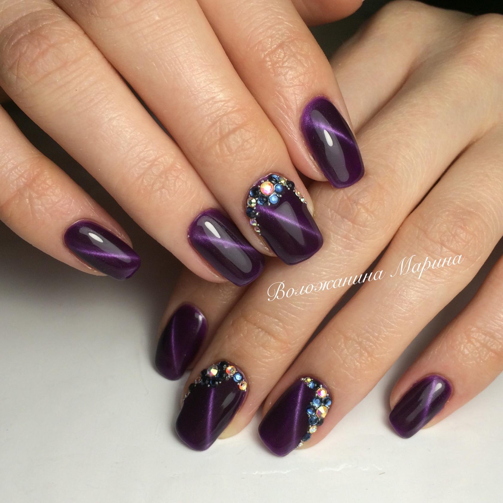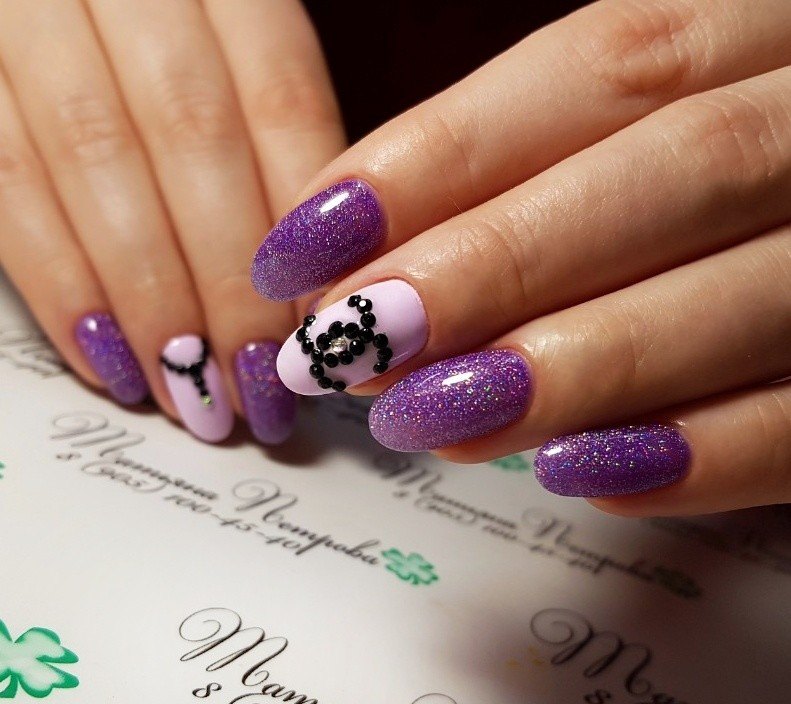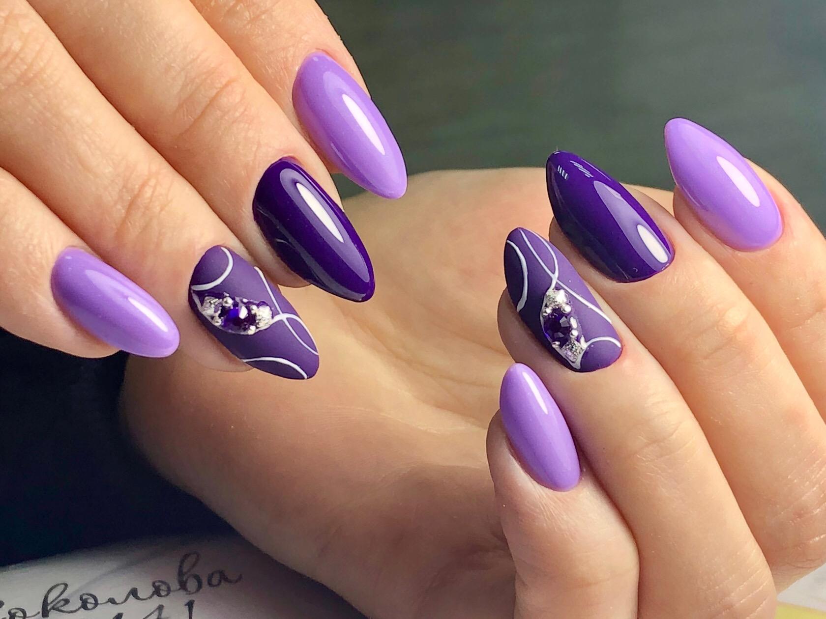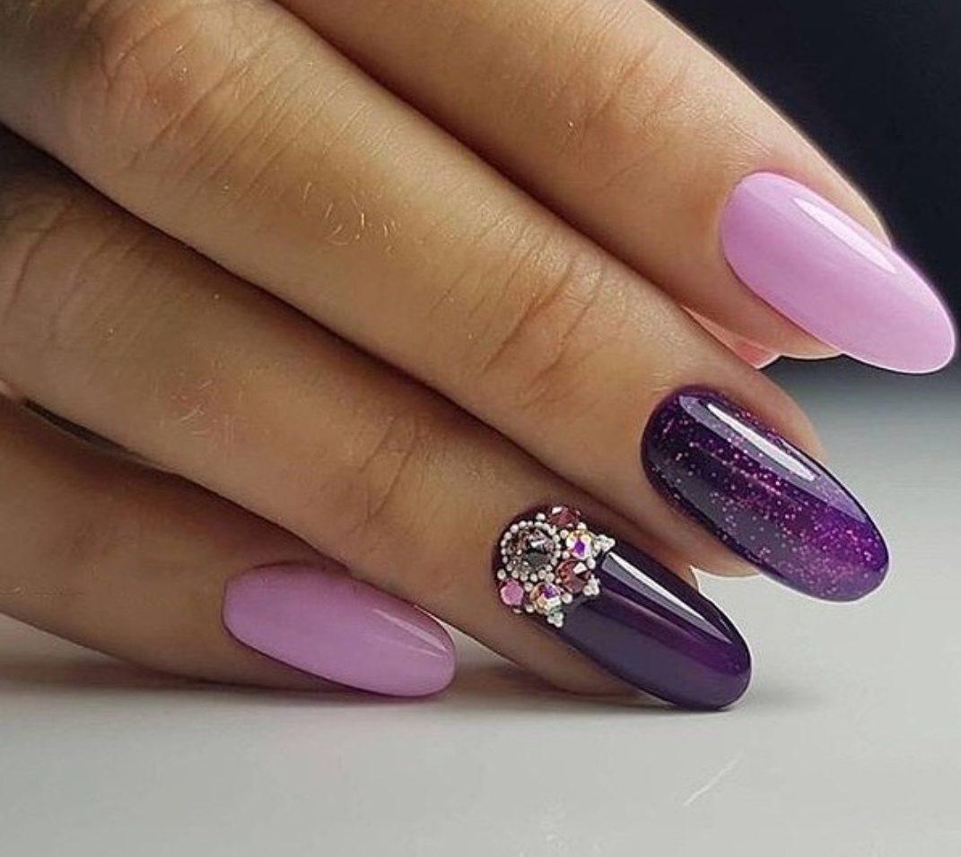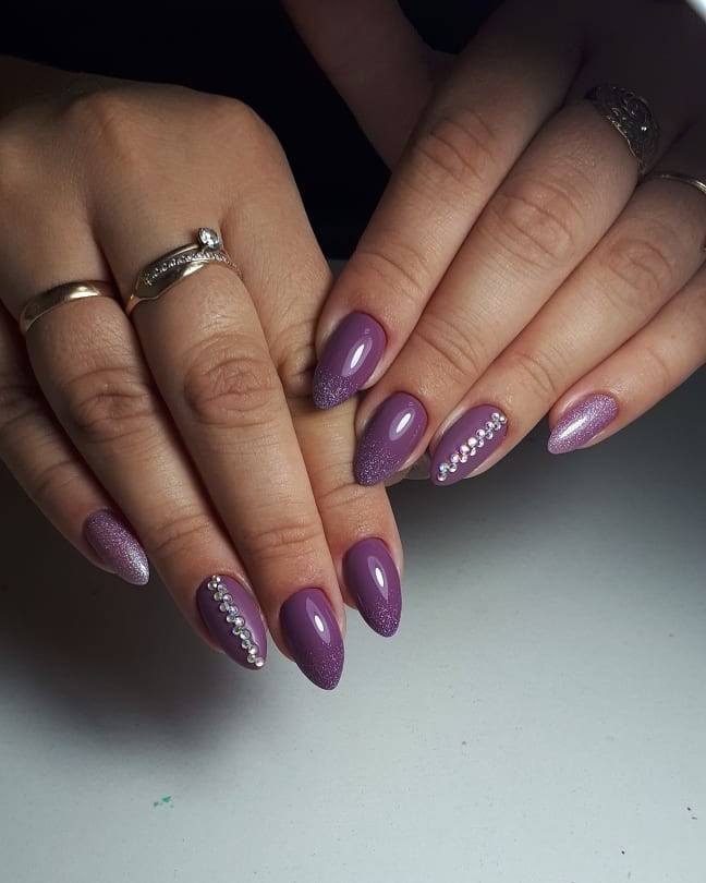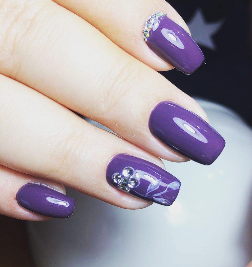 Vous pouvez compléter la manucure pourpre en utilisant la technique des strass, ce qui lui donnera une plus grande élégance. Aujourd'hui, les strass font l'objet d'une attention accrue, même s'ils restent pertinents en toute saison. Lorsque vous choisissez des pierres, choisissez des options non standard, par exemple des formes triangulaires, carrées ou polygonales. Les propriétaires de longs ongles peuvent expérimenter en toute sécurité la taille des pierres et décorer la manucure avec de gros cailloux. Les strass plus petits seront plus pertinents pour les soucis courts, afin de ne pas gâcher la vue d'ensemble avec une massivité excessive. Une combinaison de finition mate et de pierres sur fond violet est inhabituelle et à la mode. Vous pouvez accentuer la forme des plaques à ongles avec des motifs étincelants. Dans toutes les options, le duo de violettes et de strass est tout simplement magnifique.