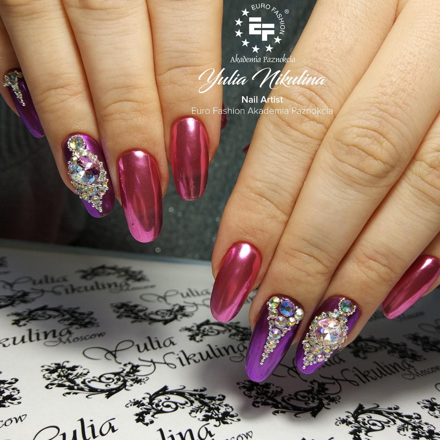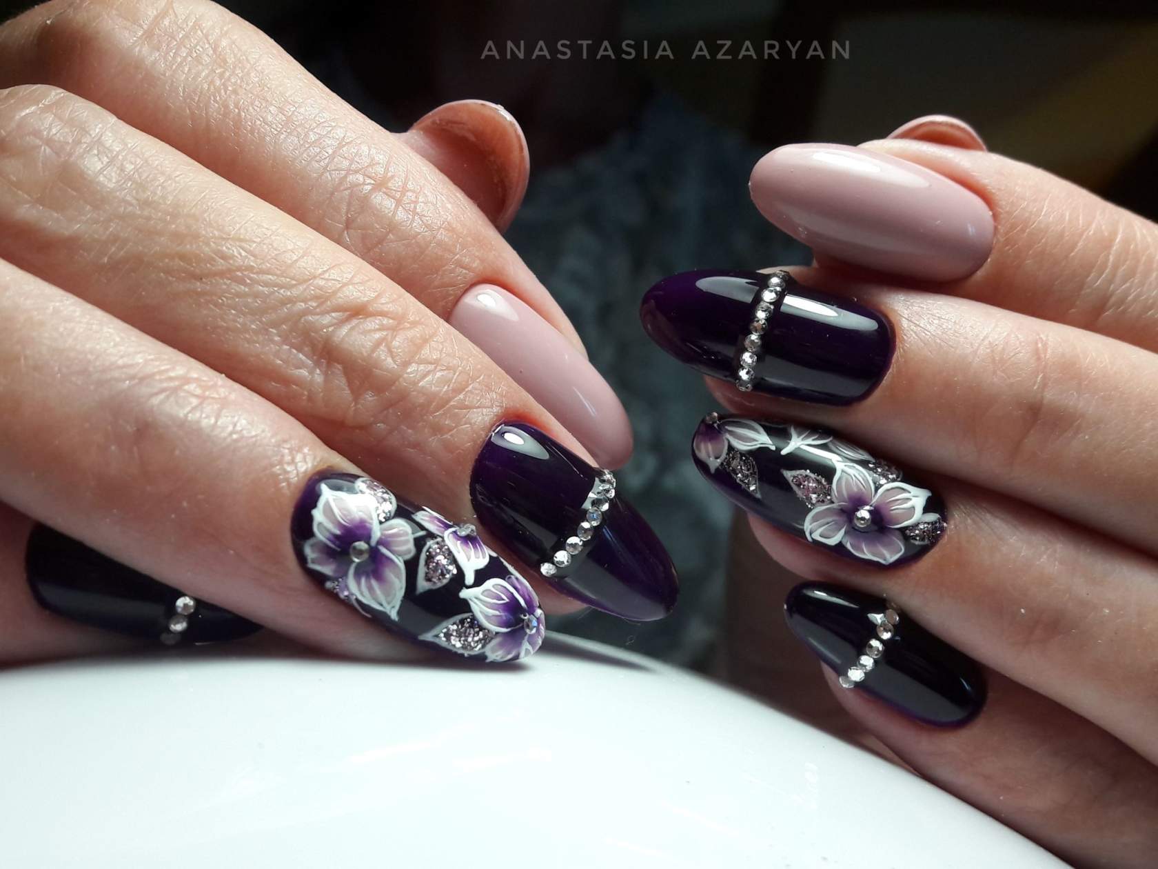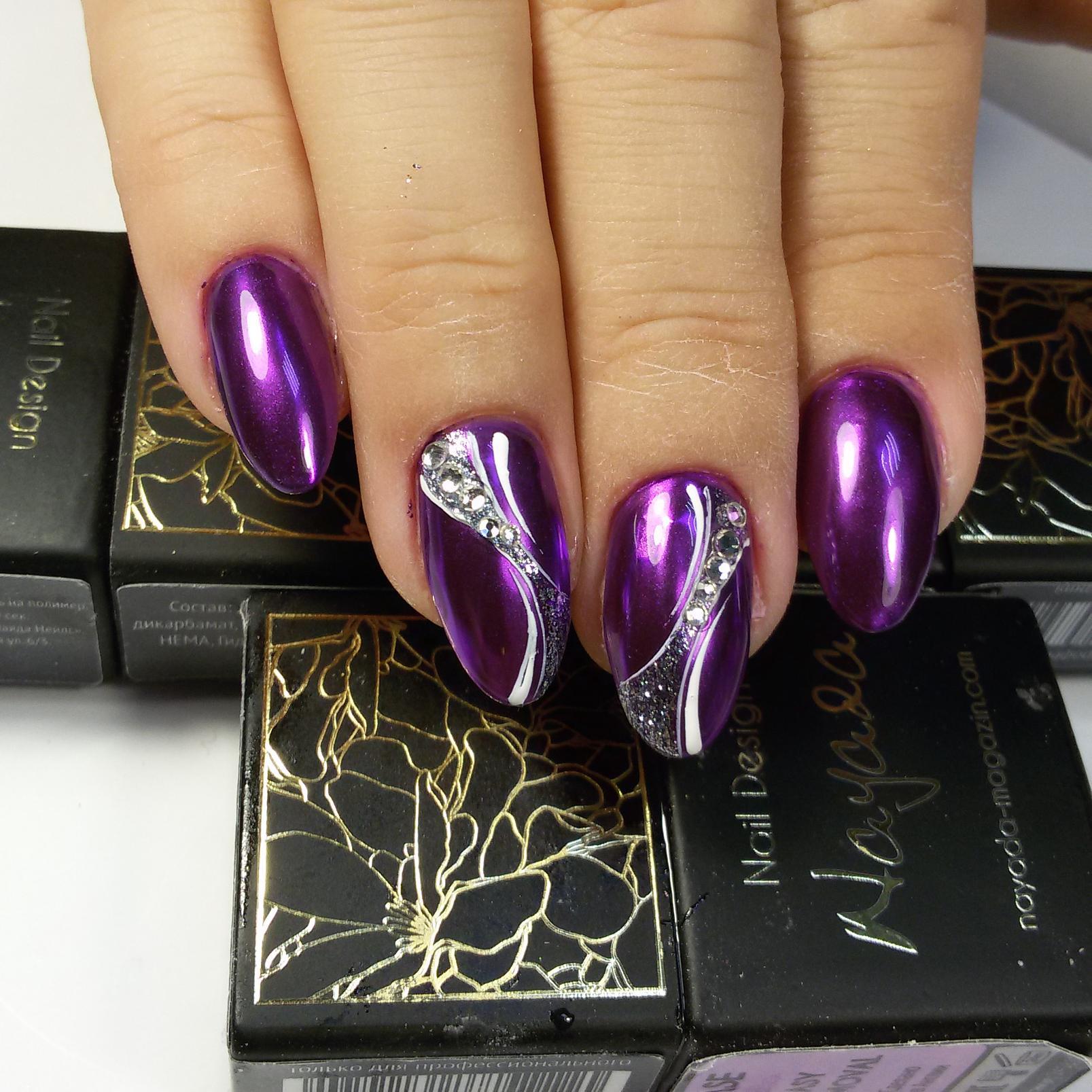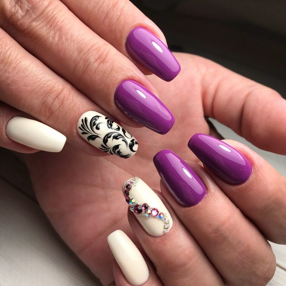Vous pouvez compléter la manucure pourpre en utilisant la technique des strass, ce qui lui donnera une plus grande élégance. Aujourd'hui, les strass font l'objet d'une attention accrue, même s'ils restent pertinents en toute saison. Lorsque vous choisissez des pierres, choisissez des options non standard, par exemple des formes triangulaires, carrées ou polygonales. Les propriétaires de longs ongles peuvent expérimenter en toute sécurité la taille des pierres et décorer la manucure avec de gros cailloux. Les strass plus petits seront plus pertinents pour les soucis courts, afin de ne pas gâcher la vue d'ensemble avec une massivité excessive. Une combinaison de finition mate et de pierres sur fond violet est inhabituelle et à la mode. Vous pouvez accentuer la forme des plaques à ongles avec des motifs étincelants. Dans toutes les options, le duo de violettes et de strass est tout simplement magnifique.