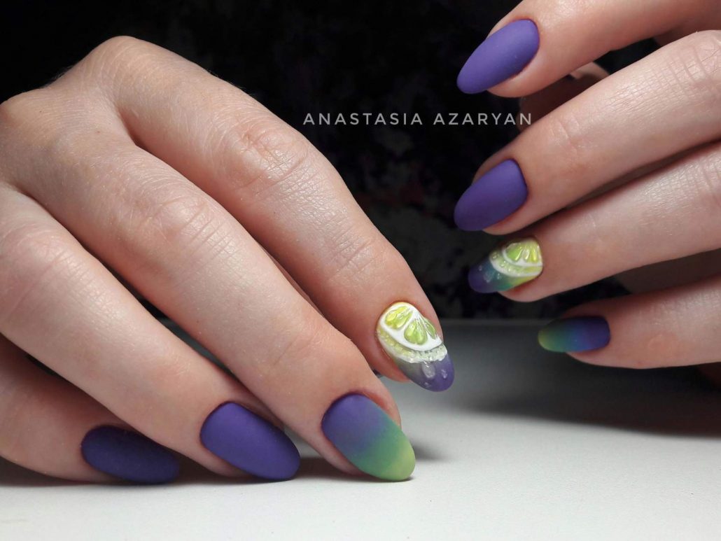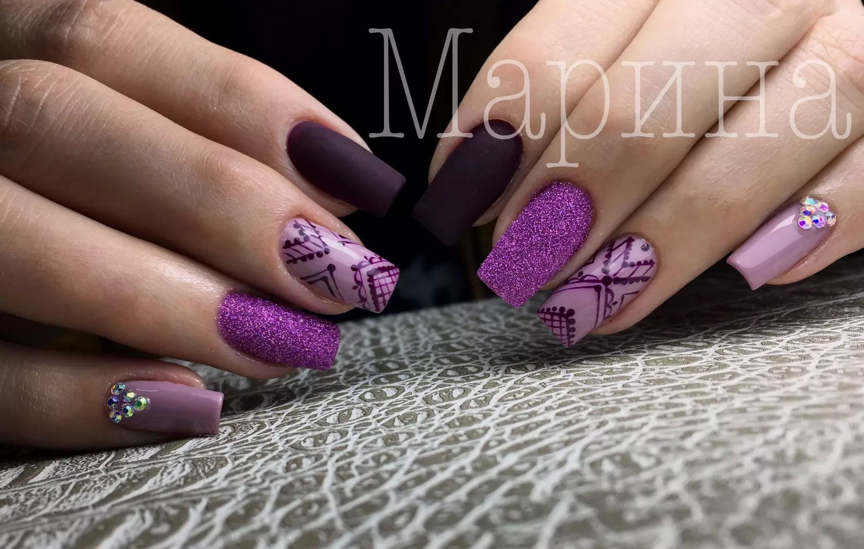 Brillant ou mat? Chaque fashionista se pose cette question en choisissant la dernière couche sur laquelle dépendra totalement l’apparence de votre manucure. La brillance a toujours un aspect coûteux et cache uniquement les petits défauts du revêtement. Toutefois, pour souligner le caractère unique de diverses techniques, les concepteurs recommandent unanimement un fini mat velouté cette saison. L'utilisation de cette technique renforcera l'effet d'une transition douce ou nette entre les nuances de violet et mettra l'accent sur la haute qualité du dessin. Une idée à la mode était de couvrir une ou deux nuances avec une telle technique. Si vous décidez de rendre tous les ongles mats, ajoutez des éléments en strass, des éléments de frottement ou des éléments en feuille à la conception. Cela équilibrera la composition et ajoutera une touche de coût élevé à votre look.
