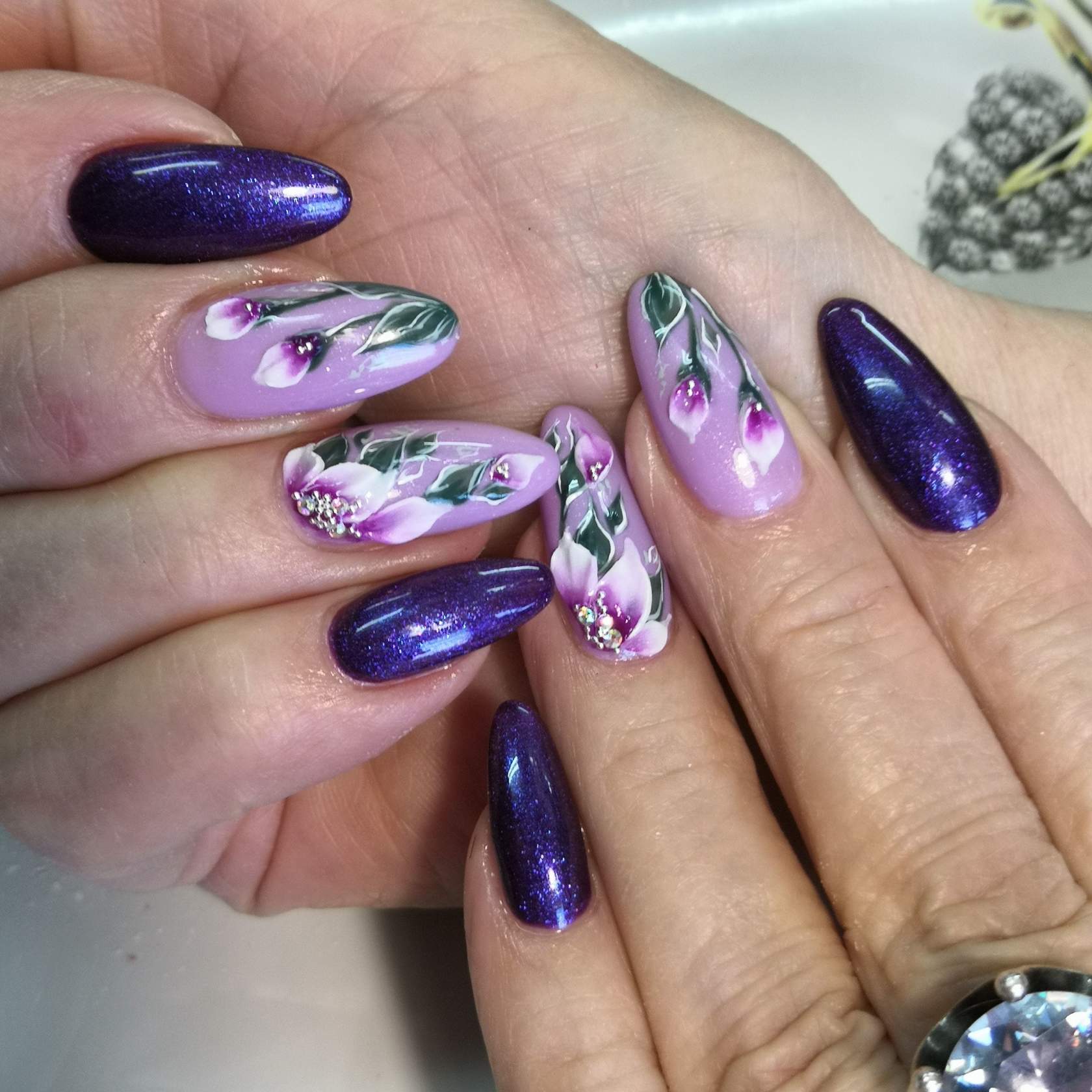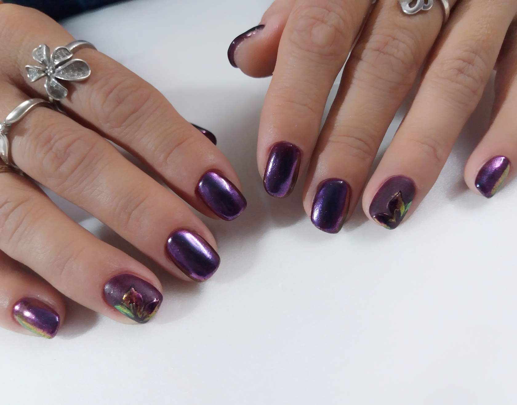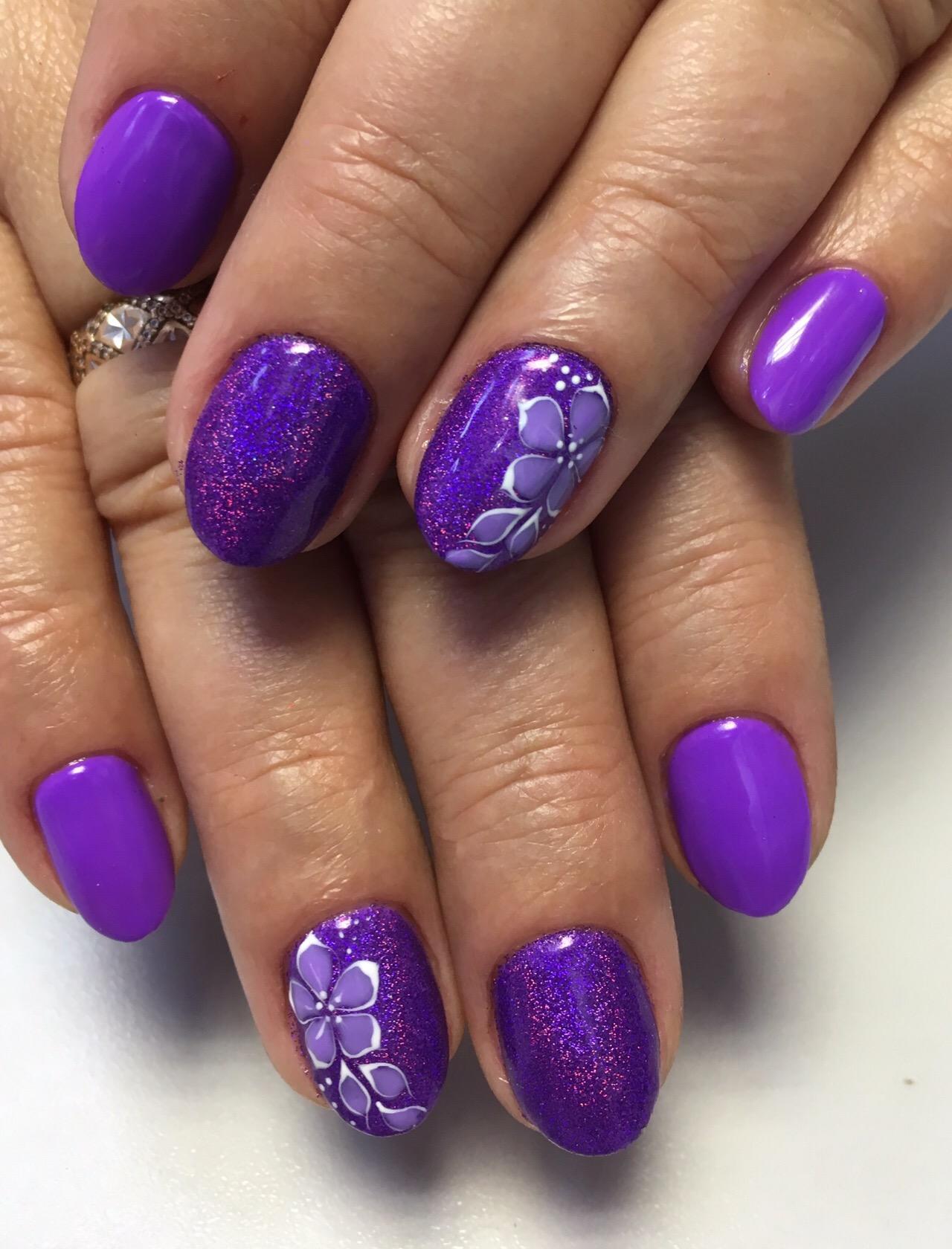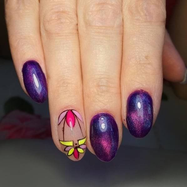 Les motifs floraux constituent l’un des principaux points de mire des soucis pourpres. Les boutons simples, les compositions florales et les ornements stylisés de ce thème sont devenus à la mode cette saison. Les bouquets de fleurs complètent toujours l’image avec féminité et ajoutent de la douceur à l’image des fashionistas. Certaines images ressemblent vraiment à de véritables chefs-d'œuvre d'art, car rien ne peut être plus luxueux, par exemple, des fleurs de printemps en fleurs sur vos ongles! Un merveilleux choix pour une vraie femme sera un bouquet de violettes. Il est très important d'appliquer des motifs floraux en utilisant la technique d'estampage ou «voile», dans laquelle le maître affiche des fleurs sur une base transparente avec des vernis violets. Tous les arrangements floraux sont réalisés dans des nuances de vernis similaires ou contrastées, selon l'option envisagée.