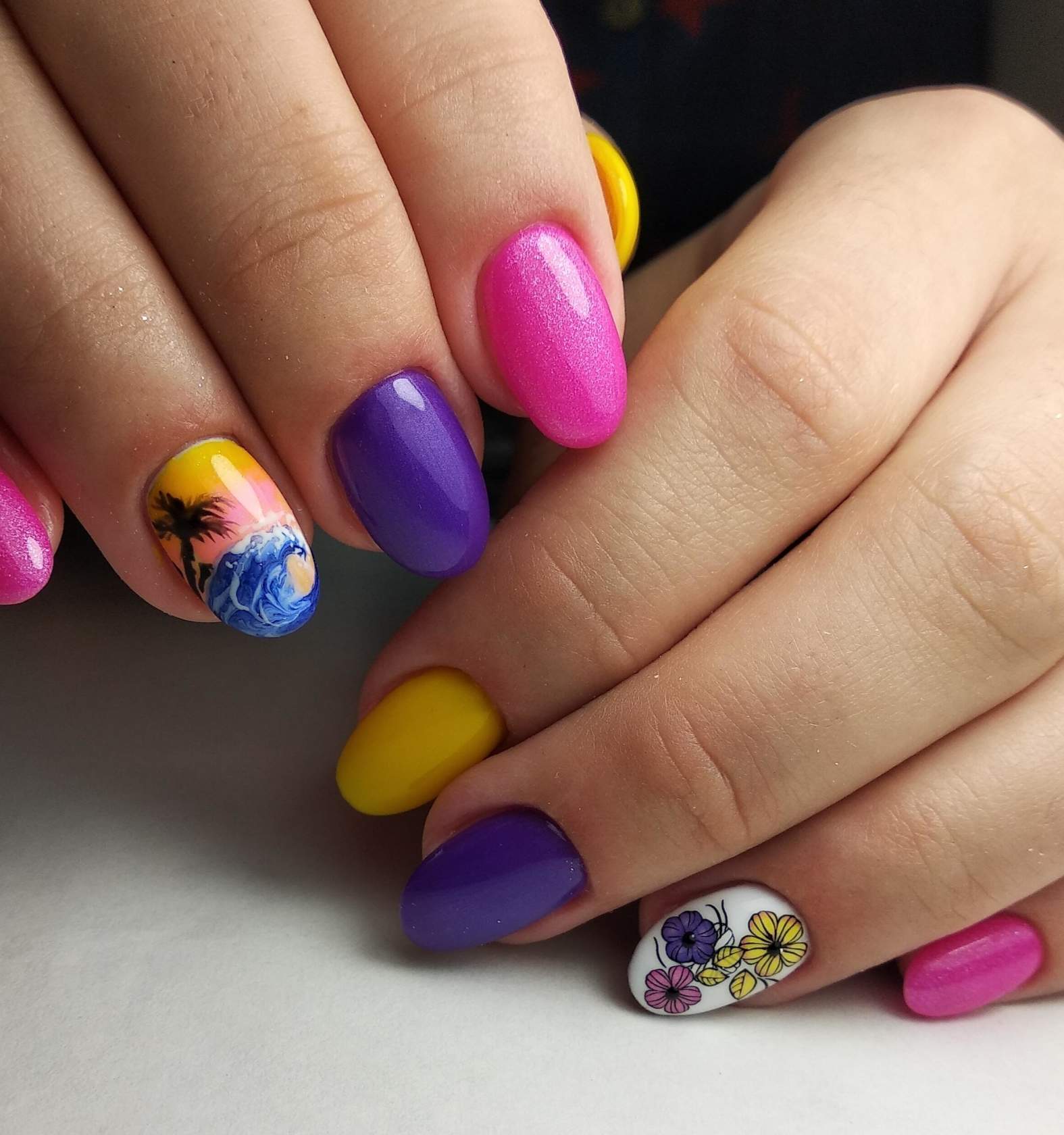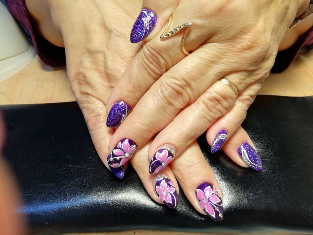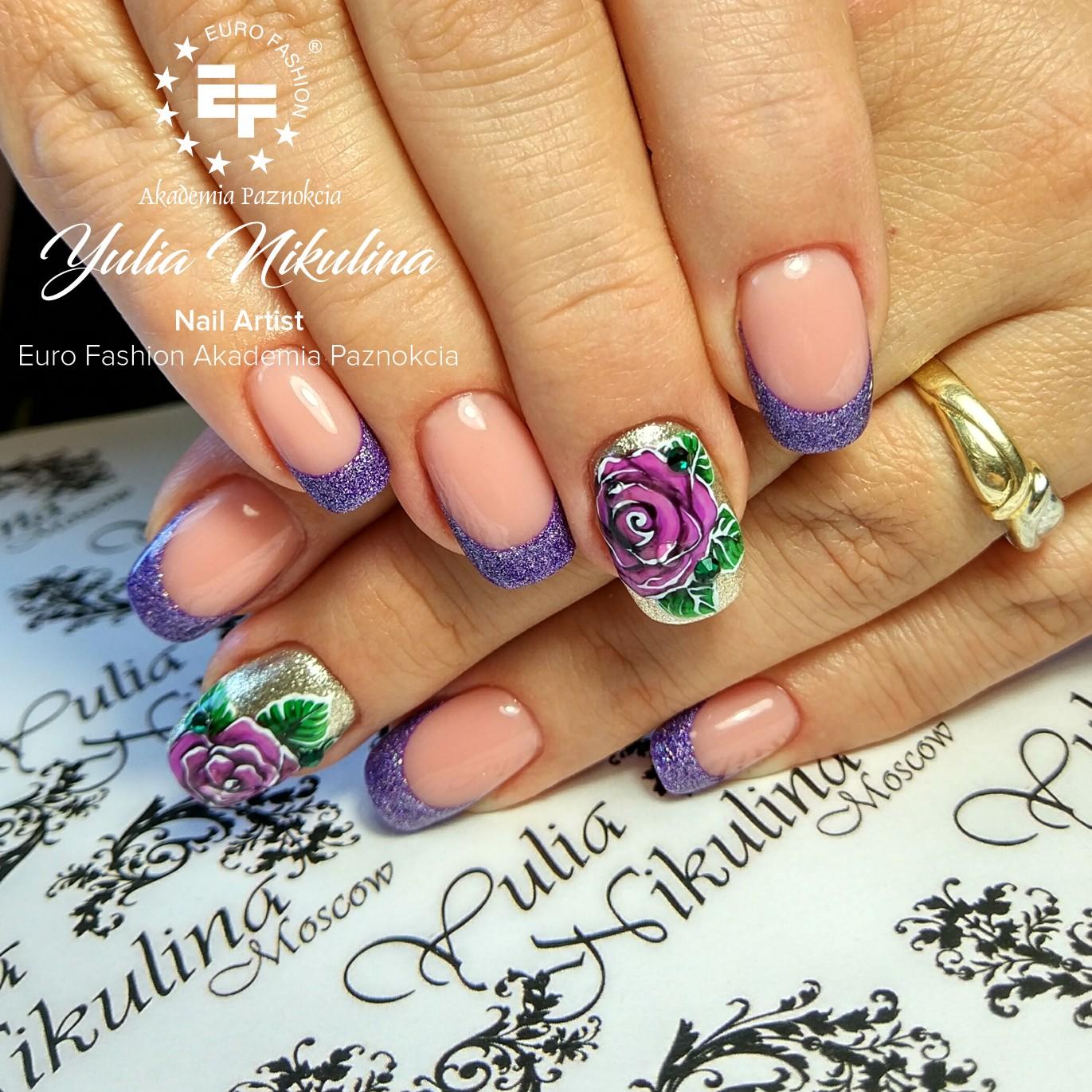 Les motifs floraux constituent l’un des principaux points de mire des soucis pourpres. Les boutons simples, les compositions florales et les ornements stylisés de ce thème sont devenus à la mode cette saison. Les bouquets de fleurs complètent toujours l’image avec féminité et ajoutent de la douceur à l’image des fashionistas. Certaines images ressemblent vraiment à de véritables chefs-d'œuvre d'art, car rien ne peut être plus luxueux, par exemple, des fleurs de printemps en fleurs sur vos ongles! Un merveilleux choix pour une vraie femme sera un bouquet de violettes. Il est très important d'appliquer des motifs floraux en utilisant la technique d'estampage ou «voile», dans laquelle le maître affiche des fleurs sur une base transparente avec des vernis violets. Tous les arrangements floraux sont réalisés dans des nuances de vernis similaires ou contrastées, selon l'option envisagée.
