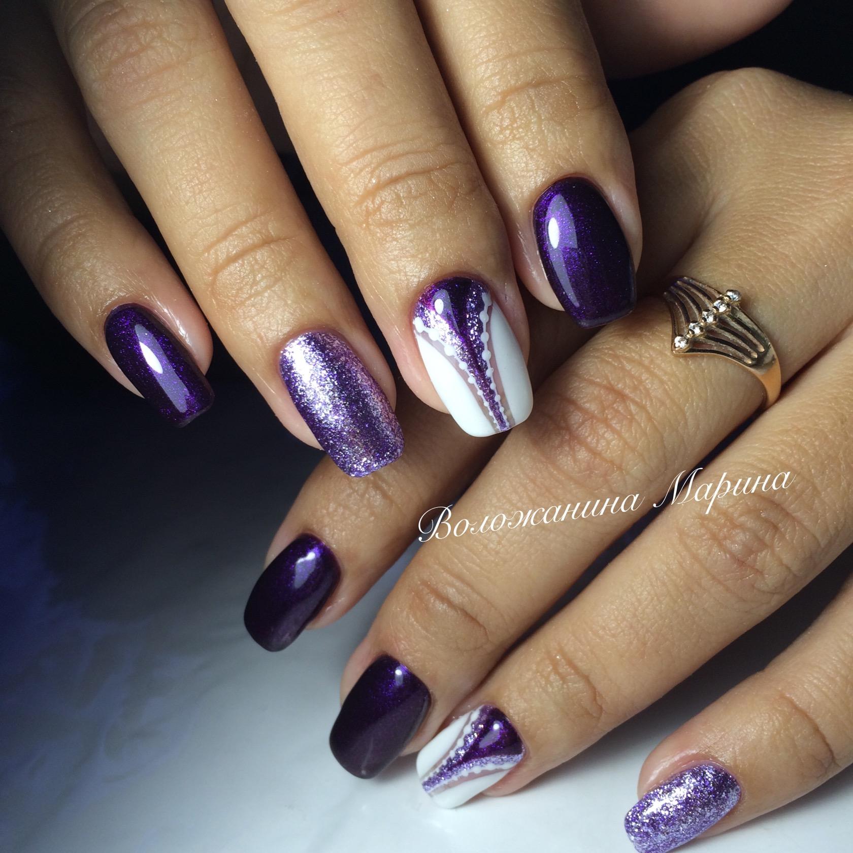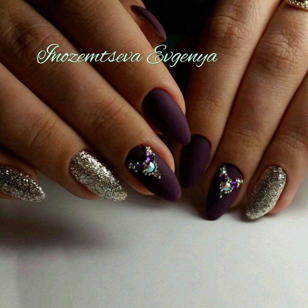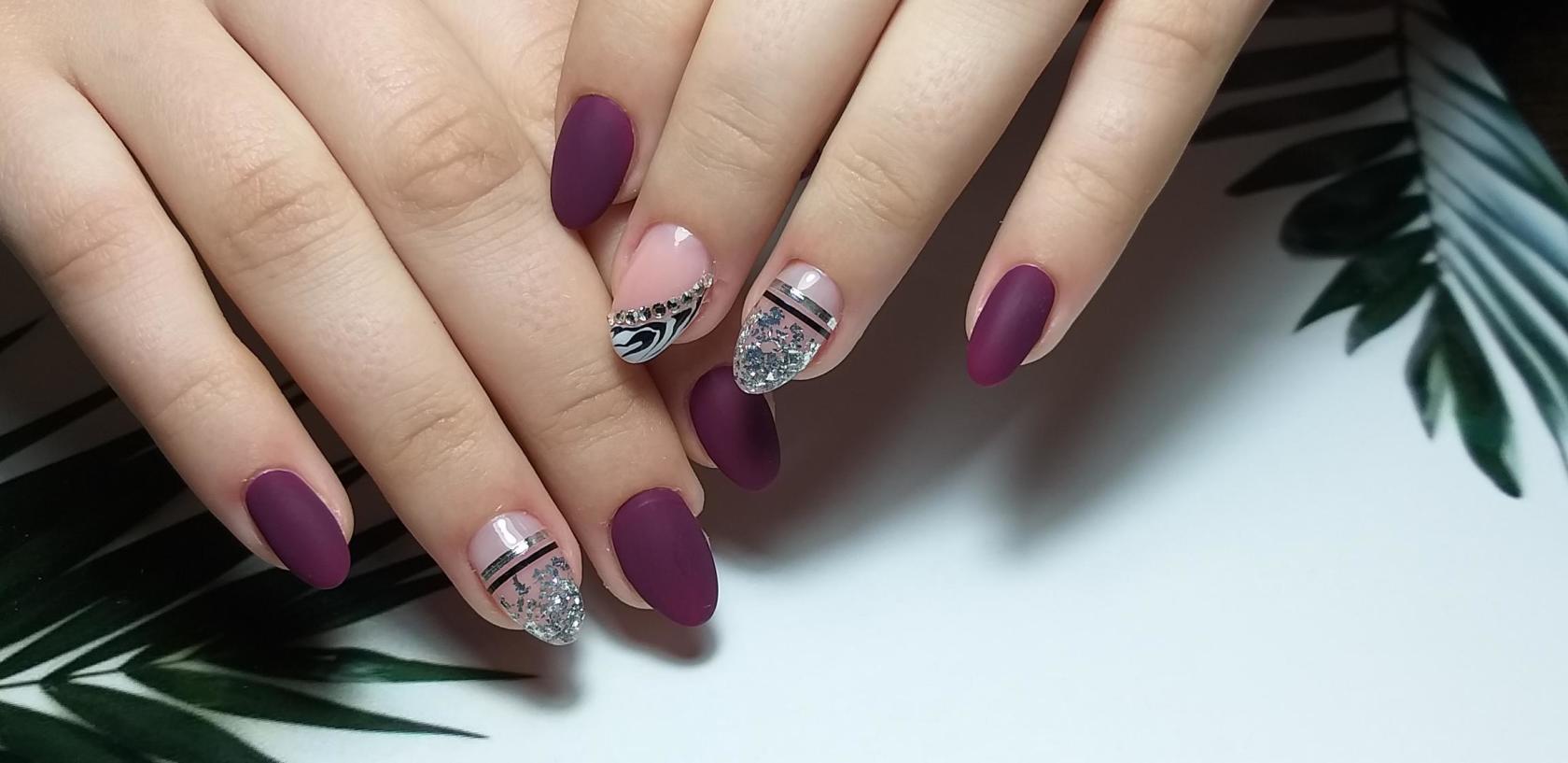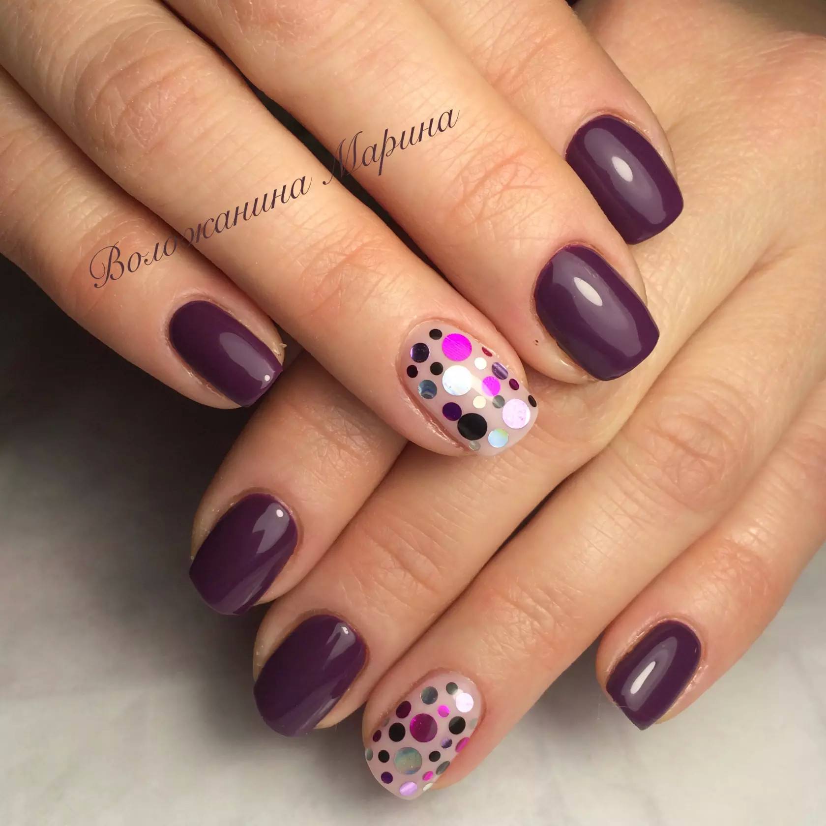 Les nuances sombres de pourpre sont en demande dans les mois froids de l'année, mais cela ne signifie pas qu'en été, par exemple, vous ne pouvez pas faire de manucure d'une telle couleur. De plus, le pourpre est l’une des teintes foncées à la mode de la manucure pour publication. Les couleurs foncées et sombres peuvent être diluées avec des motifs de strass ou de paillettes soignés. Le frottement, les éléments de «verre brisé» et les petits accents de tout autre décor sont magnifiques.
