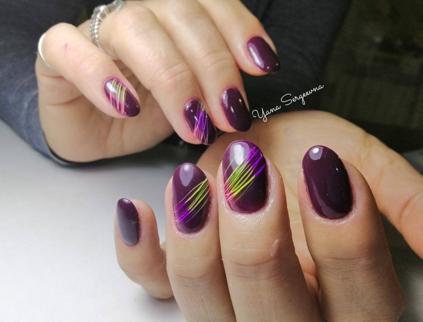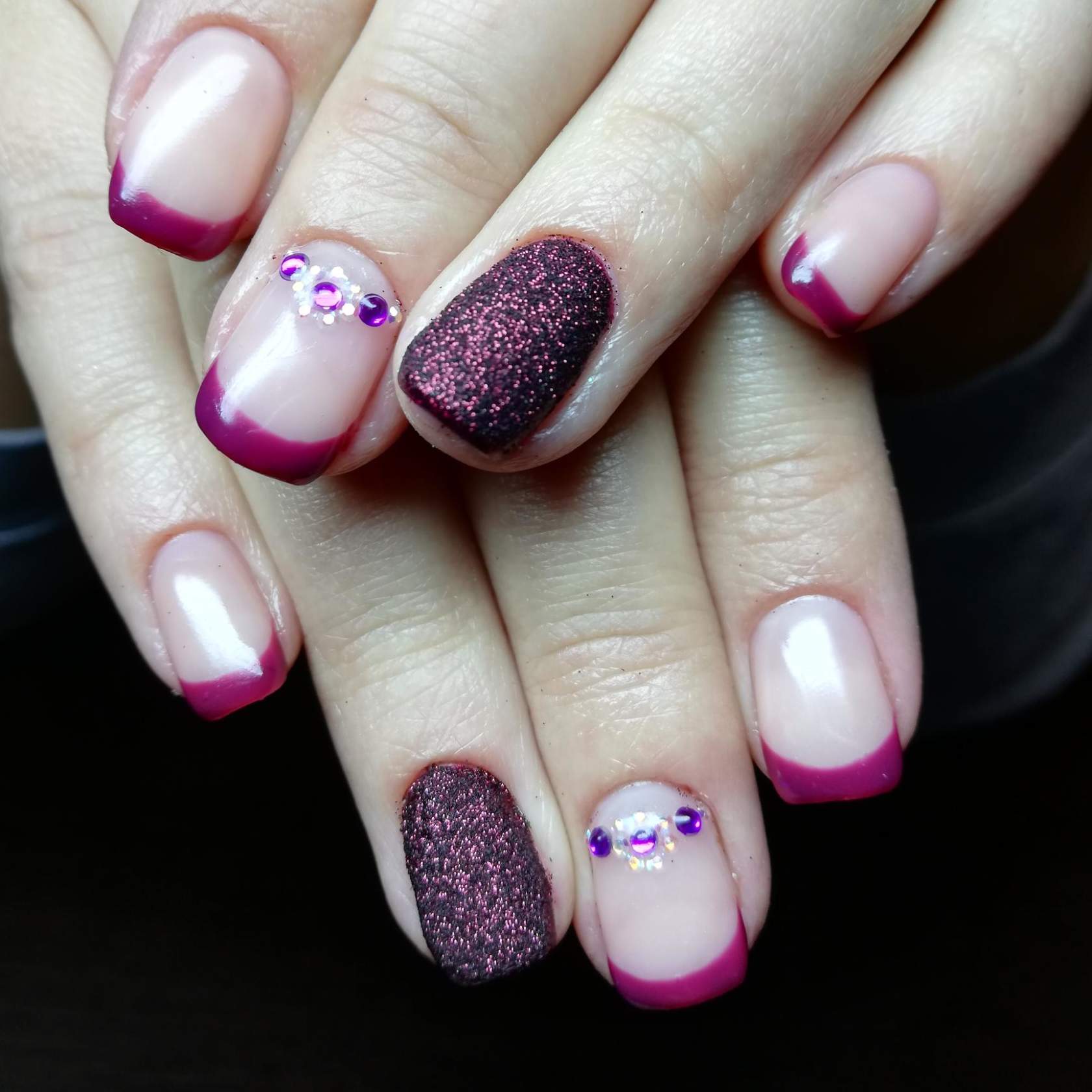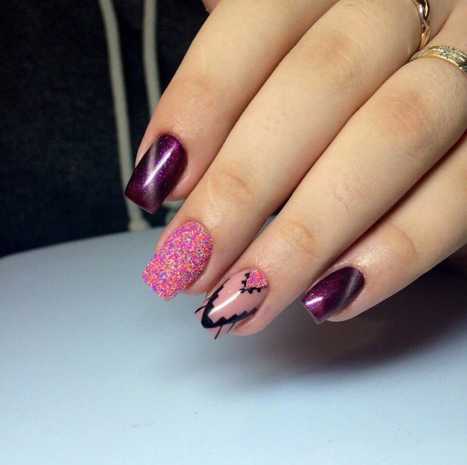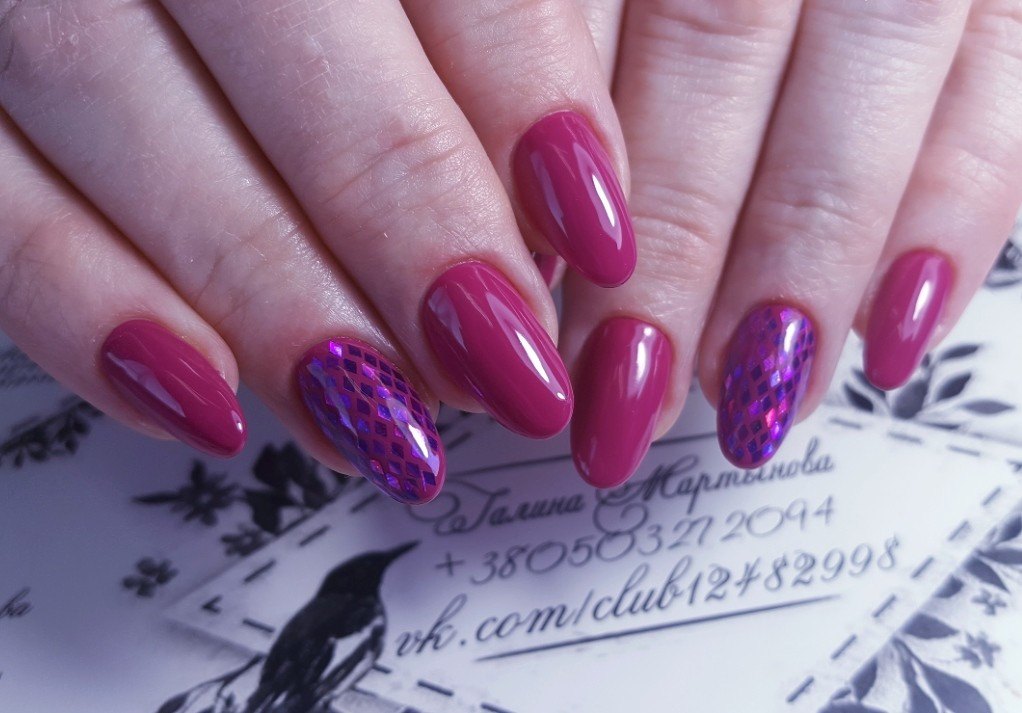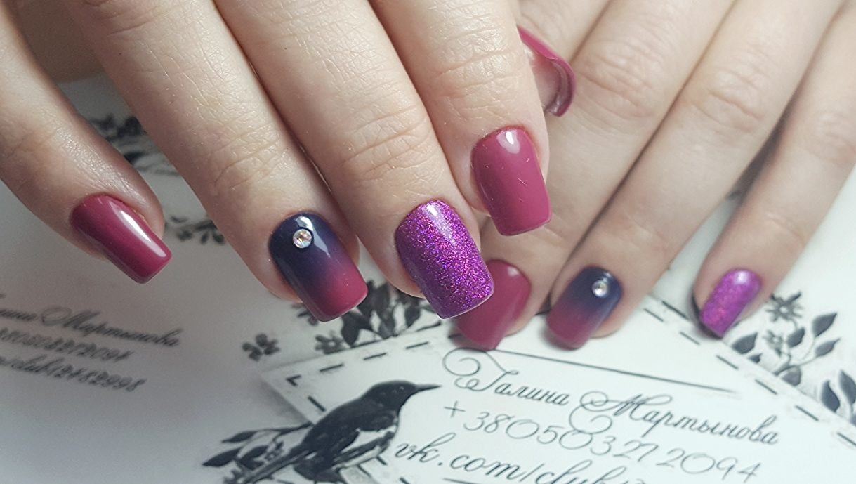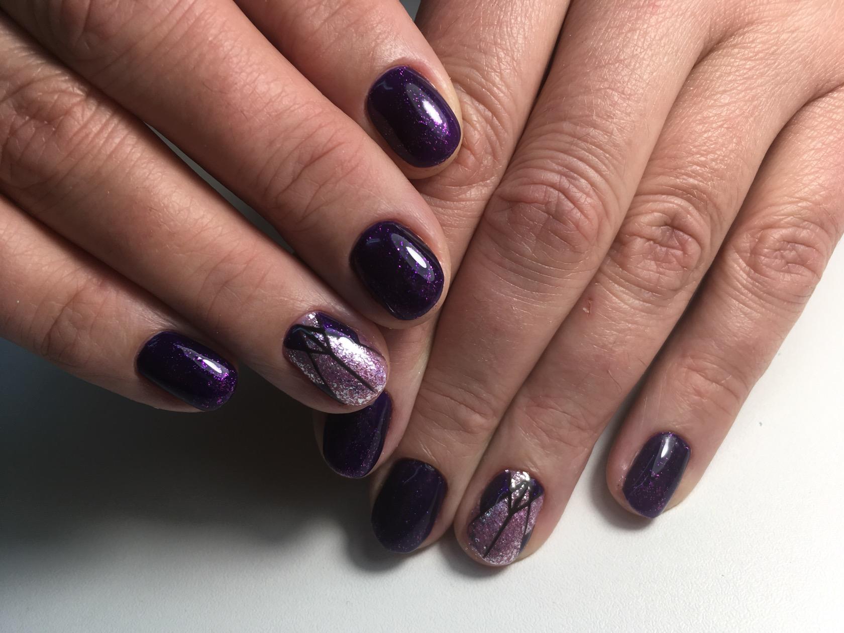 Les nuances sombres de pourpre sont en demande dans les mois froids de l'année, mais cela ne signifie pas qu'en été, par exemple, vous ne pouvez pas faire de manucure d'une telle couleur. De plus, le pourpre est l’une des teintes foncées à la mode de la manucure pour publication. Les couleurs foncées et sombres peuvent être diluées avec des motifs de strass ou de paillettes soignés. Le frottement, les éléments de «verre brisé» et les petits accents de tout autre décor sont magnifiques.