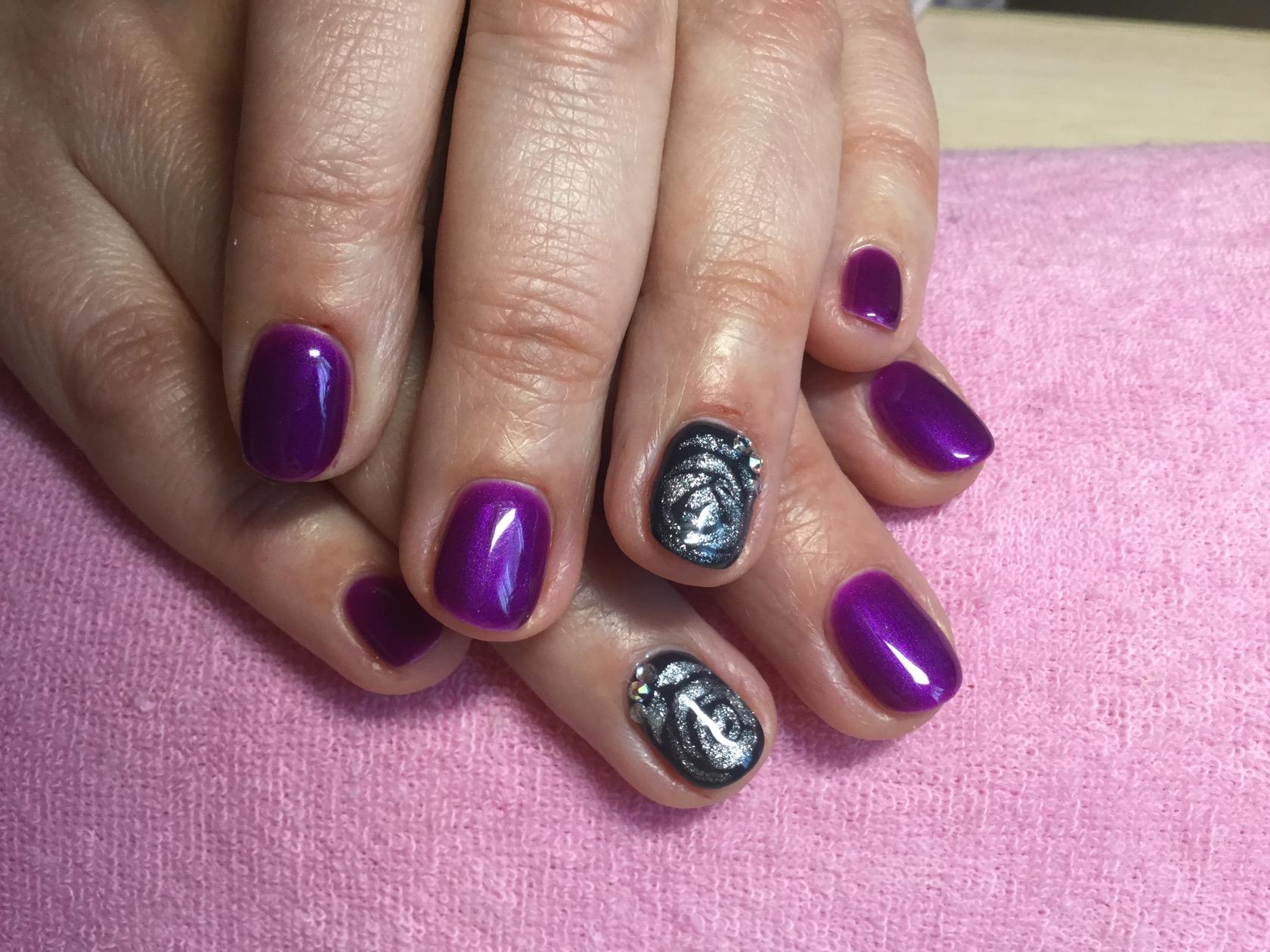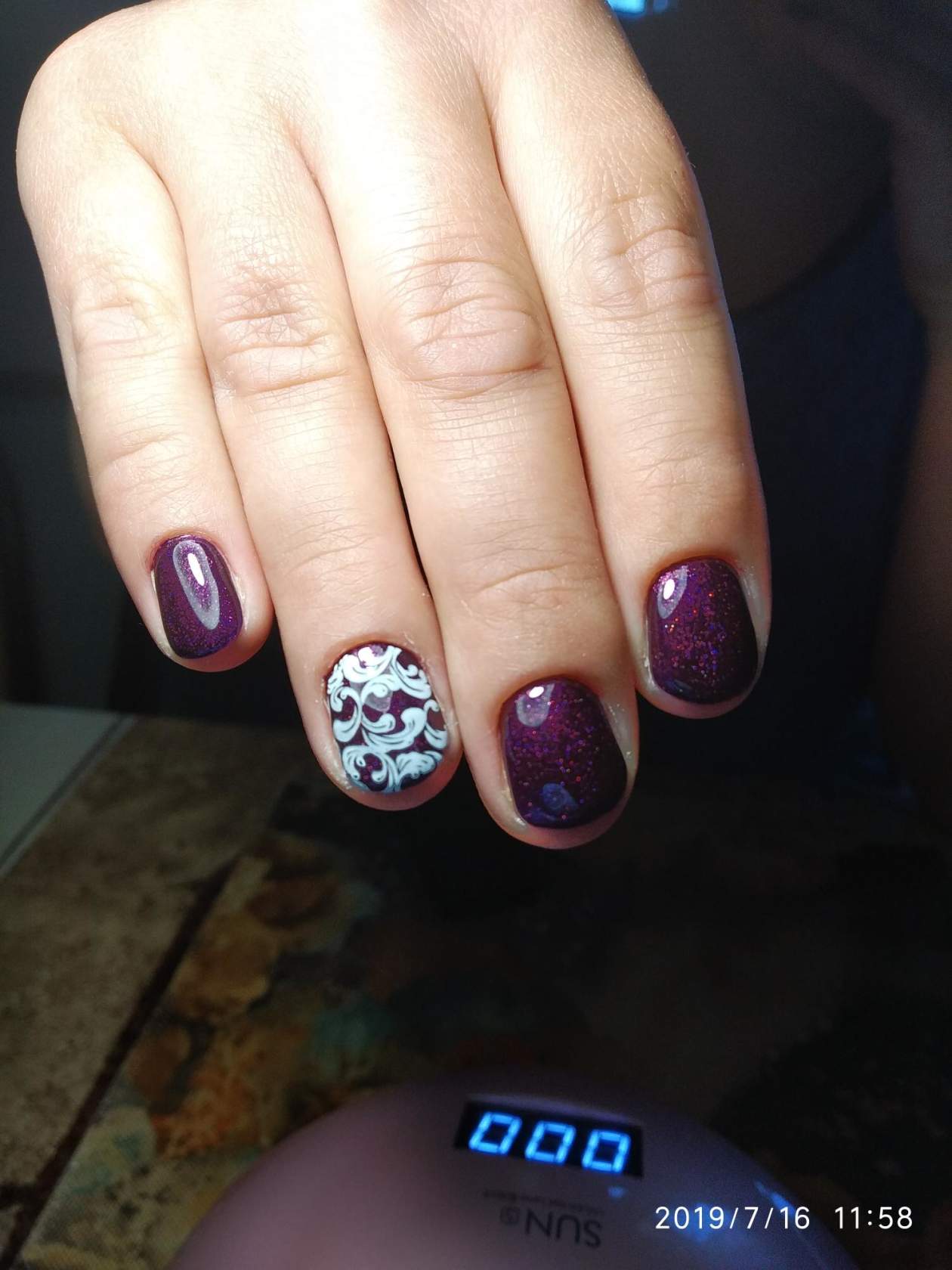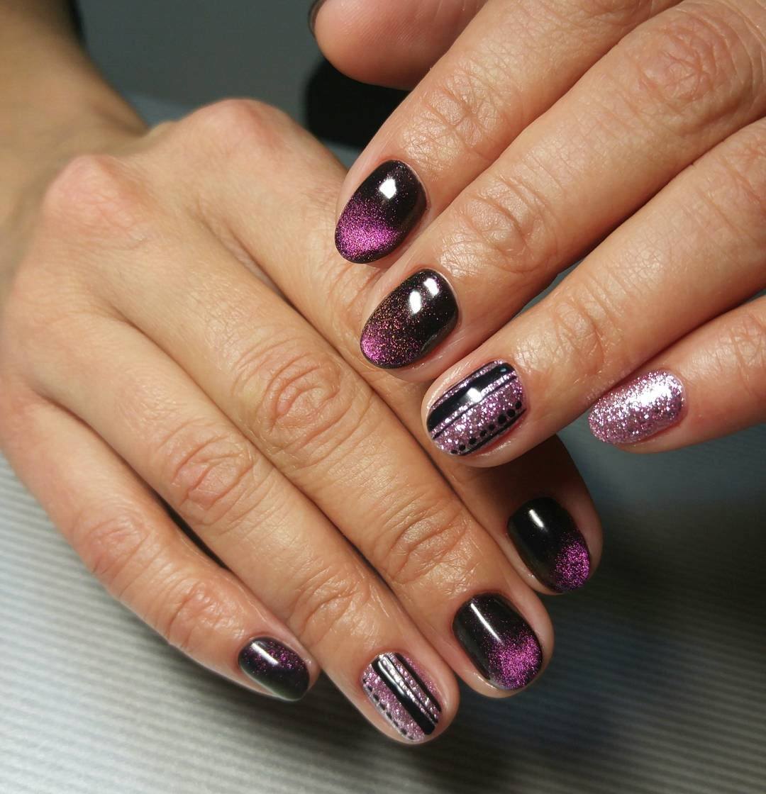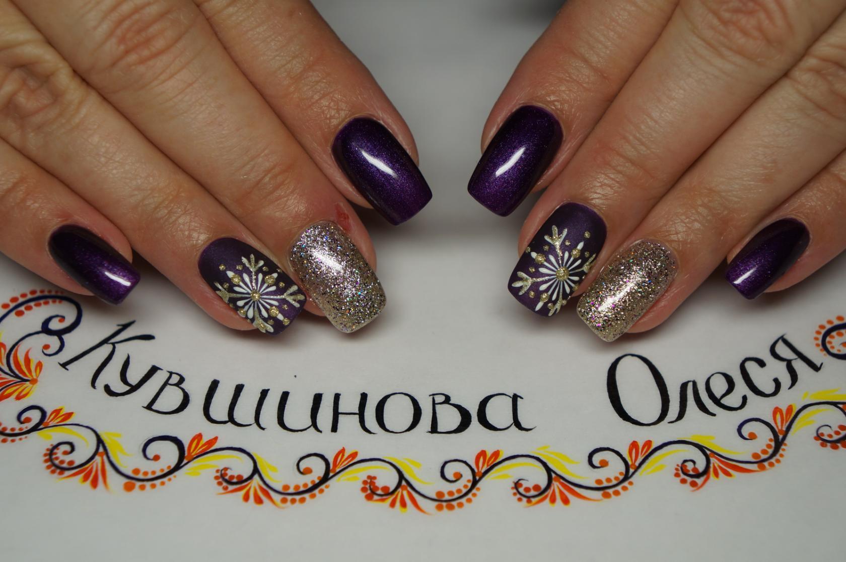 Les nuances sombres de pourpre sont en demande dans les mois froids de l'année, mais cela ne signifie pas qu'en été, par exemple, vous ne pouvez pas faire de manucure d'une telle couleur. De plus, le pourpre est l’une des teintes foncées à la mode de la manucure pour publication. Les couleurs foncées et sombres peuvent être diluées avec des motifs de strass ou de paillettes soignés. Le frottement, les éléments de «verre brisé» et les petits accents de tout autre décor sont magnifiques.