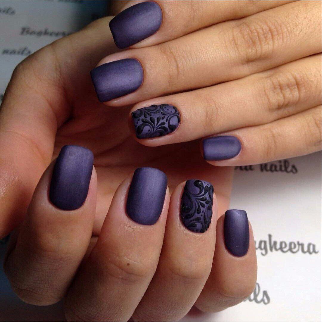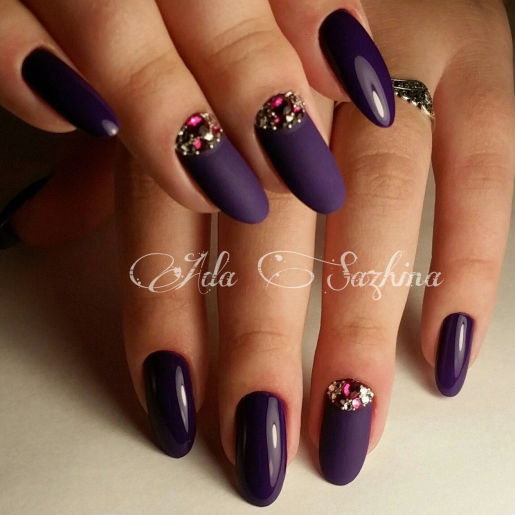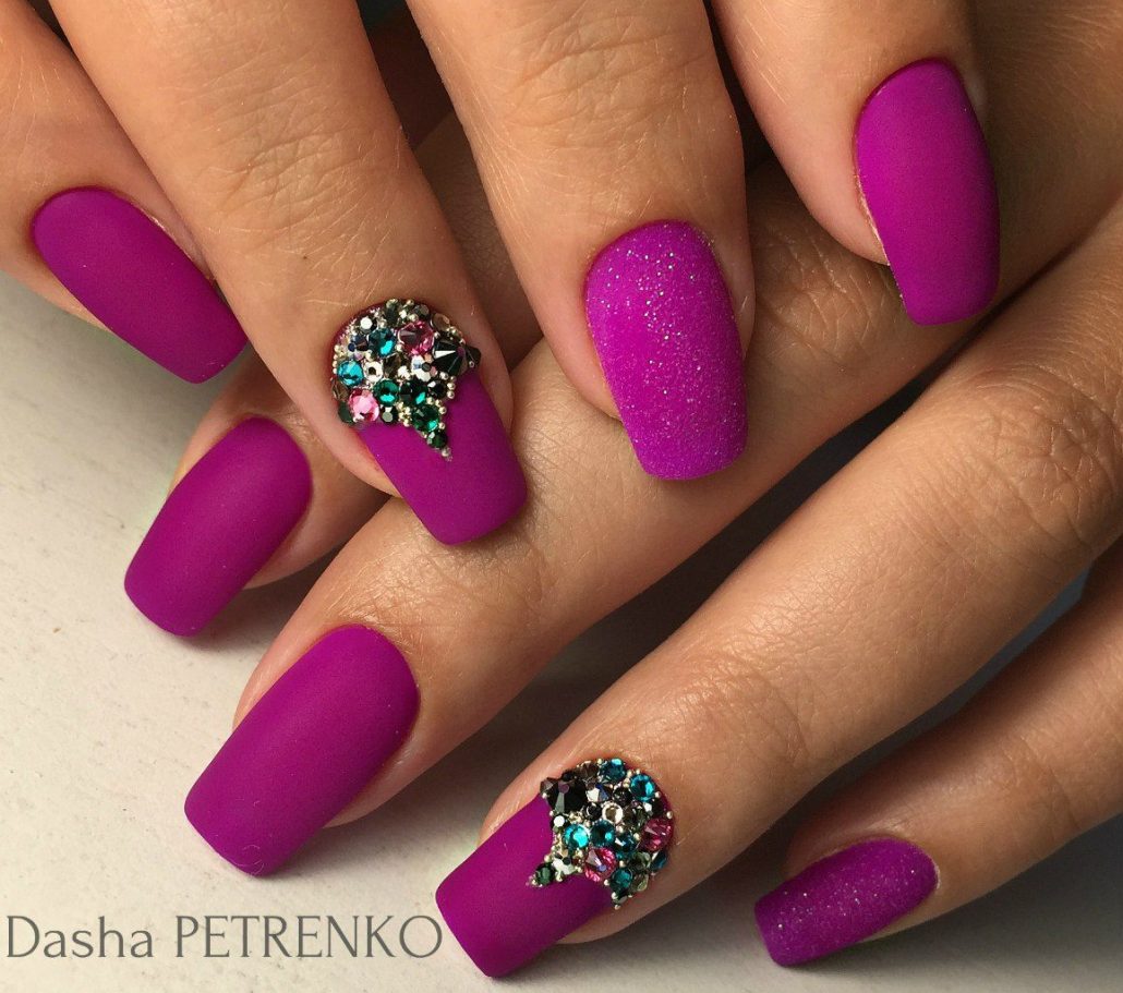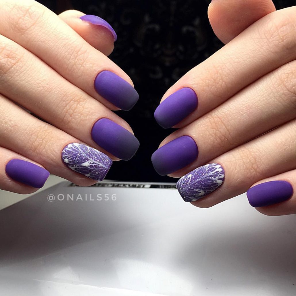 Même dans une version monochrome, la manucure violette aura un aspect élégant, en particulier si elle est mate. Le rubis violet aura l'air glamour. Mais si vous le souhaitez, ses nuances peuvent toujours être combinées avec des couleurs classiques (blanc, noir, gris et beige). Dans une telle variation, il aura toujours l’air attrayant.