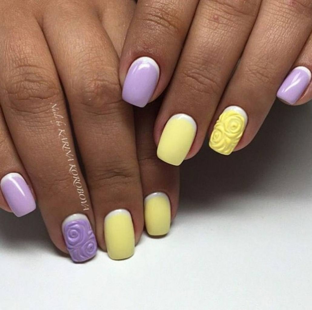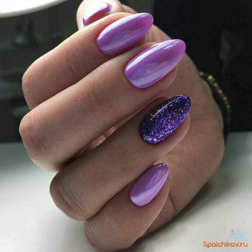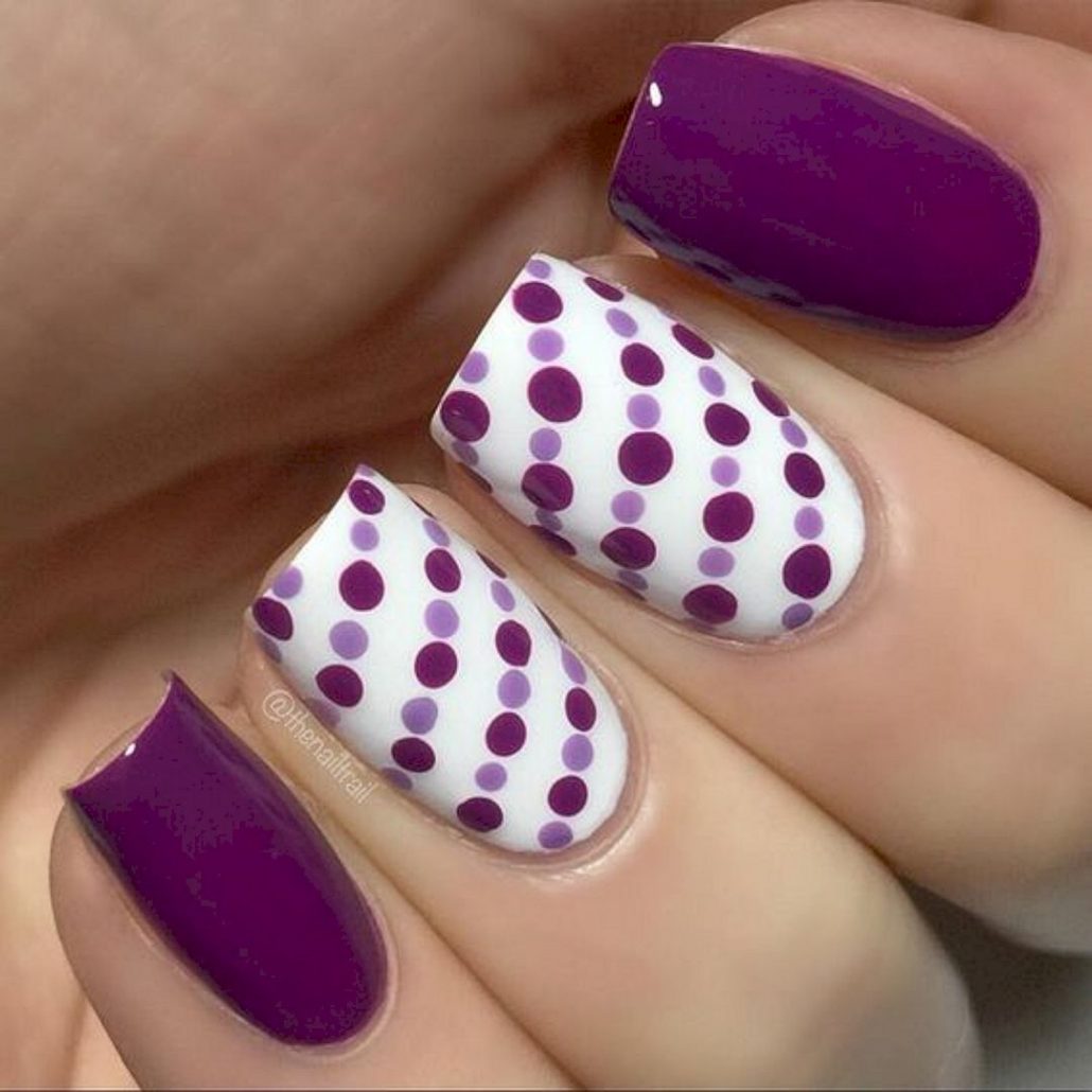 Une base violette décorée de pois multicolores aura l’air très mignon. Pour commencer, l'ongle est peint avec n'importe quelle nuance de violet, après quoi, à l'aide de points ou d'un pochoir, des points de toutes les couleurs et de toutes les tailles sont appliqués sur le dessus.