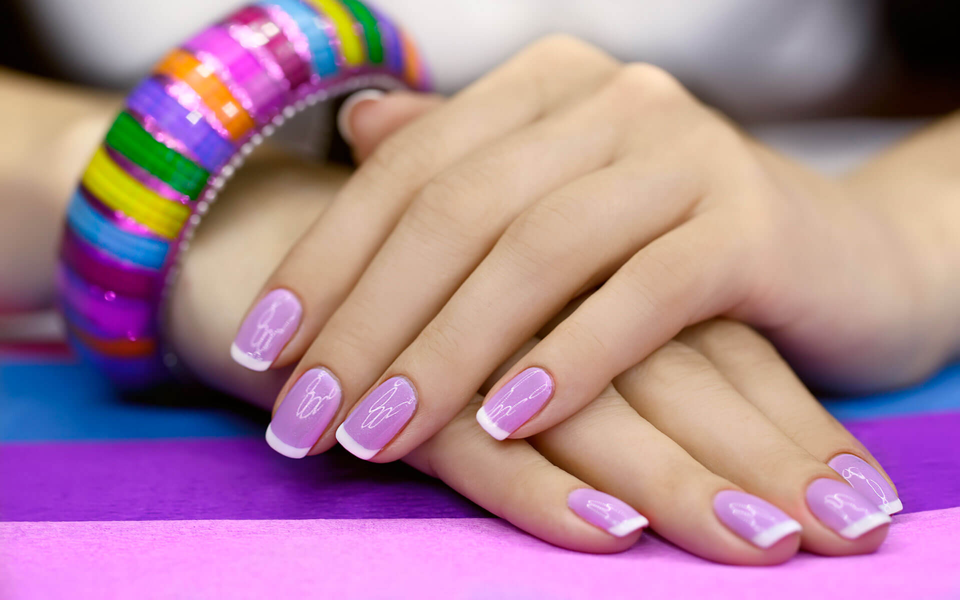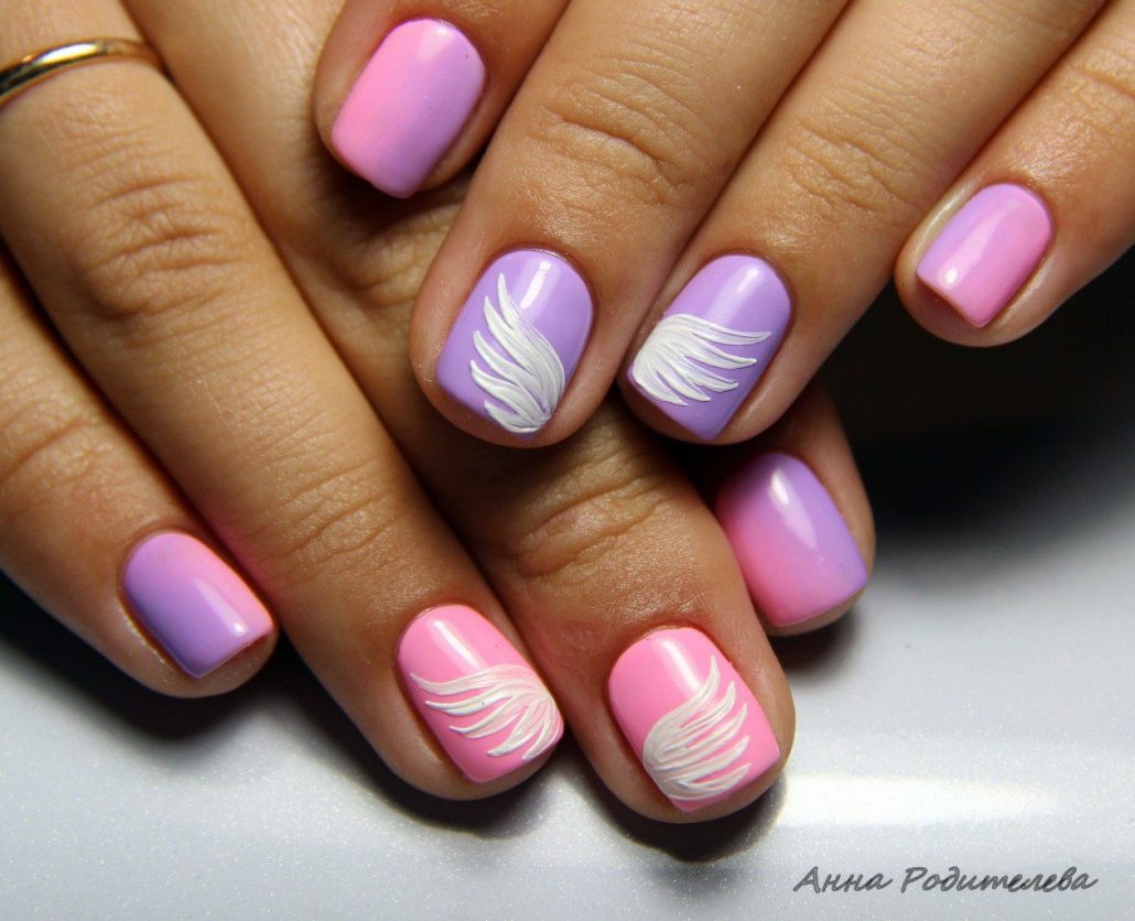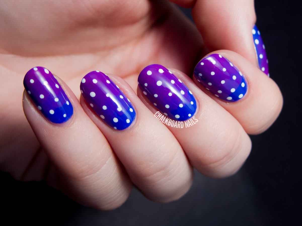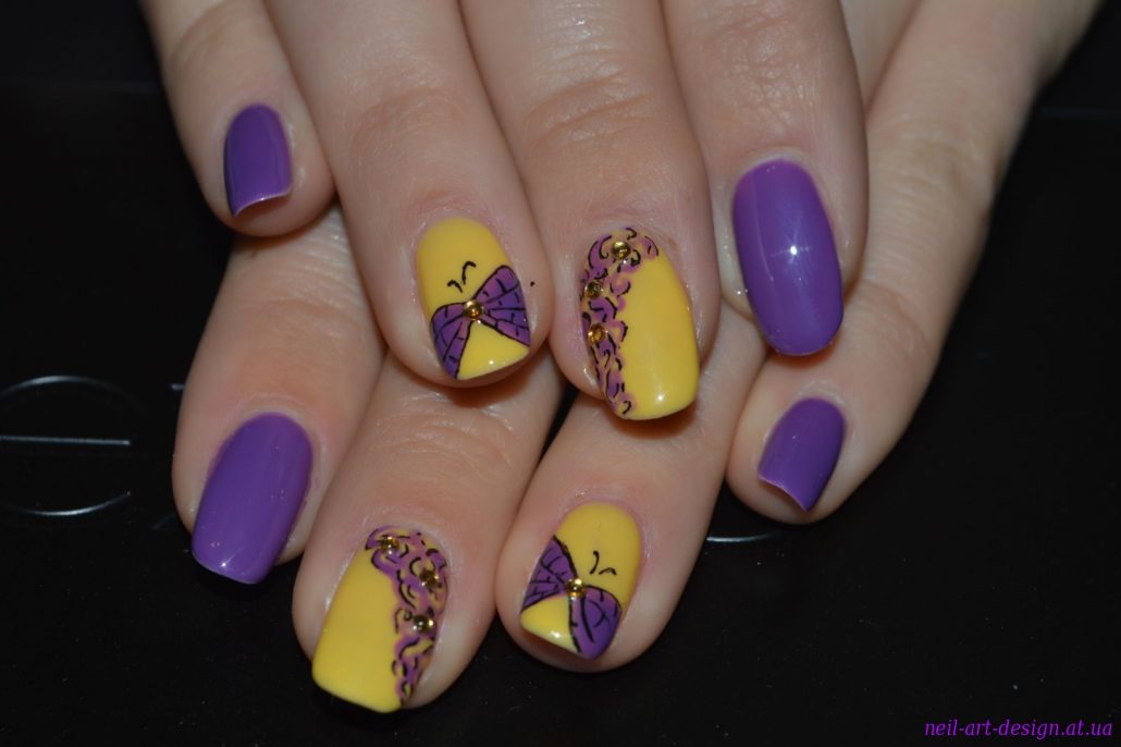 Une base violette décorée de pois multicolores aura l’air très mignon. Pour commencer, l'ongle est peint avec n'importe quelle nuance de violet, après quoi, à l'aide de points ou d'un pochoir, des points de toutes les couleurs et de toutes les tailles sont appliqués sur le dessus.