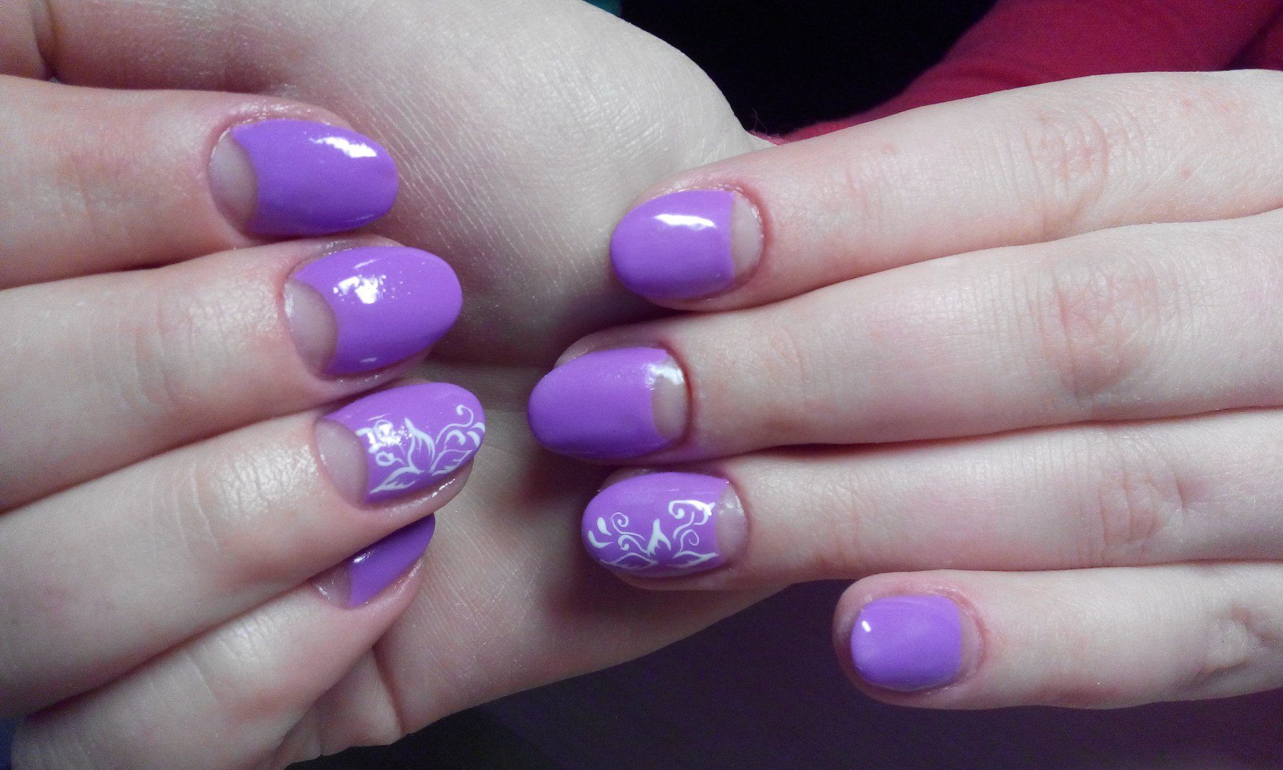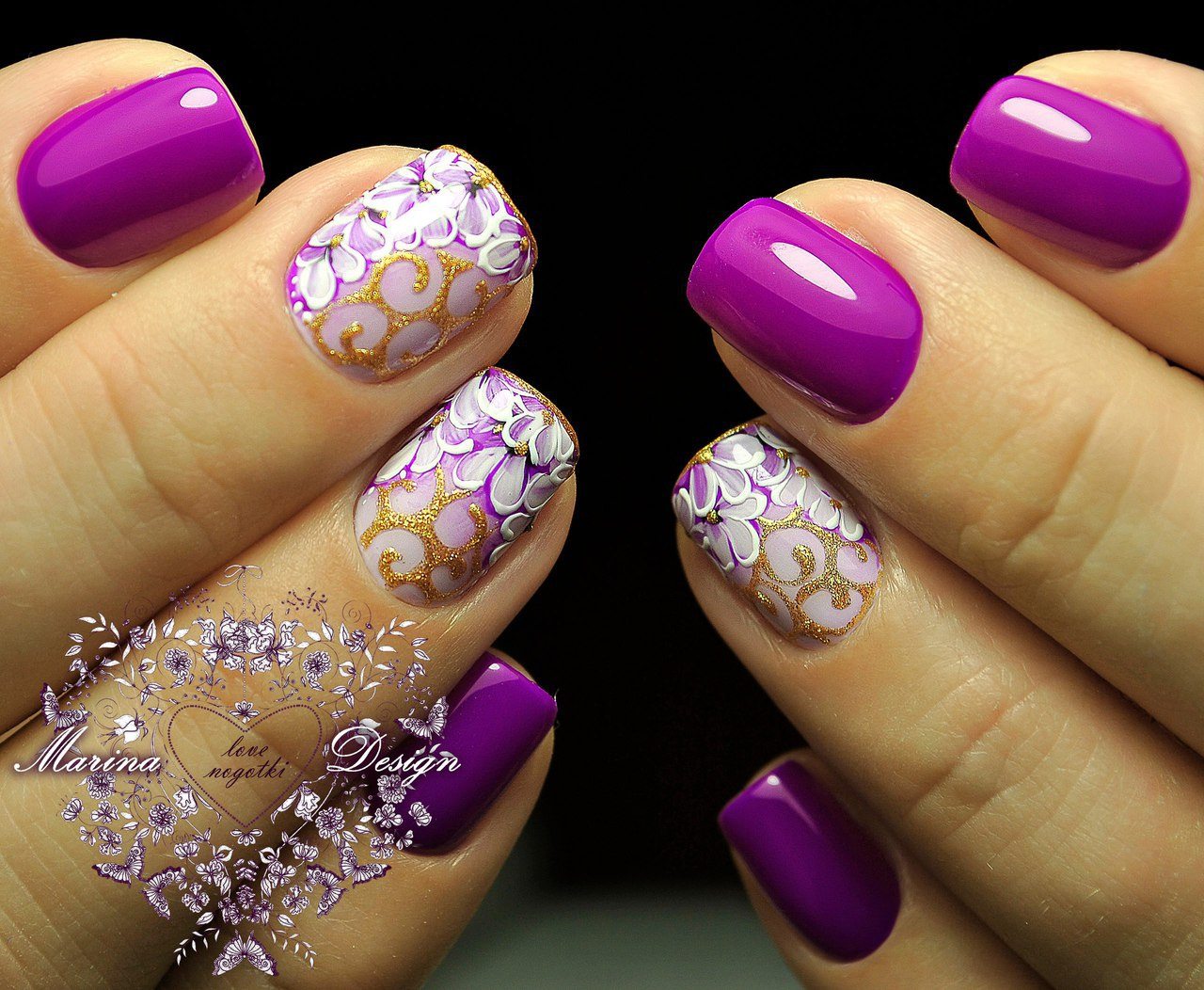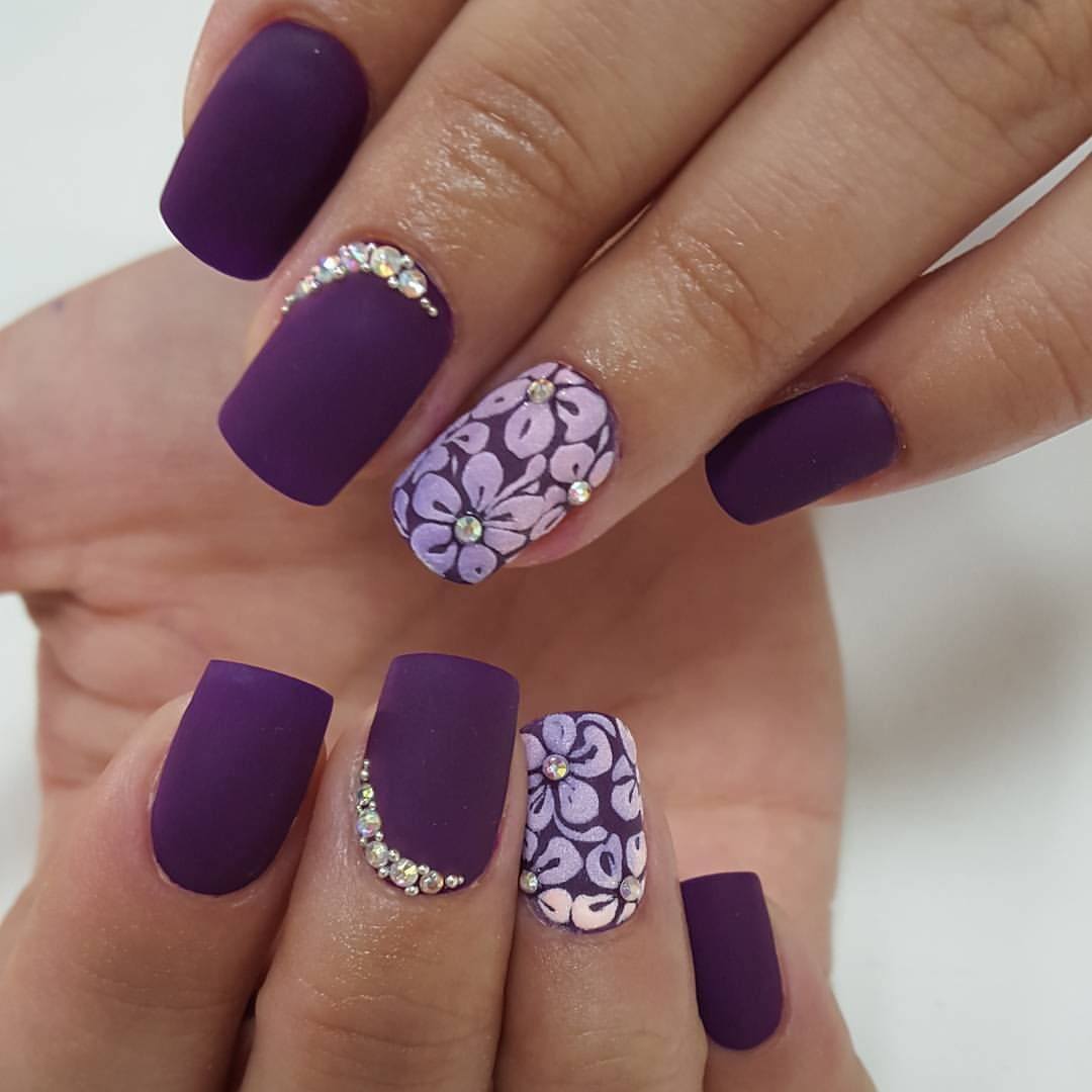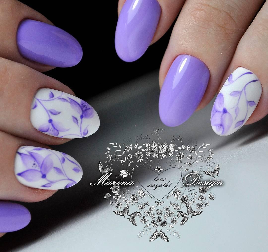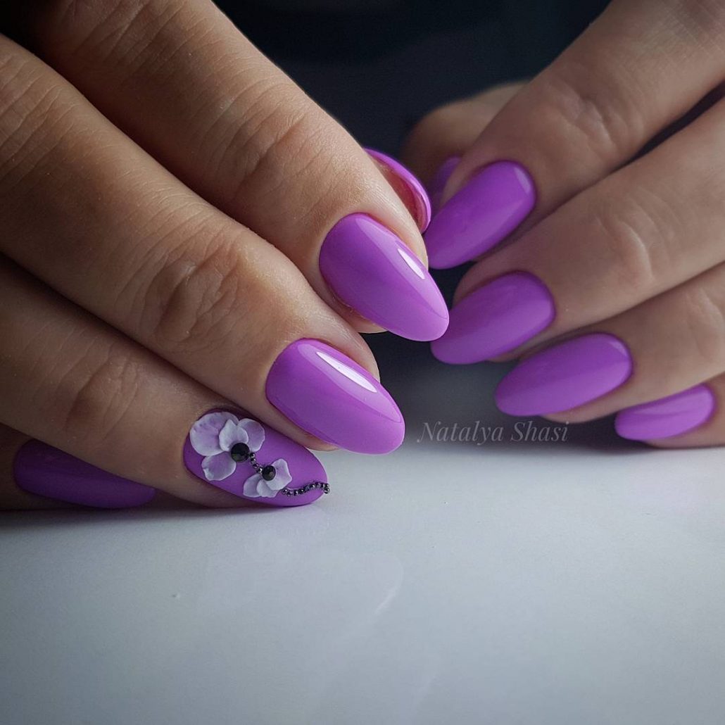 Les amateurs d'ornements floraux peuvent choisir le violet comme base ou dessiner des fleurs sur un fond blanc ou d'un autre fond clair. Bien sûr, une telle manucure ne devrait être approuvée que par un maître professionnel qui peut faire un beau dessin sur l’ongle. Mais si vous êtes déterminé à vous faire une fleur de manucure, vous pouvez utiliser des pochoirs ou des autocollants spéciaux.