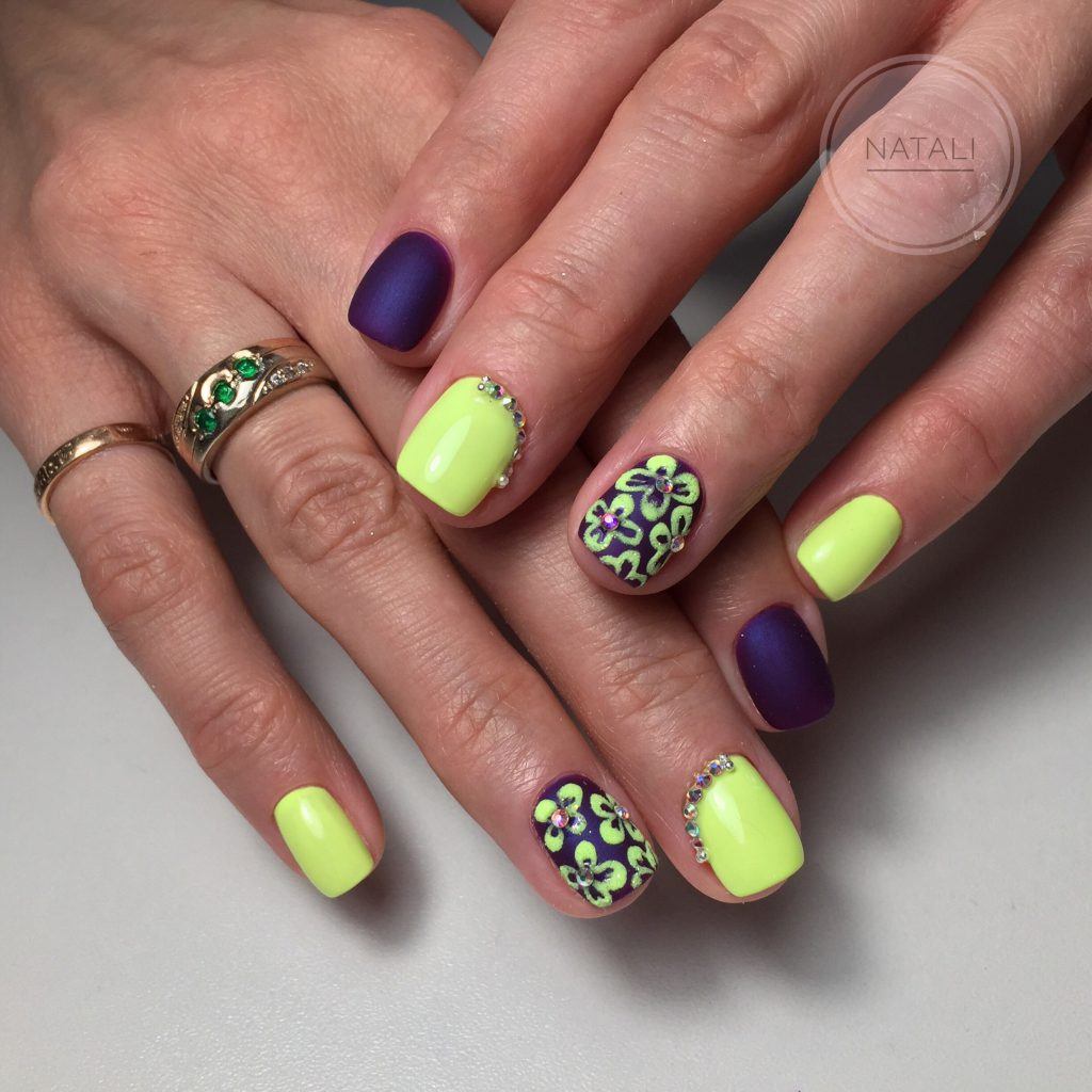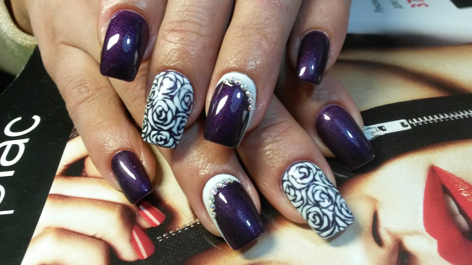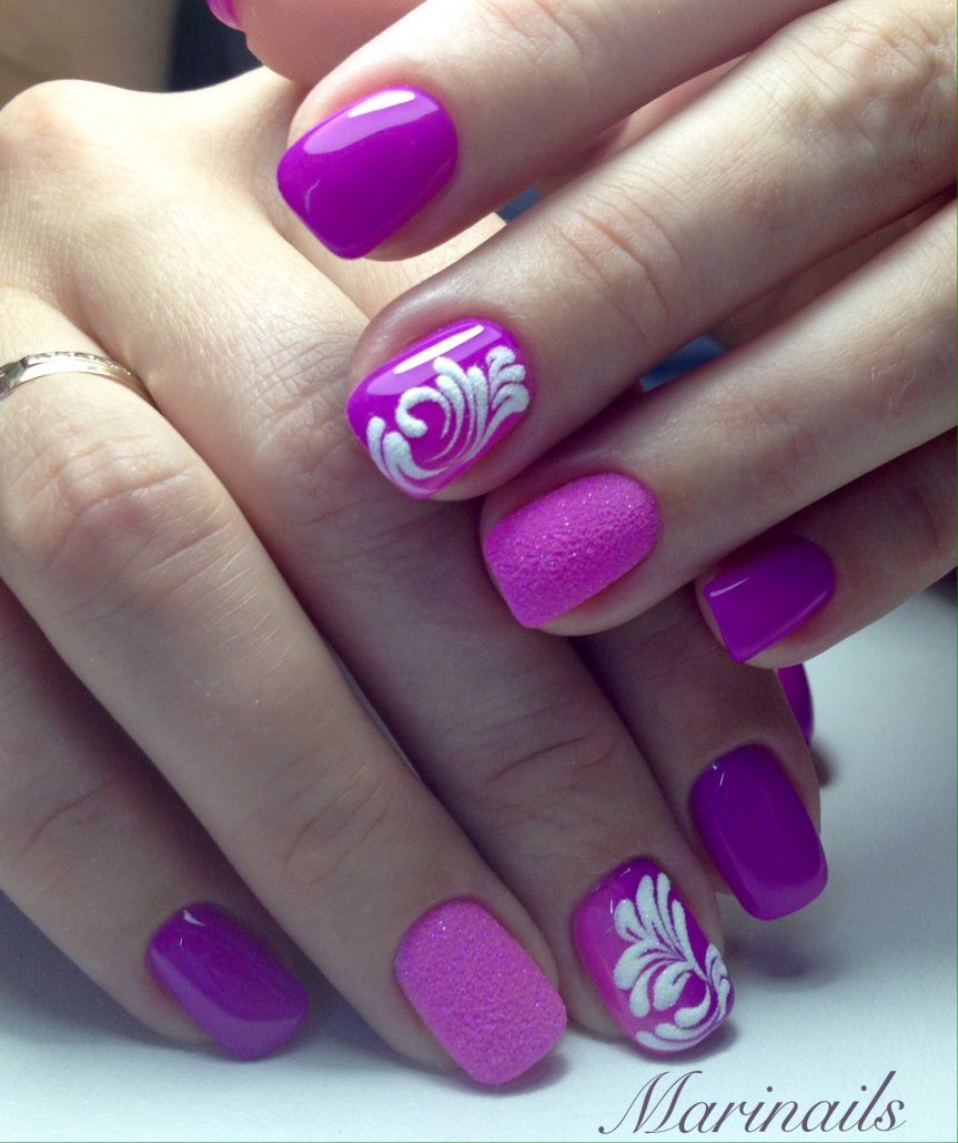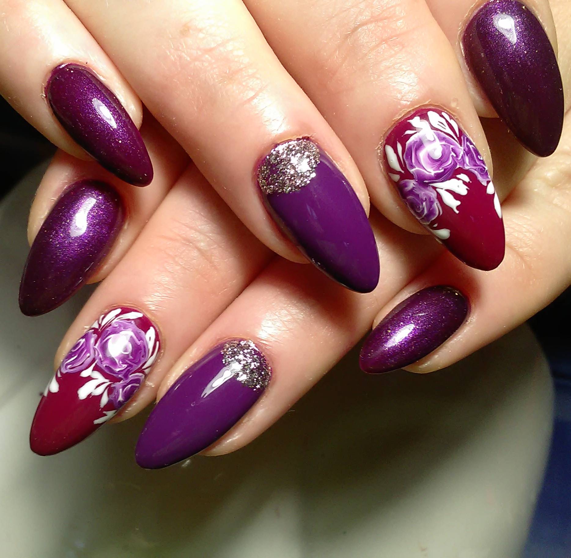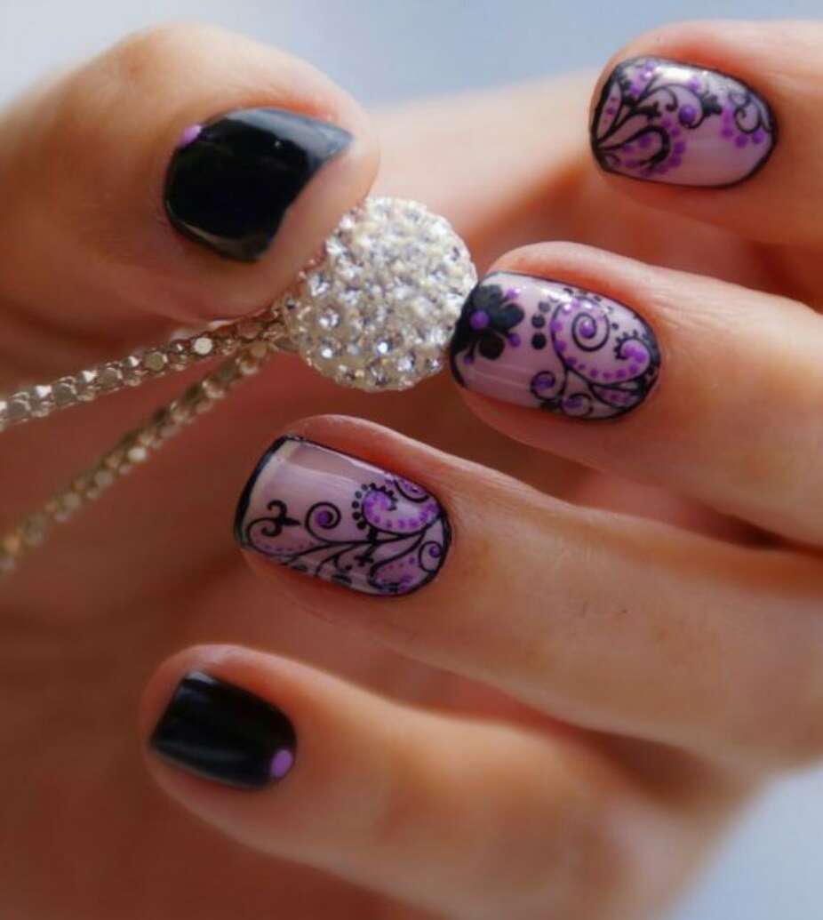 Les amateurs d'ornements floraux peuvent choisir le violet comme base ou dessiner des fleurs sur un fond blanc ou d'un autre fond clair. Bien sûr, une telle manucure ne devrait être approuvée que par un maître professionnel qui peut faire un beau dessin sur l’ongle. Mais si vous êtes déterminé à vous faire une fleur de manucure, vous pouvez utiliser des pochoirs ou des autocollants spéciaux.