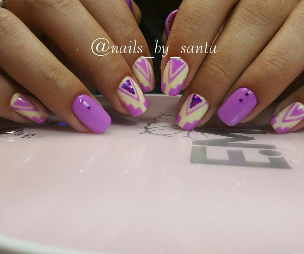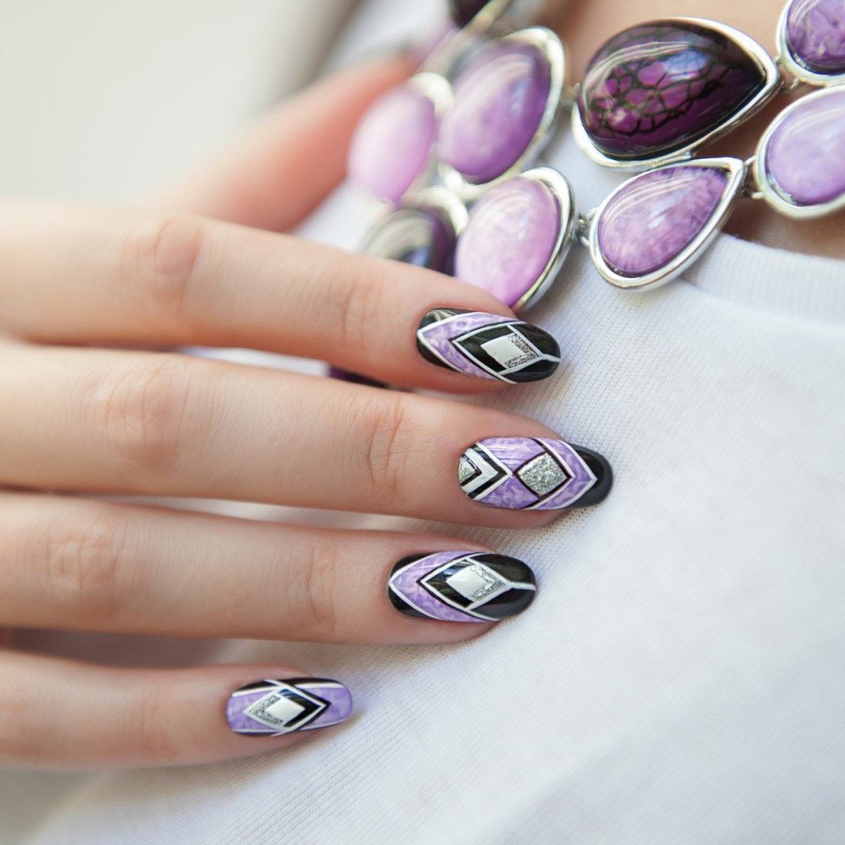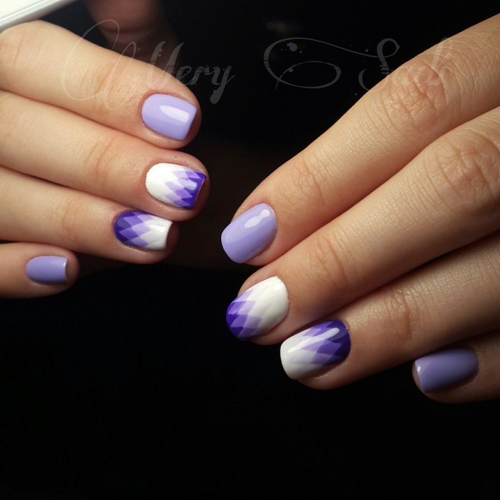 Une manucure en cage ou en patchwork sera très intéressante à regarder en violet. Vous pouvez le dessiner avec un pinceau ou utiliser des pochoirs. De plus, la manucure à carreaux peut être décorée d'étincelles ou de strass.