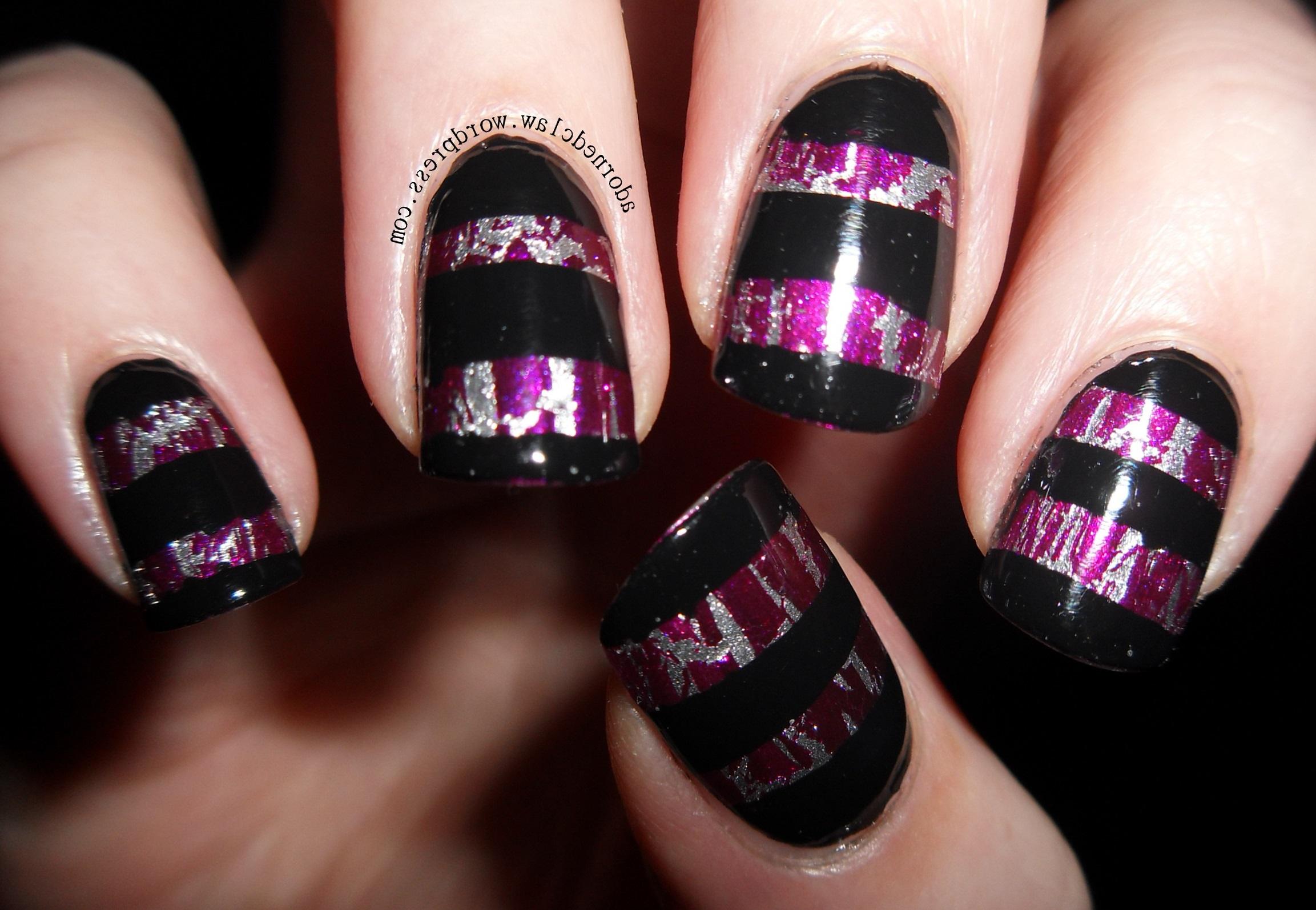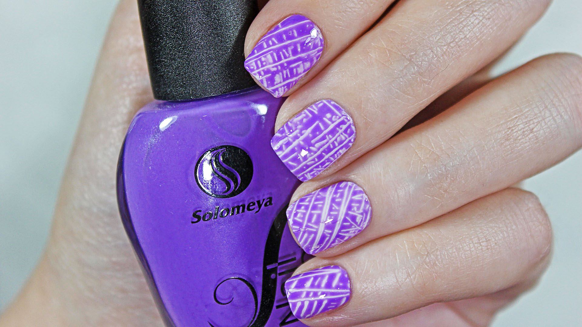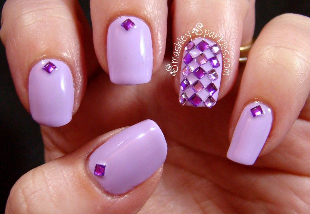 Une manucure en cage ou en patchwork sera très intéressante à regarder en violet. Vous pouvez le dessiner avec un pinceau ou utiliser des pochoirs. De plus, la manucure à carreaux peut être décorée d'étincelles ou de strass.