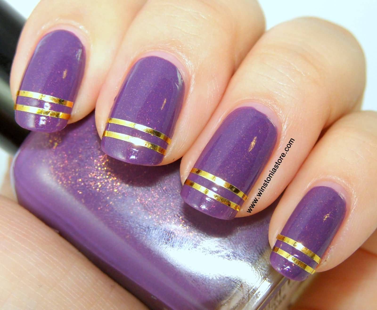 En option, vous pouvez réaliser une manucure à rayures en collant des rayures dorées brillantes sur la base violette. Dans ce cas, les couleurs peuvent être combinées.