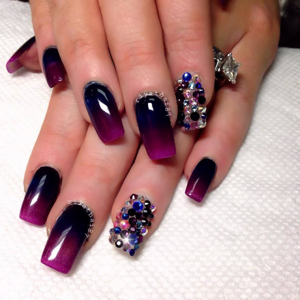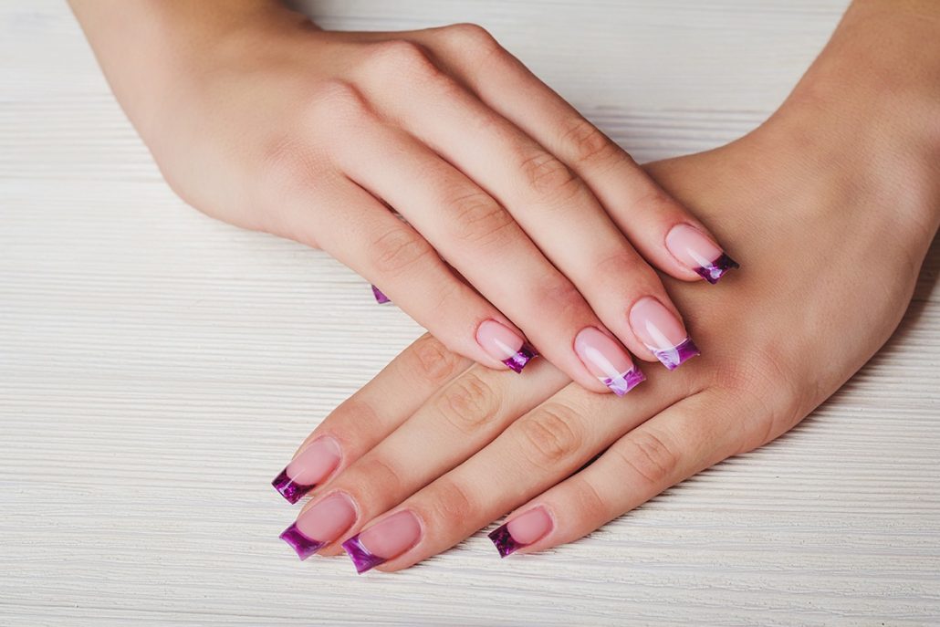 Le violet saturé est idéal pour créer une manucure à gradient. En même temps, il peut être combiné, à la fois avec des tons de couleur similaire et avec des nuances contrastées (noir, blanc, gris, rose, etc.). La transition de couleur peut être horizontale ou verticale.