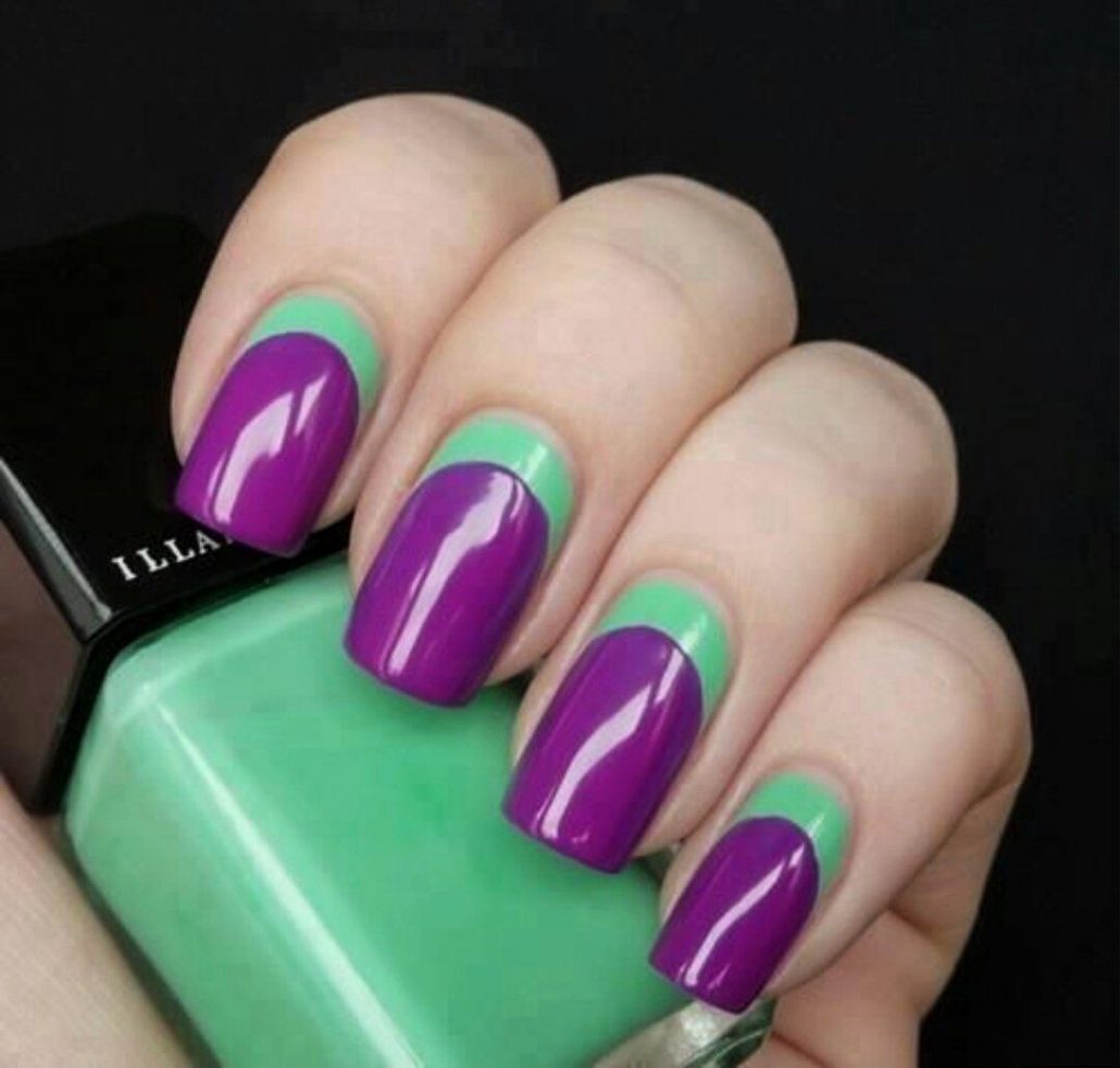 Dans ce cas, le vernis violet peut être utilisé comme vernis principal ou pour dessiner un sourire ou un trou dans les ongles. En outre, la veste violette ou le motif lunaire peuvent être décorés de strass, de timbres, de dessins et d’autres motifs.