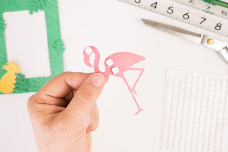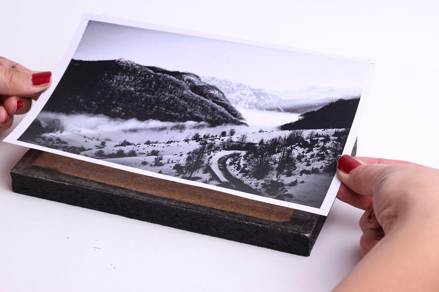 Nous retirons la partie supérieure du ruban adhésif double face et collons la photo au centre.