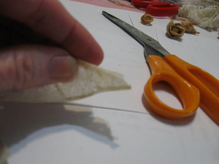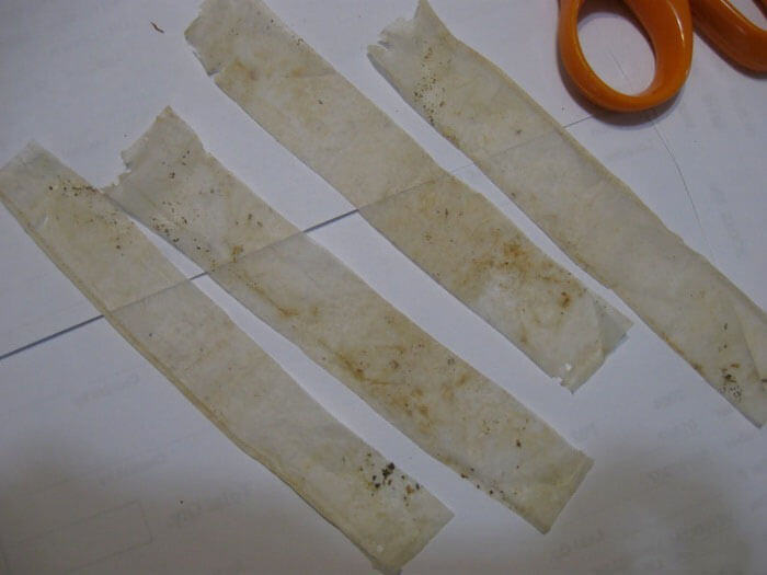 Pour faire de telles roses, prenez un sac déjà utilisé et coupez-le. Nous sortons toutes les feuilles de thé et divisons le sac en lanières, comme sur la photo.
