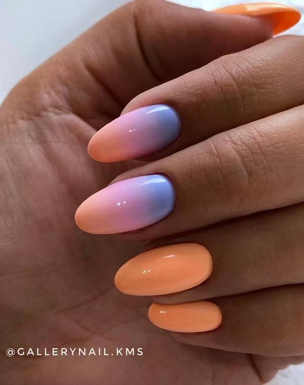 L’idée même de manucure dans le style ombré exprime le sens de la combinaison correcte du schéma de couleurs du revêtement de vernis. Les transitions douces des nuances peuvent transformer les ongles féminins en une véritable œuvre d'art. Malgré tout, les maîtres de manucure utilisent dans certains cas plusieurs nuances de couleur, en les appliquant avec des lignes simples et rugueuses. C'est-à-dire qu'elles privent la manucure féminine de transitions en douceur. Ce type de décoration des doigts féminins a fière allure sur une longue plaque d’ongle. Les ongles courts doivent être décorés avec une veste française ombrée dans des tons calmes et légers. Les représentants de la belle moitié de l’humanité qui ont des ongles assez longs peuvent décorer leur manucure avec des combinaisons de plusieurs couleurs vives. Par exemple, les tons bleu, vert et orange. Ce style de débordement de nuances pourra donner de l'originalité et de l'originalité à l'image de la femme. Il sera également en mesure de montrer au monde extérieur que la jeune fille est assez confiante et prête à des actes extraordinaires. Des transitions de tons brillants de vernis peuvent être utilisées pour des vacances à la plage.