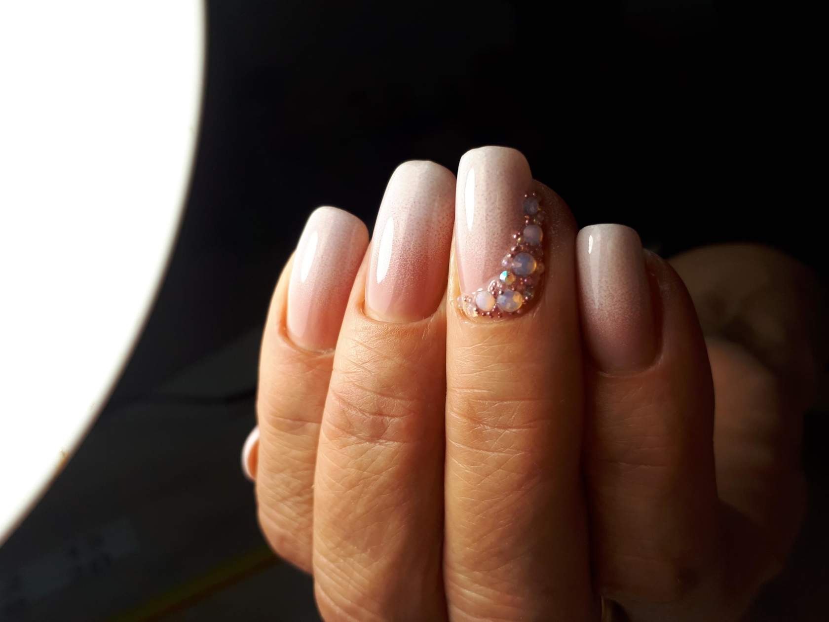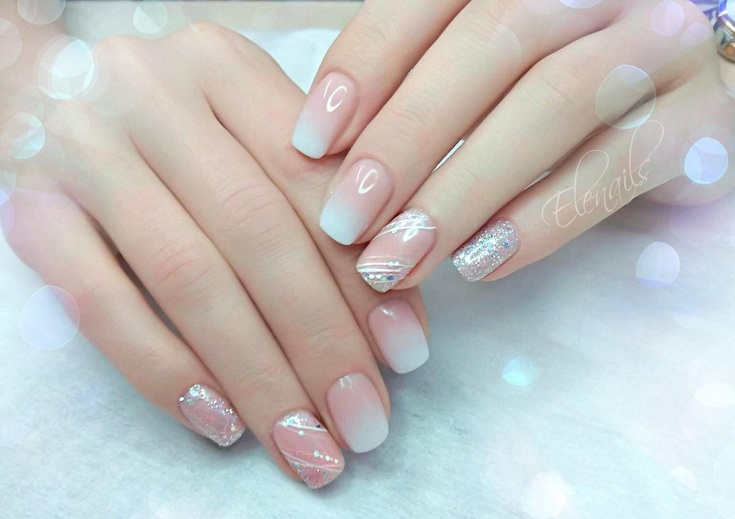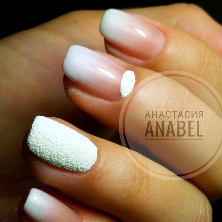 Pour effectuer ce type de manucure, de nombreux appareils ne seront pas nécessaires. Dans l’ensemble, il faut des vernis aux teintes souhaitées, une base, une éponge en caoutchouc mousse ou une brosse spéciale. Ombre est souvent composé de deux, voire de trois couleurs. La chose la plus importante est que les nuances soient combinées les unes aux autres, sinon l'idée du maître peut être gâchée. Pour une version plus simplifiée, vous aurez besoin d'un blanc et d'un ton de lit du revêtement de vernis. Le ton du lit mettra l'accent sur le sourire de la veste. Tout d'abord, la plaque à ongles doit être recouverte d'une base et séchée dans une lampe à ultraviolets. Appliquez ensuite le fond principal de la manucure. Après cela, il vaut la peine de commencer à appliquer la deuxième teinte. Cela nécessitera une éponge en mousse. La principale chose à considérer est que la mousse doit avoir une structure dense. Appliquez donc une couche grasse de la nuance souhaitée sur l’éponge et tamponnez l’ongle avec du vernis par légers mouvements. Dans la zone de transition des nuances, il vaut la peine d'appliquer une éponge aussi faiblement que possible. Cela donnera de la douceur dans les transitions des nuances.