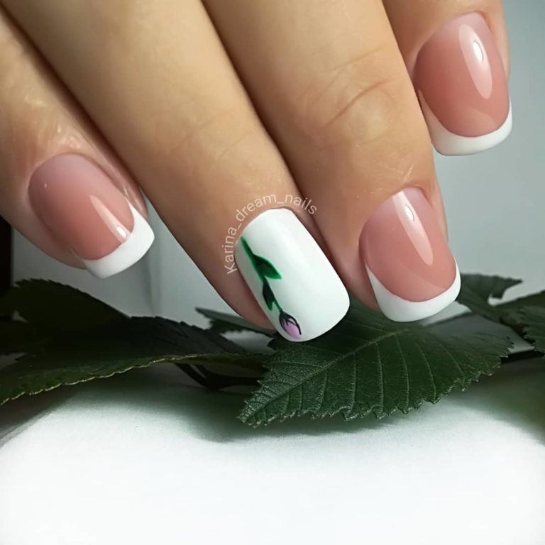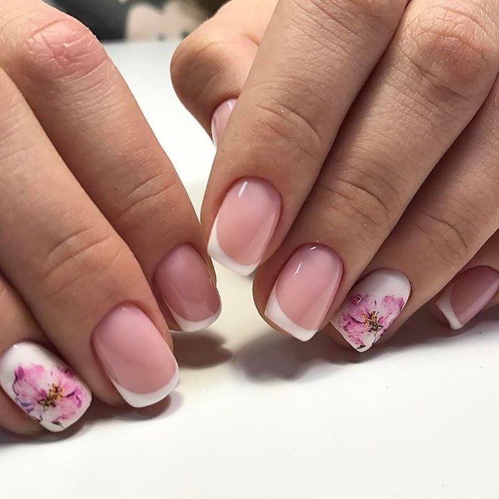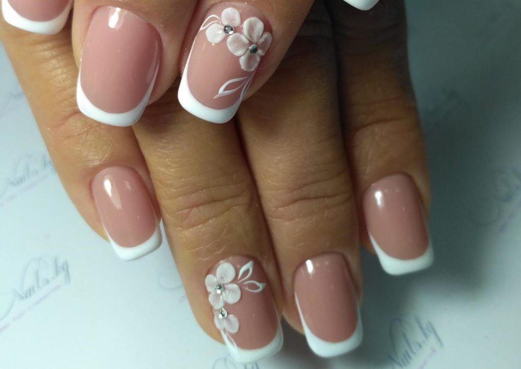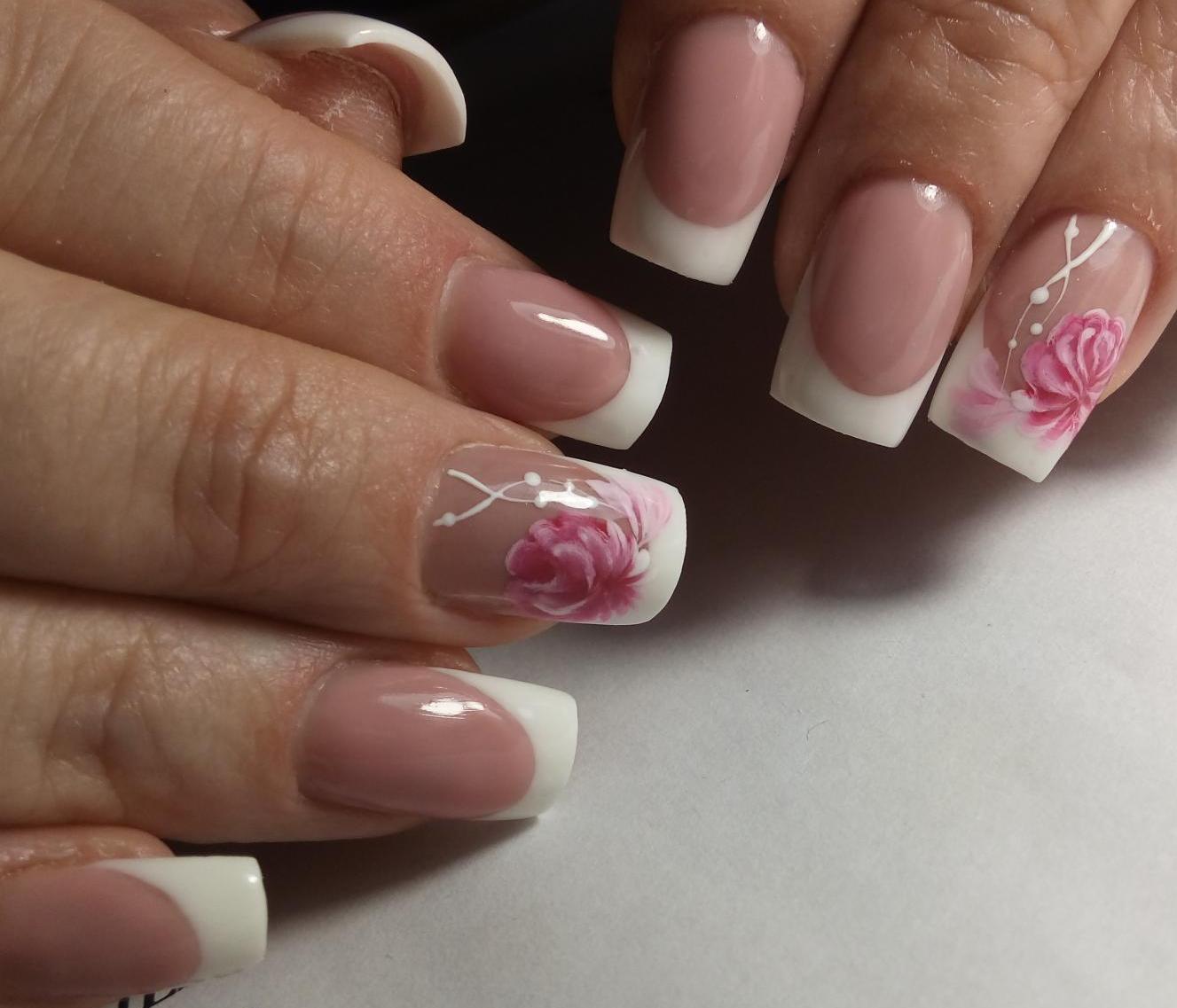 Un trait distinctif de la manucure française est la ligne de sourire. C’est elle qui sert de cadre à la femme souci. Pour remplir la veste, il n'est pas nécessaire d'avoir de longs ongles. La plupart des soucis ont une forme carrée et nette. Beaucoup pensent que la veste sur les ongles courts ne peut pas être complétée par un décor en forme de fleurs, mais tel n'est pas le cas. Il est préférable d'effectuer de petites fleurs ou des boutons, puis la manucure sera belle et sophistiquée. Vous pouvez faire de belles fleurs sur un ou plusieurs doigts au lieu d’une ligne de sourire ou recouvrir l’intégralité de la plaque à ongles de motifs floraux.