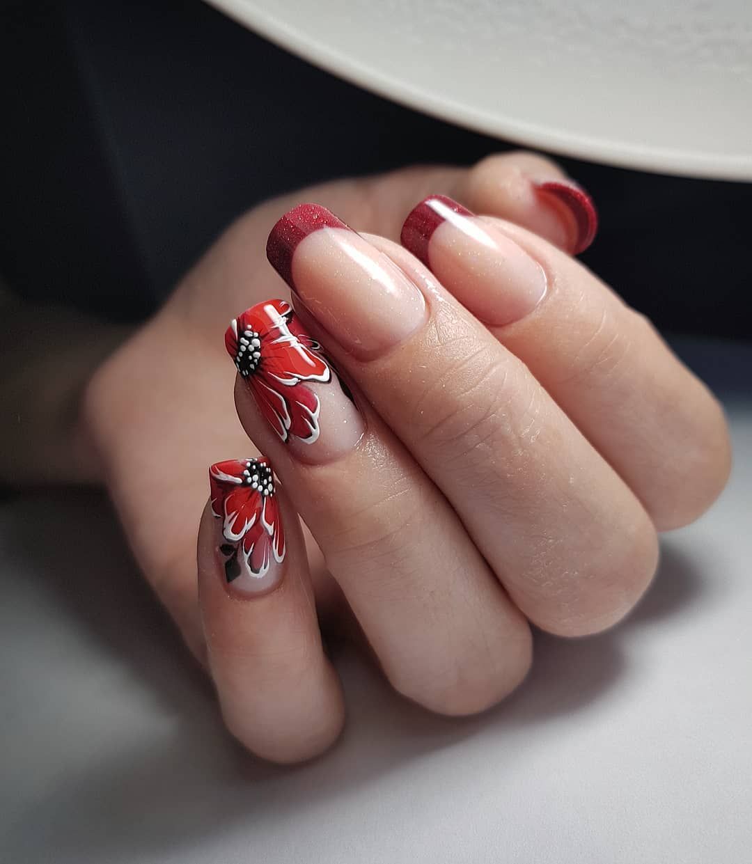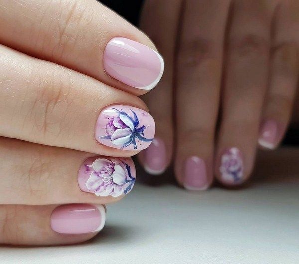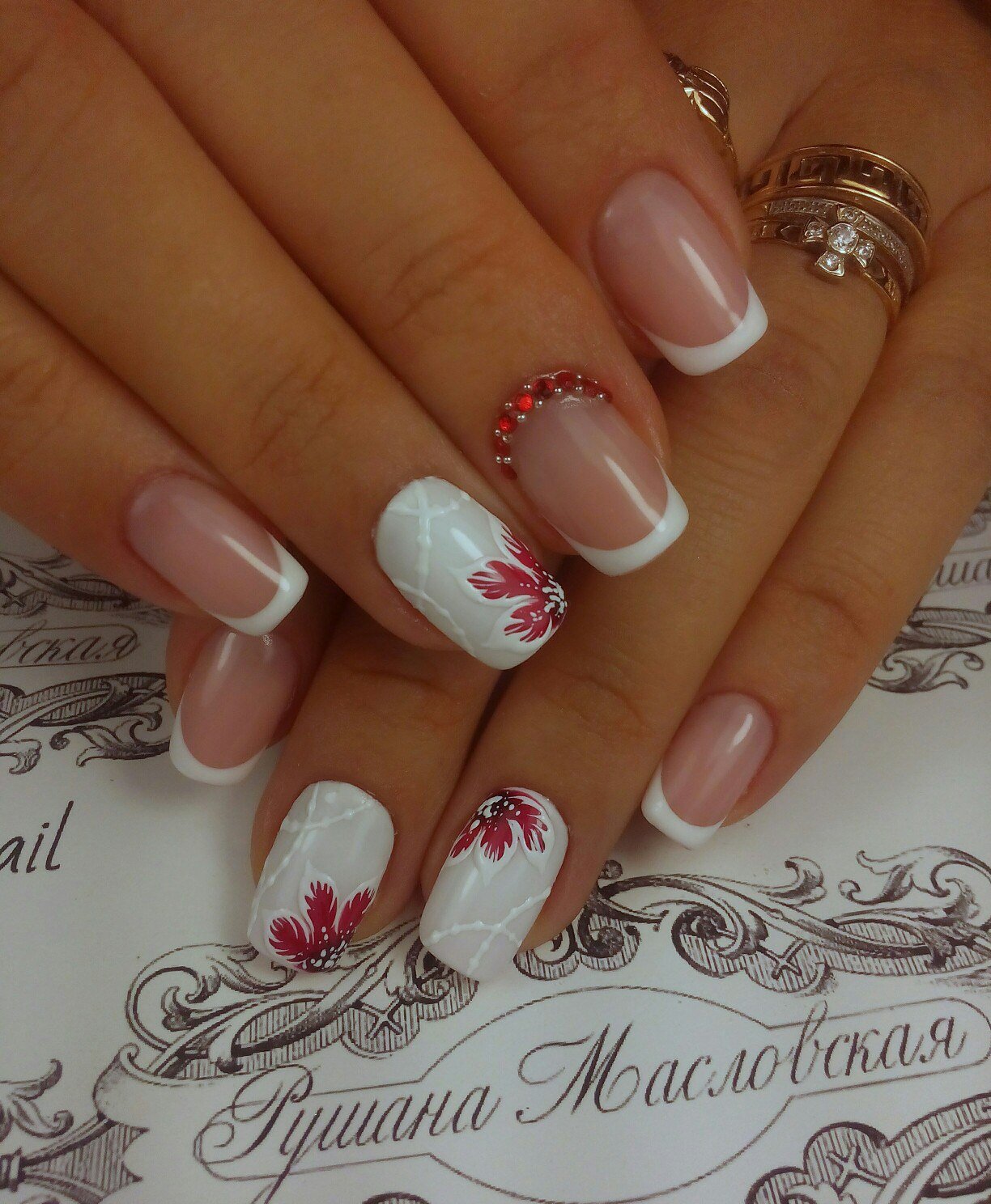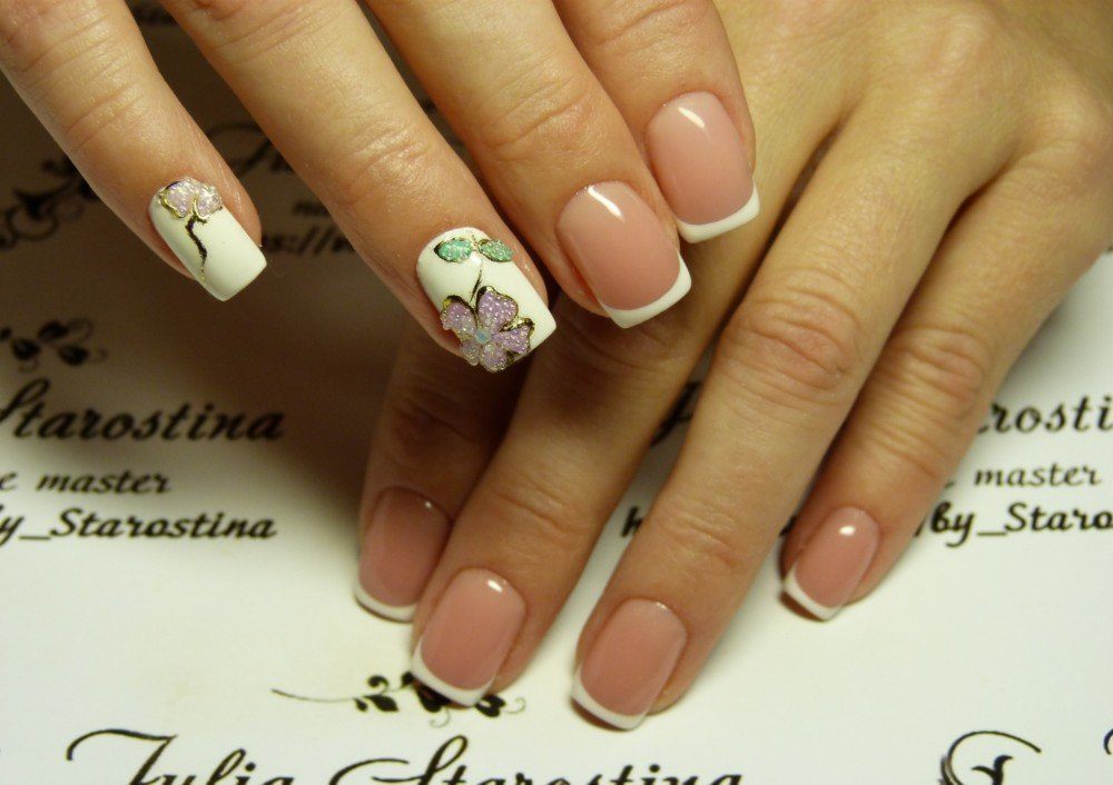 Un trait distinctif de la manucure française est la ligne de sourire. C’est elle qui sert de cadre à la femme souci. Pour remplir la veste, il n'est pas nécessaire d'avoir de longs ongles. La plupart des soucis ont une forme carrée et nette. Beaucoup pensent que la veste sur les ongles courts ne peut pas être complétée par un décor en forme de fleurs, mais tel n'est pas le cas. Il est préférable d'effectuer de petites fleurs ou des boutons, puis la manucure sera belle et sophistiquée. Vous pouvez faire de belles fleurs sur un ou plusieurs doigts au lieu d’une ligne de sourire ou recouvrir l’intégralité de la plaque à ongles de motifs floraux.
