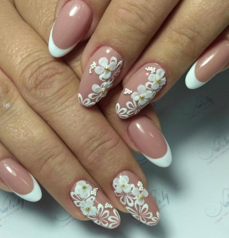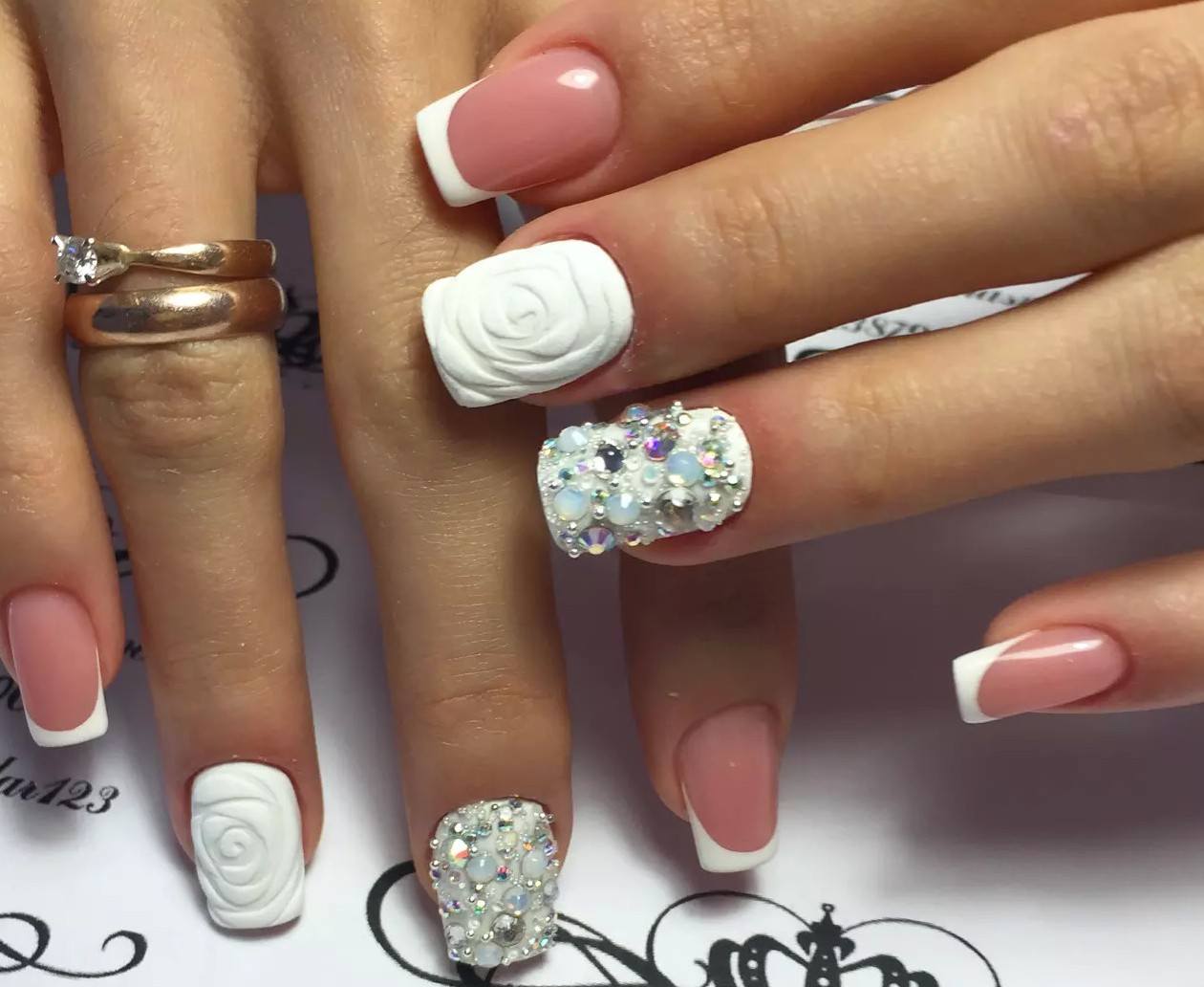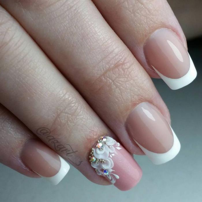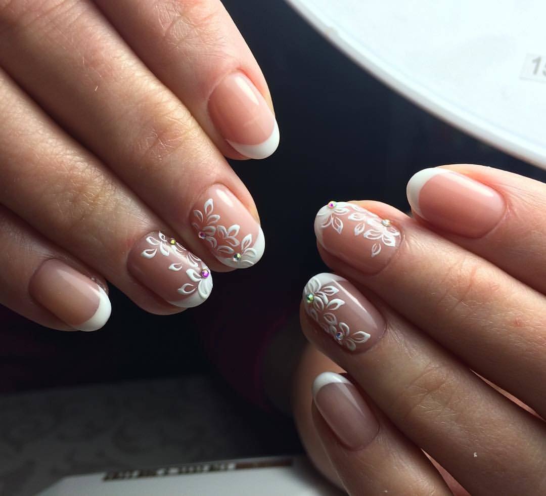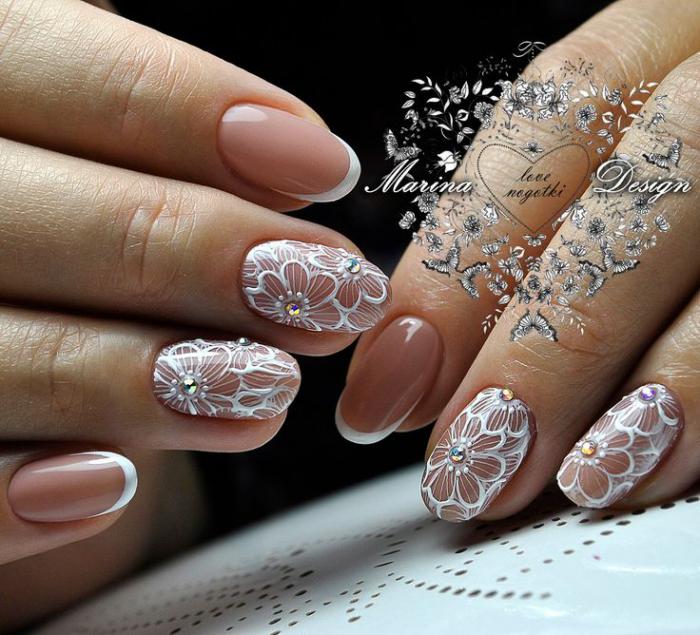 Pour chaque fille, l'événement le plus important est un mariage. C’est la raison pour laquelle chaque épouse essaie de rendre son image luxueuse et irrésistible, car cette journée reste dans sa mémoire. Un rôle important pour un tel événement est donné à la manucure. La plupart des maîtres offrent aux filles une veste belle et délicate pour créer un nail art de mariage. Une conception aussi modeste se transforme en une manucure de fête avec un décor en forme de fleurs. De délicats pétales de boutons ornent les ongles, ajoutent de la tendresse et de la romance à l'image globale. Le plus souvent, une manucure à la française avec des fleurs se fait en finition pastel ou blanche. Pour la décoration, vous pouvez appliquer du modelage, des bouillons, des strass et tout autre élément.