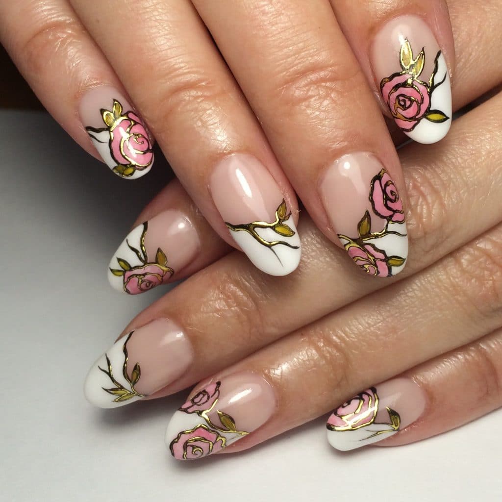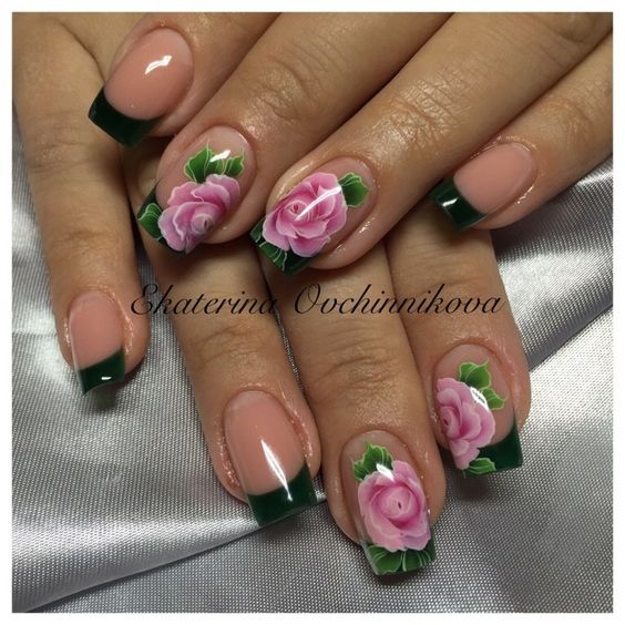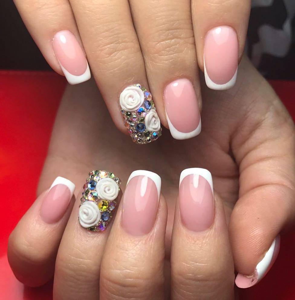 Les roses sont toujours les plus recherchées pour la manucure. Les fleurs royales apporteront une grâce et un charme français modérés. Manucure française avec des roses a un grand nombre d'options. Les bourgeons peuvent être fabriqués de différentes manières - en utilisant des autocollants, des peintures murales, des estampages et autres techniques. Un bouton de rose magnifique recouvert de poudre acrylique est très impressionnant. Cela donnera à la fleur un aspect velouté et sophistiqué.