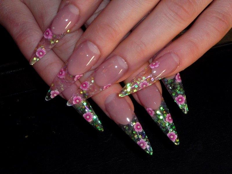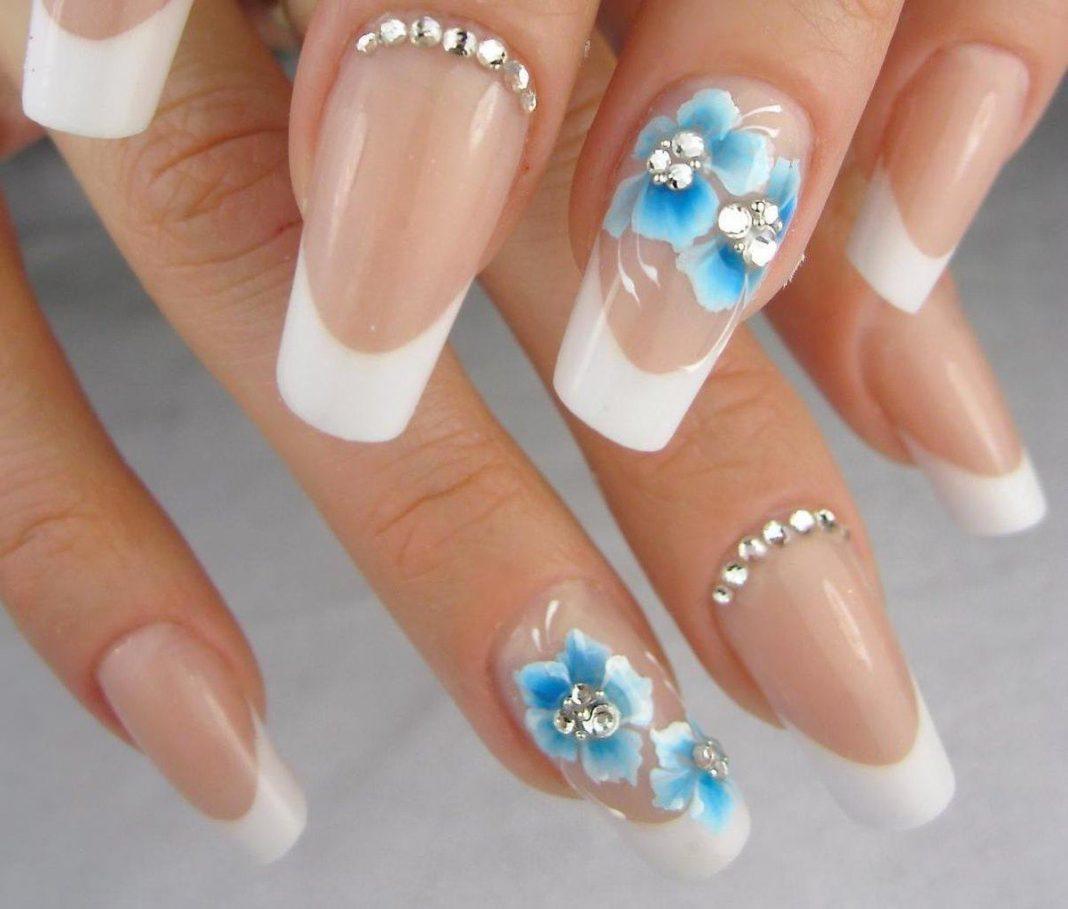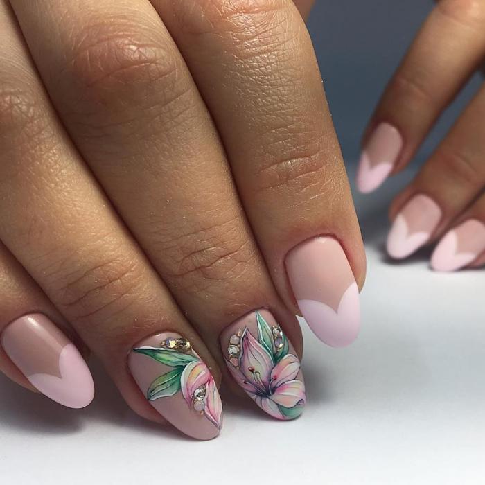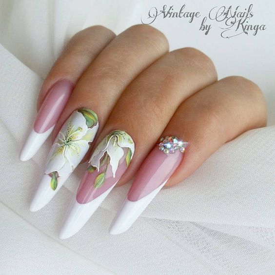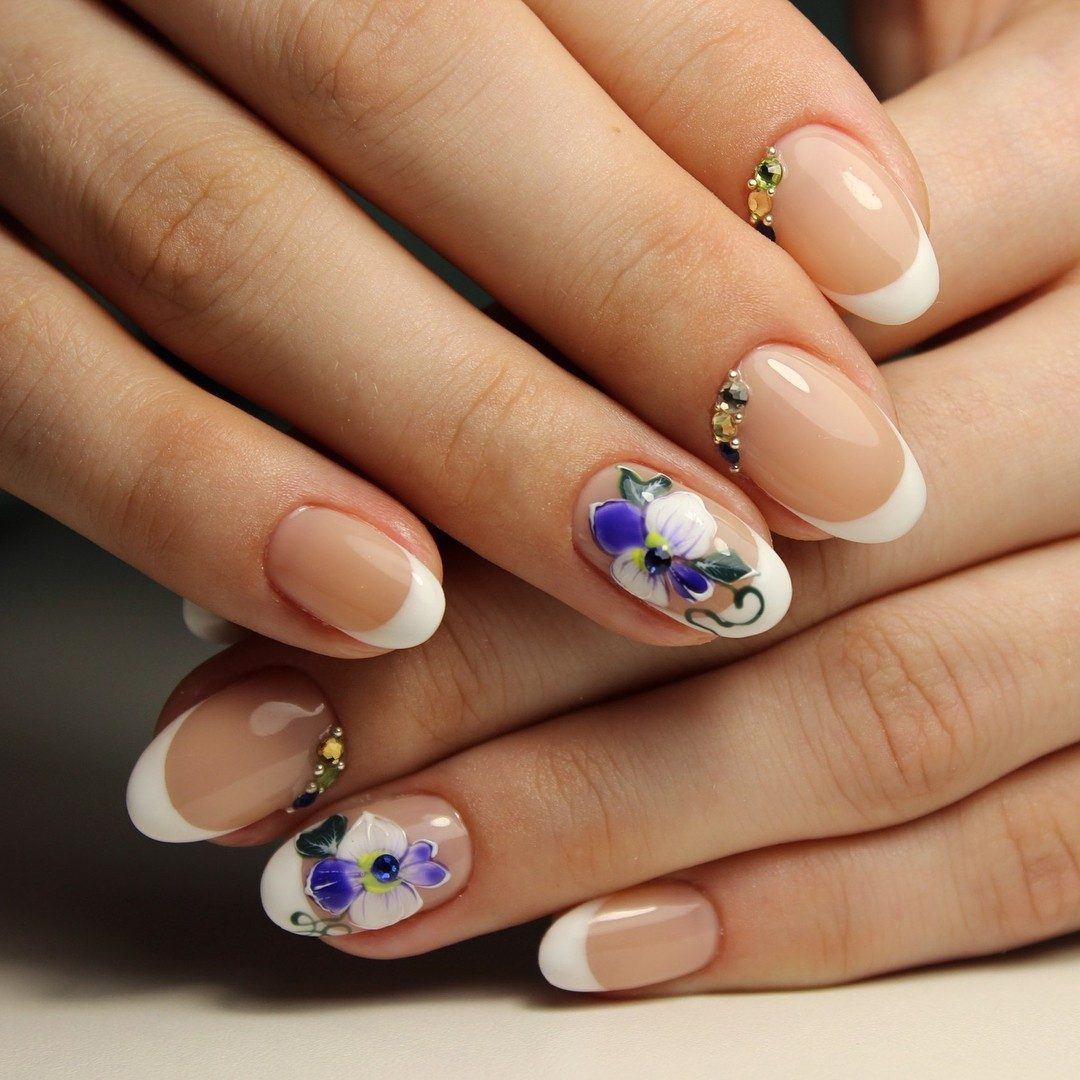 Les ongles longs permettent aux femmes de la mode de réaliser tous leurs rêves en matière de design. C'est la manucure française en combinaison avec des motifs floraux qui créent un tandem magnifique et enchanteur. À l’aide de fleurs, vous pouvez décorer la ligne du sourire ou la partie principale de la plaque à ongles, tout en laissant le sourire blanc. Sur les ongles longs, les fleurs de différentes tailles sont très jolies, ainsi que la combinaison de petits et gros boutons.
