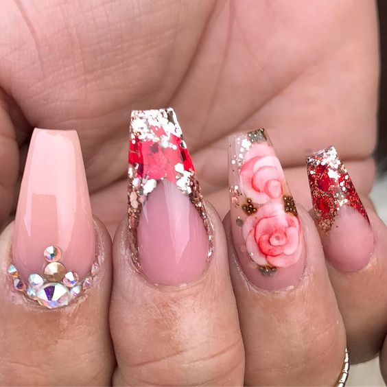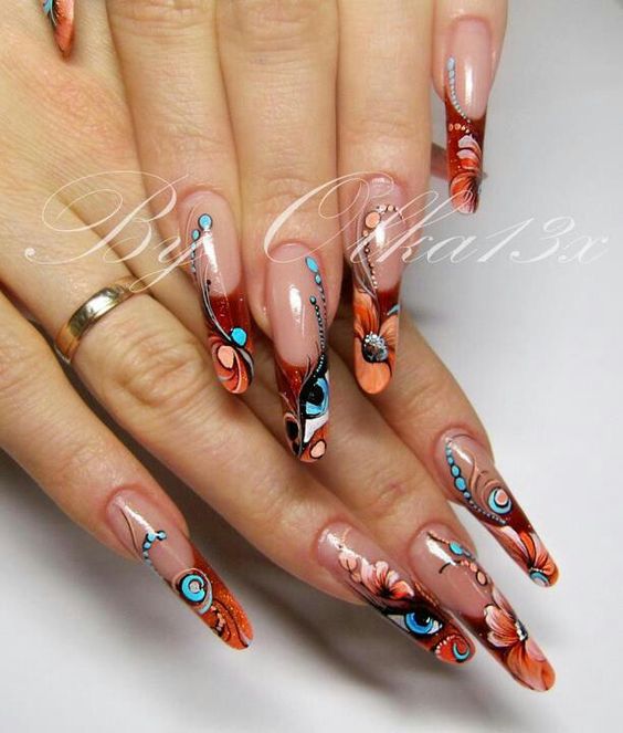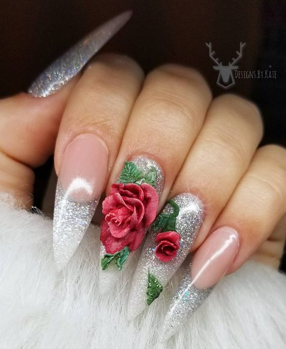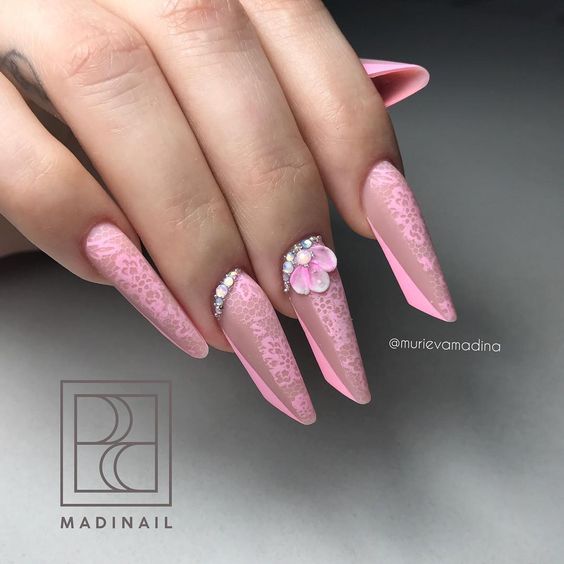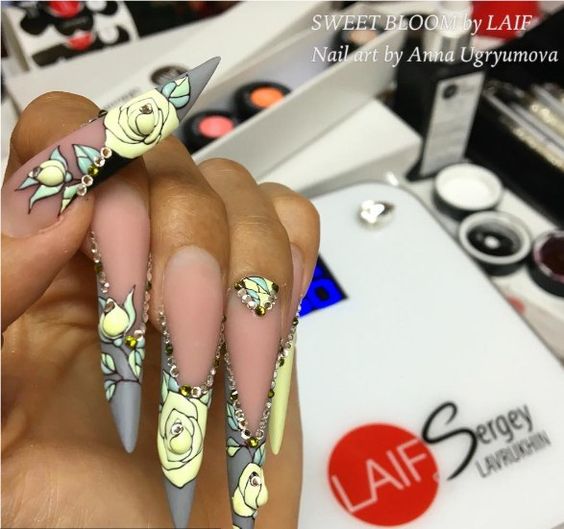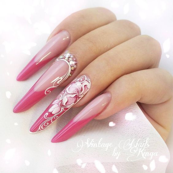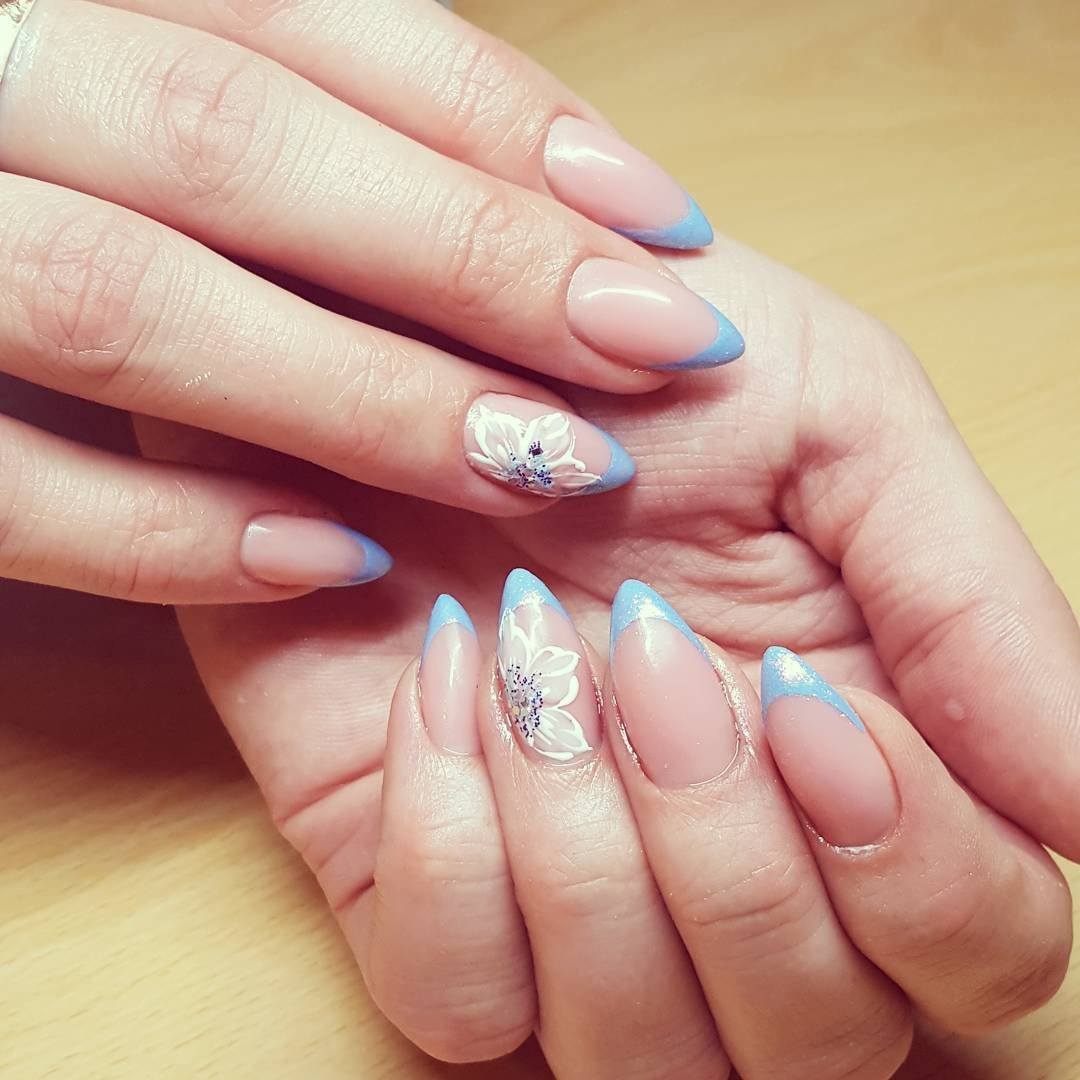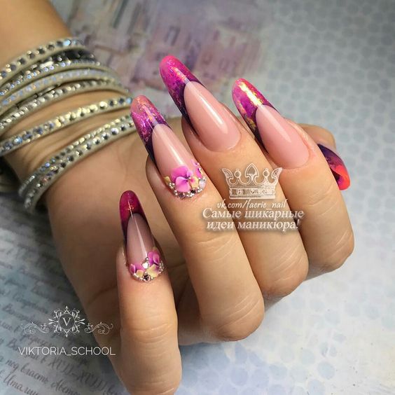 Les ongles longs permettent aux femmes de la mode de réaliser tous leurs rêves en matière de design. C'est la manucure française en combinaison avec des motifs floraux qui créent un tandem magnifique et enchanteur. À l’aide de fleurs, vous pouvez décorer la ligne du sourire ou la partie principale de la plaque à ongles, tout en laissant le sourire blanc. Sur les ongles longs, les fleurs de différentes tailles sont très jolies, ainsi que la combinaison de petits et gros boutons.
