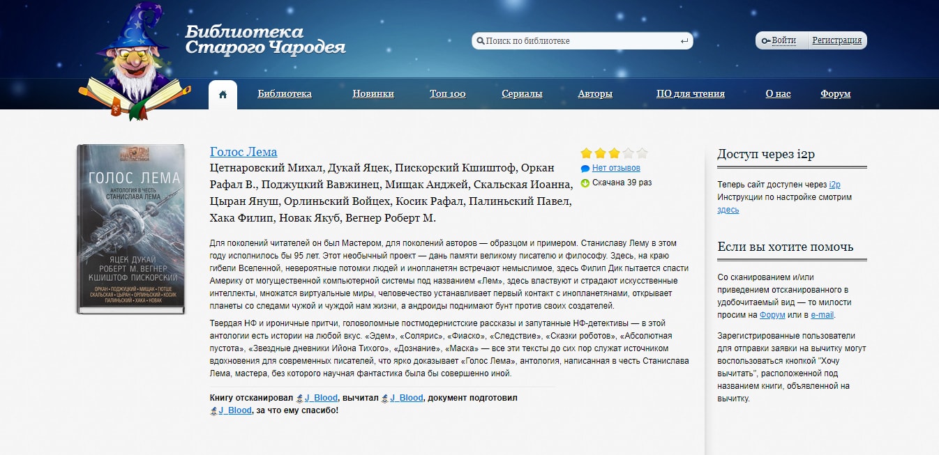 Un projet original et plutôt inhabituel appelé "La bibliothèque de l'ancien assistant" propose de télécharger de nombreux livres gratuits.Cependant, ils sont tous dans le genre de la science fiction ou de la fantasy. Par conséquent, pour tous ceux qui aiment ces œuvres, ce site est parfait. La seule chose à faire est de vous inscrire. De plus, si vous le souhaitez, vous pouvez participer à l’extension de la bibliothèque et lire des textes ou corriger des erreurs.