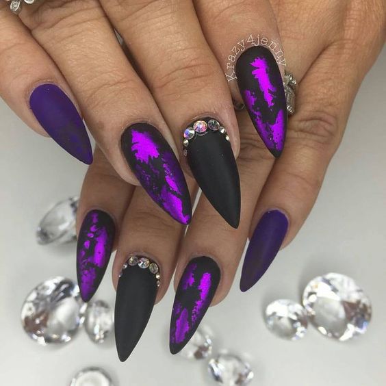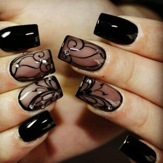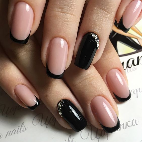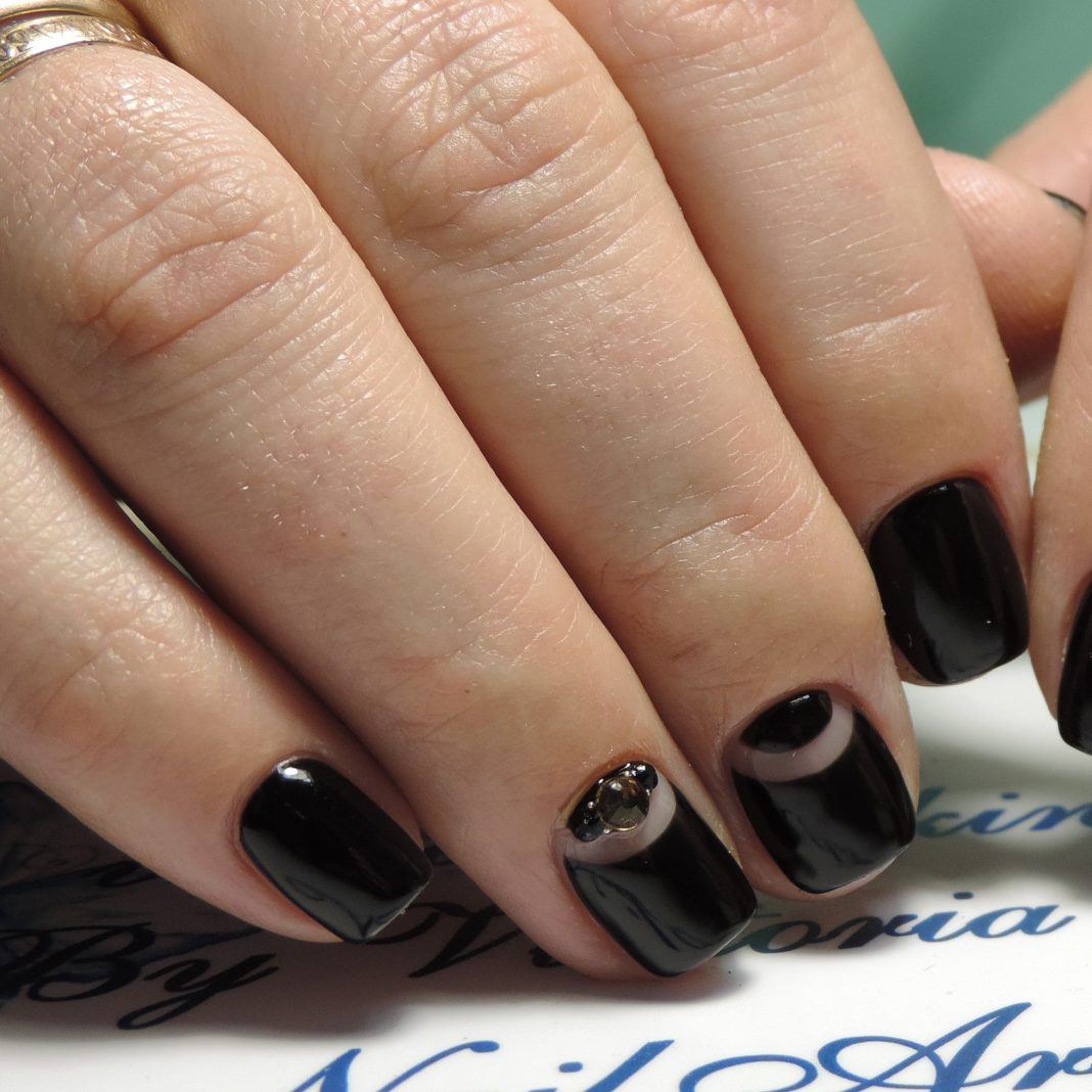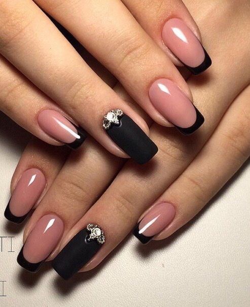 Pour les représentants de la belle moitié de l’humanité qui en ont marre du revêtement classique de vernis noir monophonique, les stylistes suggèrent de changer la forme de l’ongle ou de choisir le noir avec une teinte bleue, bordeaux ou verte. Et encore plus spectaculaire, une telle manucure se penchera sur les pierres et les strass. Avec une telle manucure, il n’est pas du tout gênant de sortir. 100% des autres se feront un plaisir de regarder les mains avec une manucure noire.