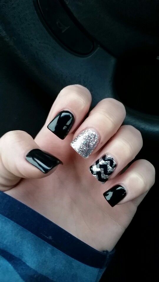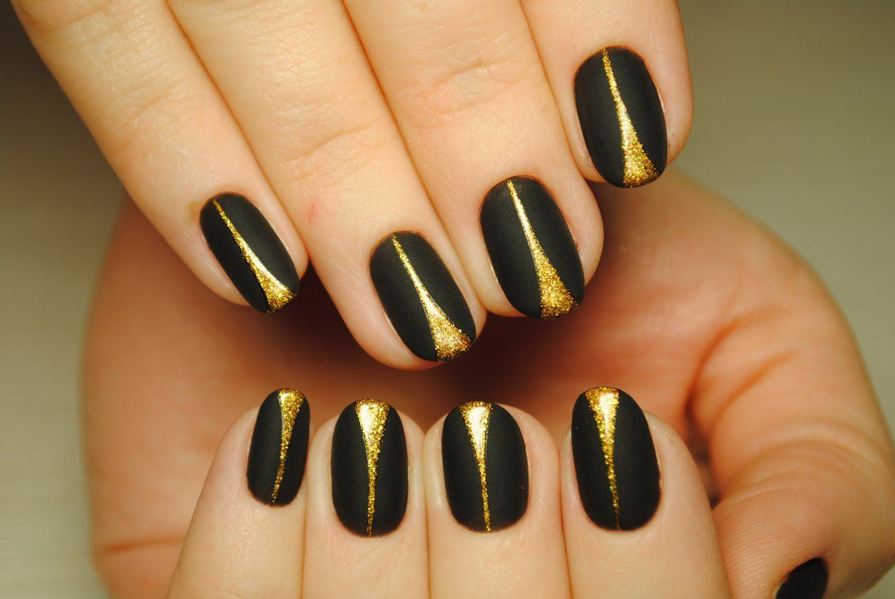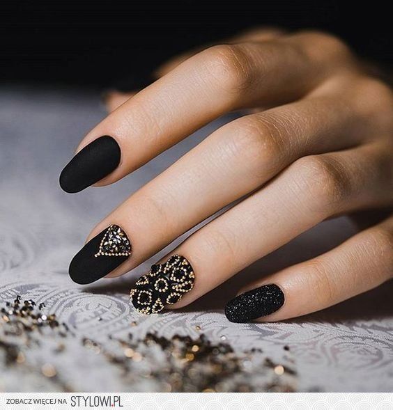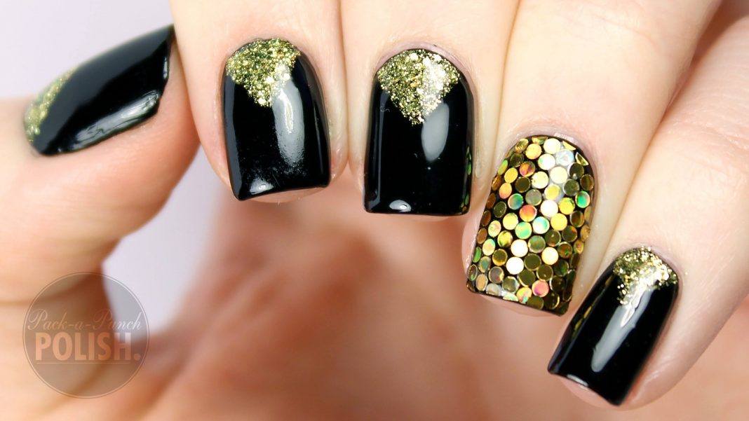 Le luxe des nuances précieuses sur un fond noir semble incroyable. Des paillettes holographiques argentées et dorées, des fils, du scotch, du papier d'aluminium et d'autres pièces brillantes de décorations pour les ongles sont souvent utilisées pour créer un look spectaculaire en soirée. Les éléments de décoration brillants diluent merveilleusement le dessin des ongles noir nuit. Les fantasmes sont infinis. Des ornements graphiques brillants sont appliqués sous la forme de lignes chaotiques, de formes géométriques, de motifs dispersés. La couche de base doit être monophonique, comme la couleur de la suie, sinon les étincelles risquent de se perdre dans le dessin.